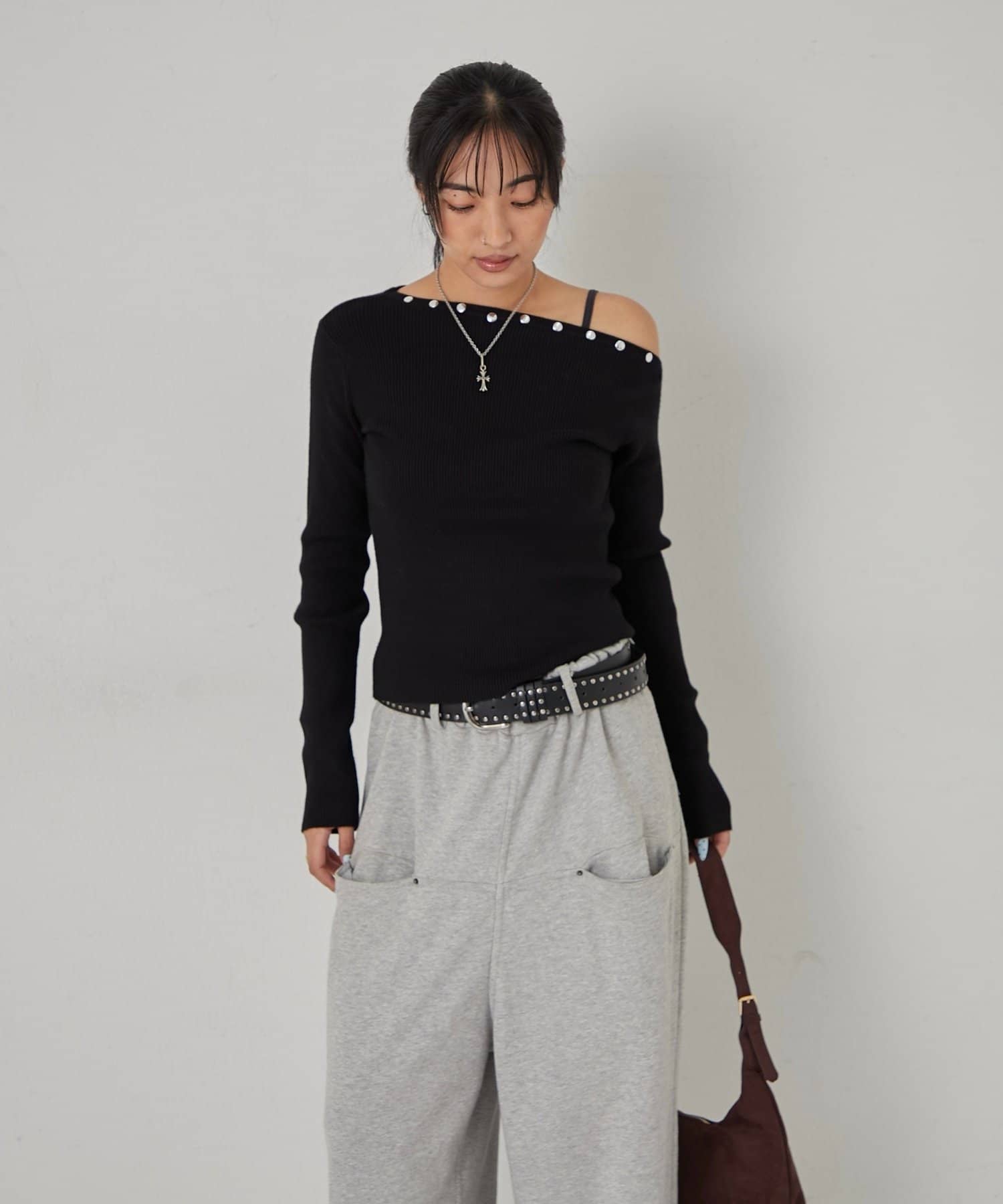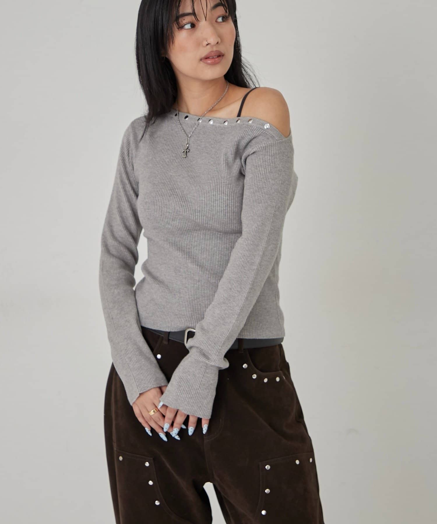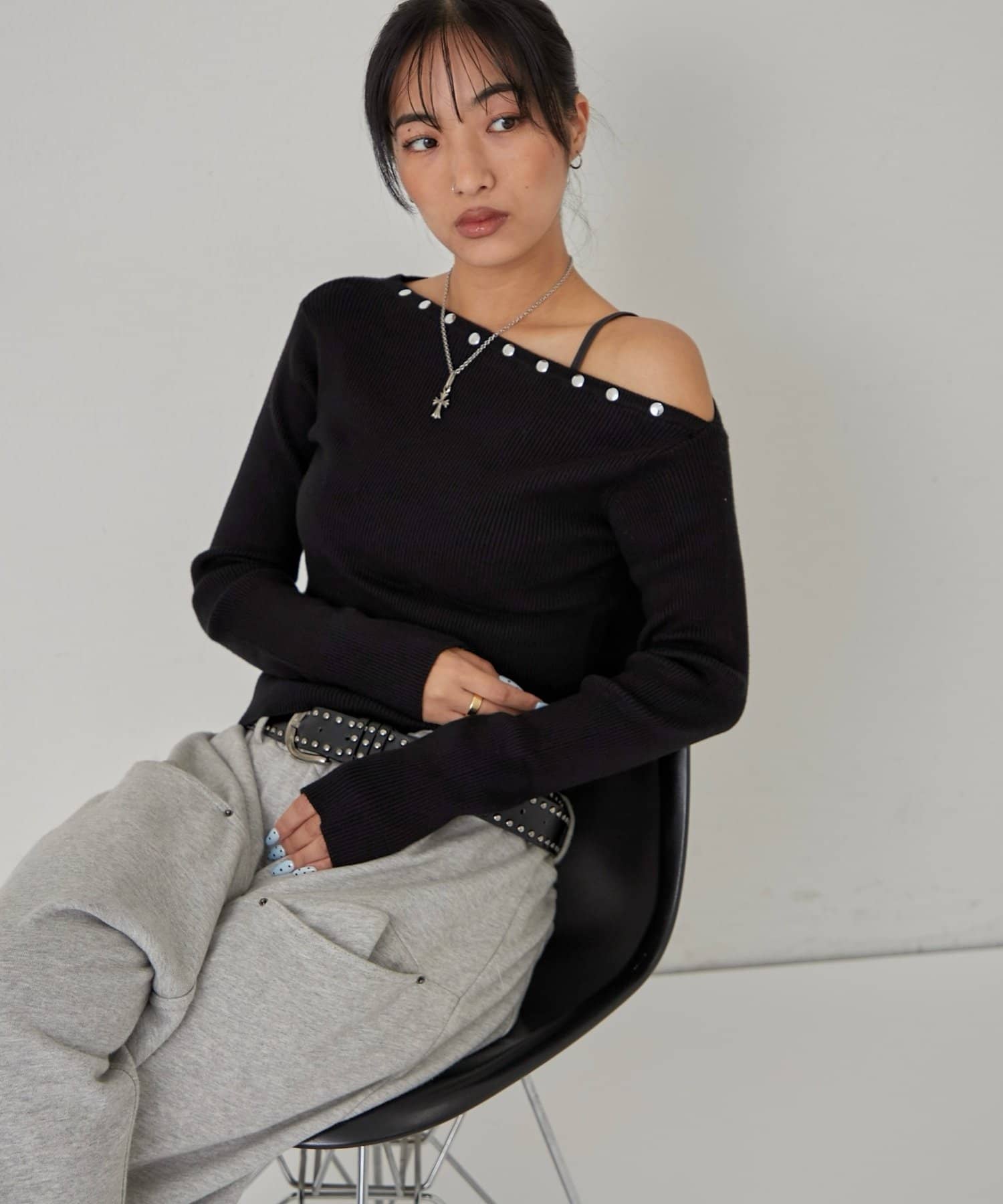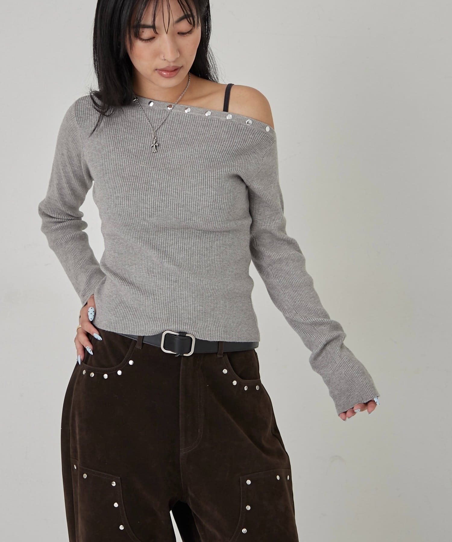 ・首元のスタッズのカッコよさと、ワンショルダーのニットで女性らしさも兼ね備えたトップス。