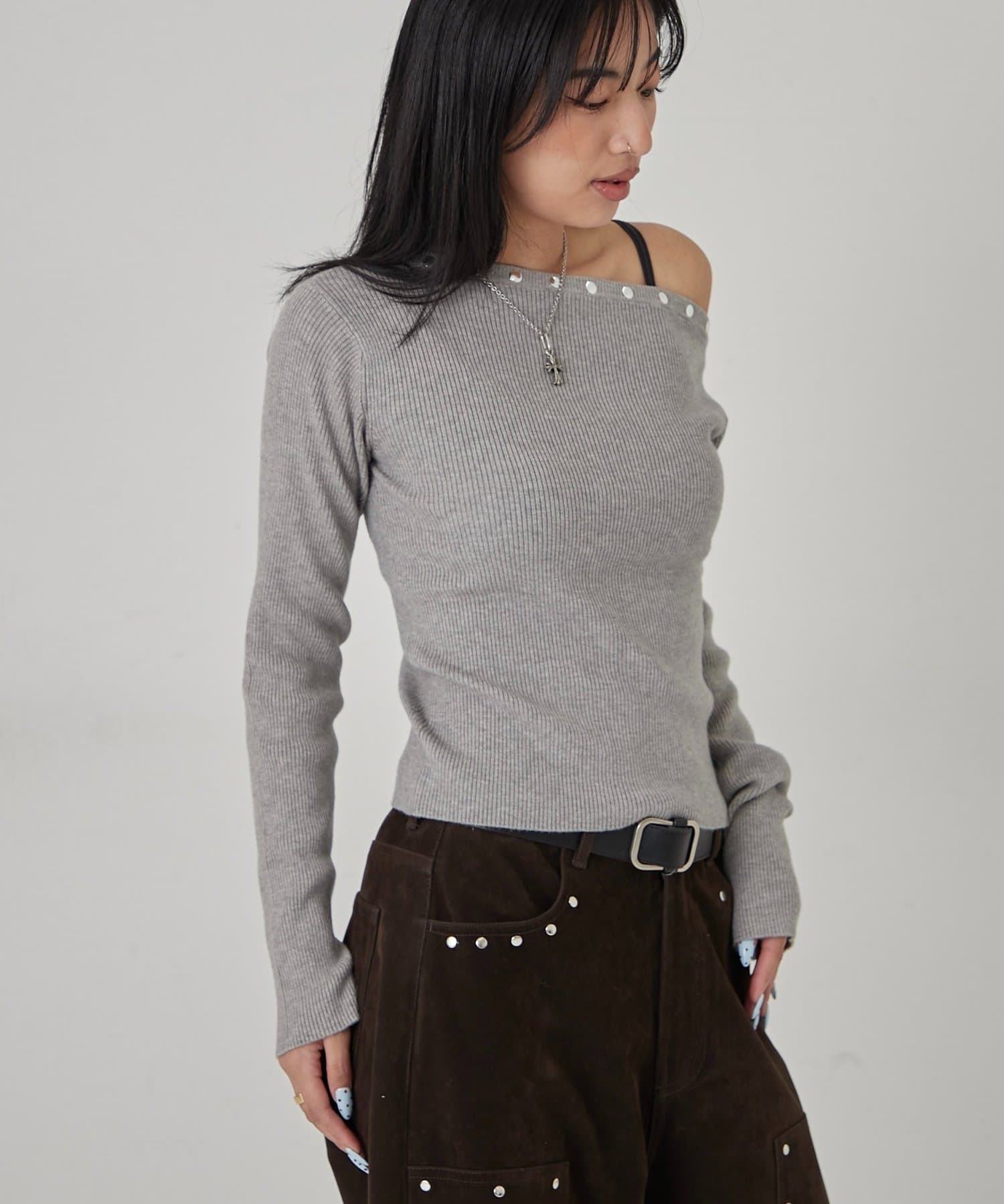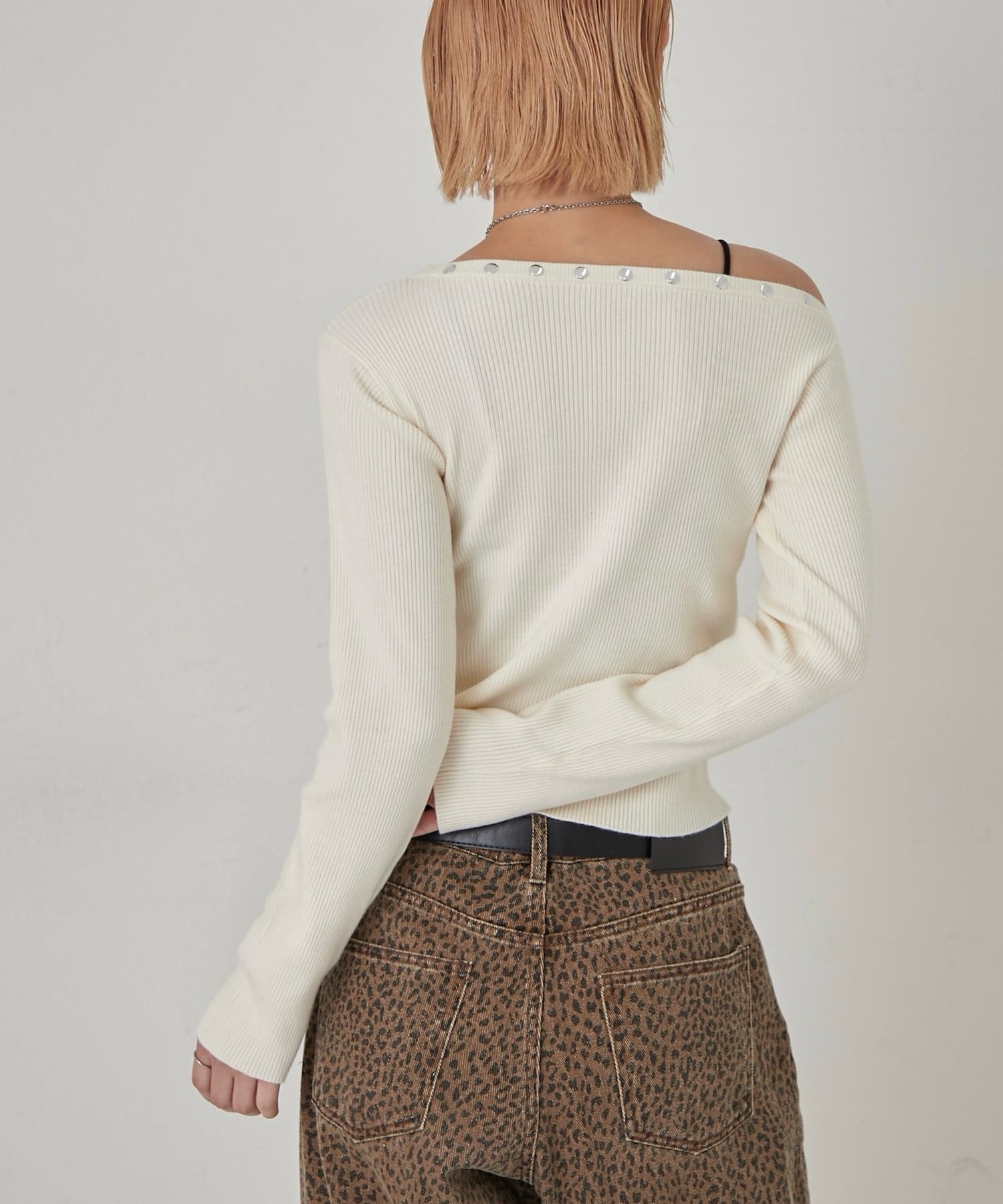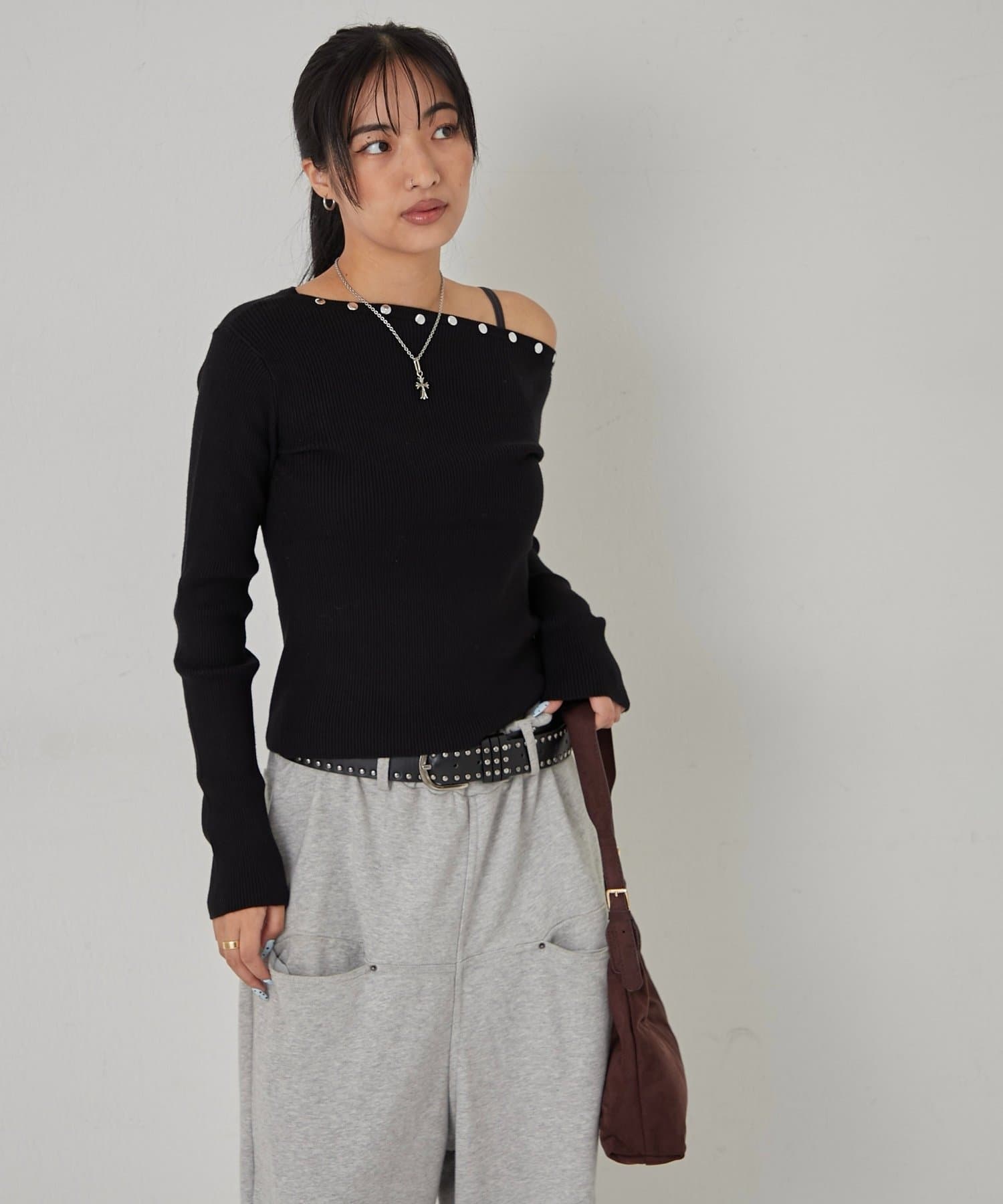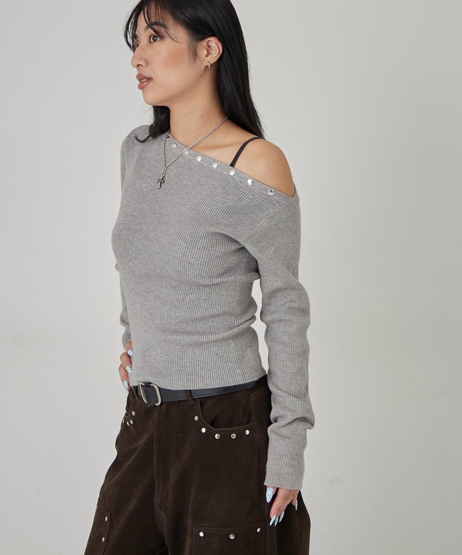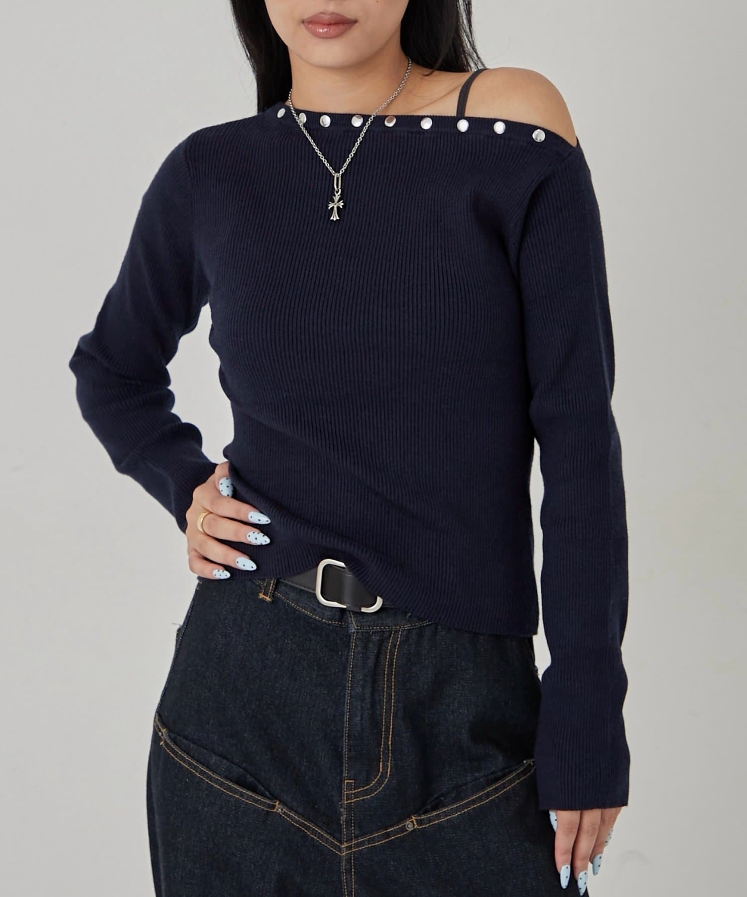 ・首元のスタッズのカッコよさと、ワンショルダーのニットで女性らしさも兼ね備えたトップス。