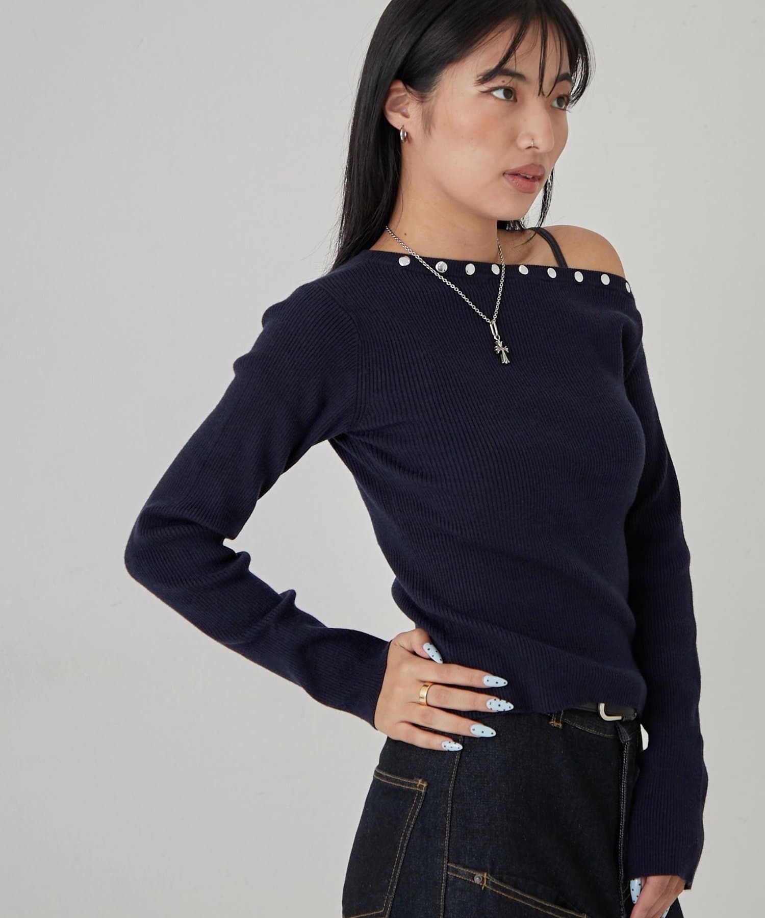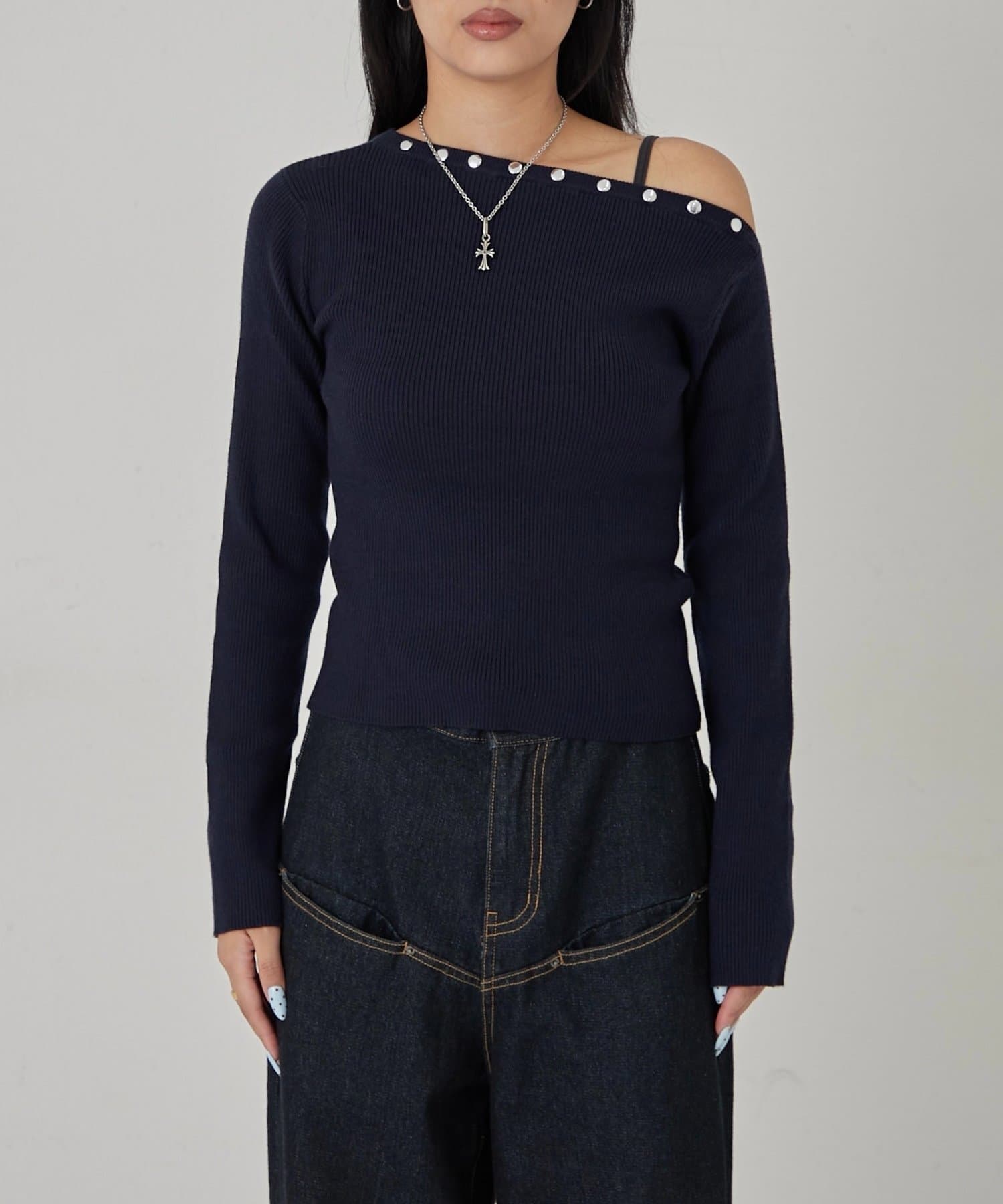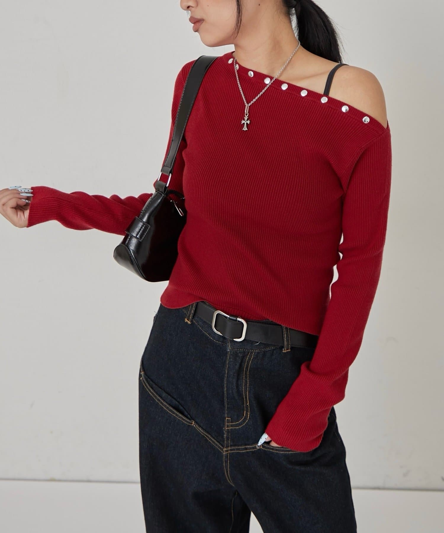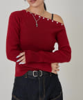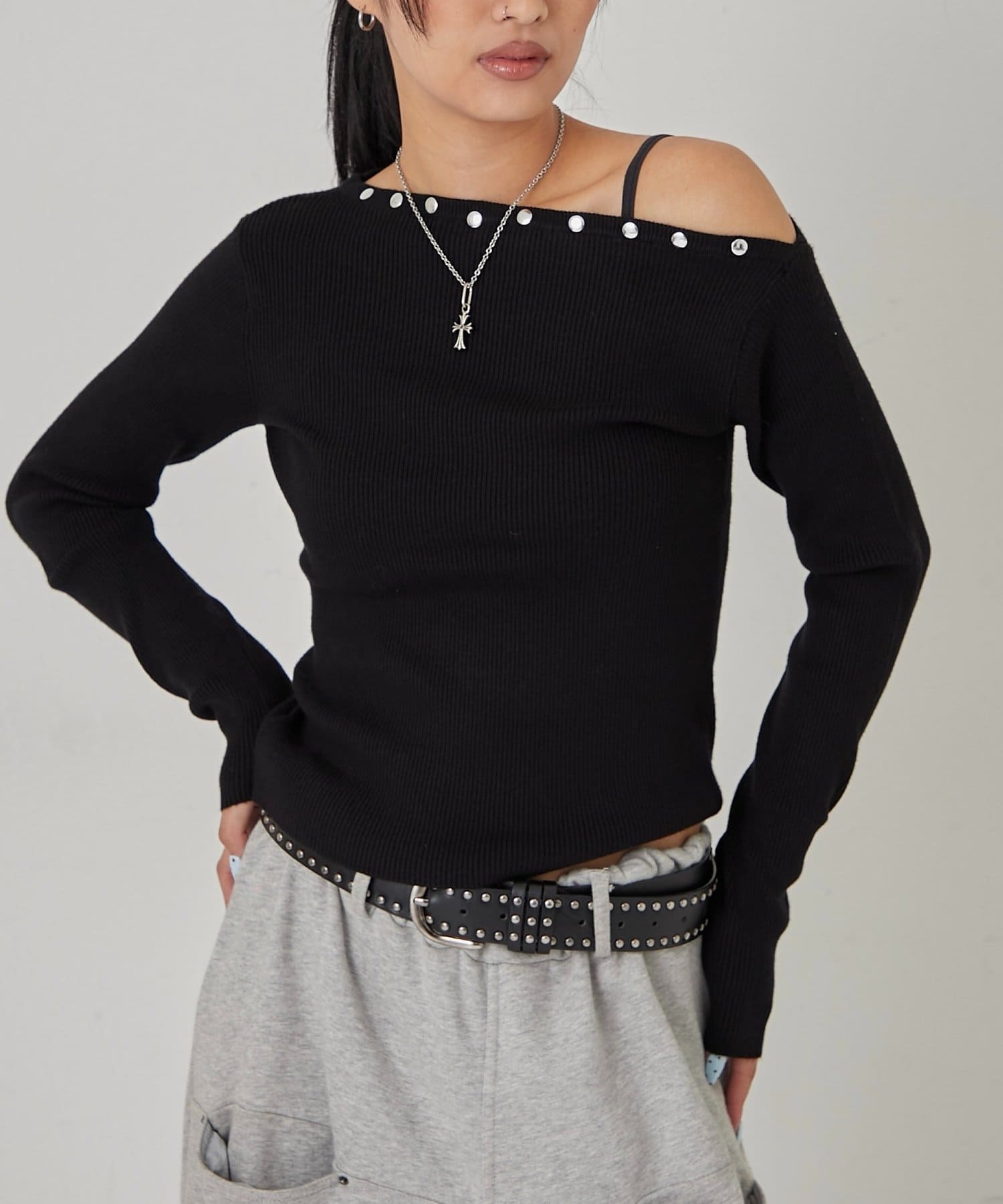 ・首元のスタッズのカッコよさと、ワンショルダーのニットで女性らしさも兼ね備えたトップス。