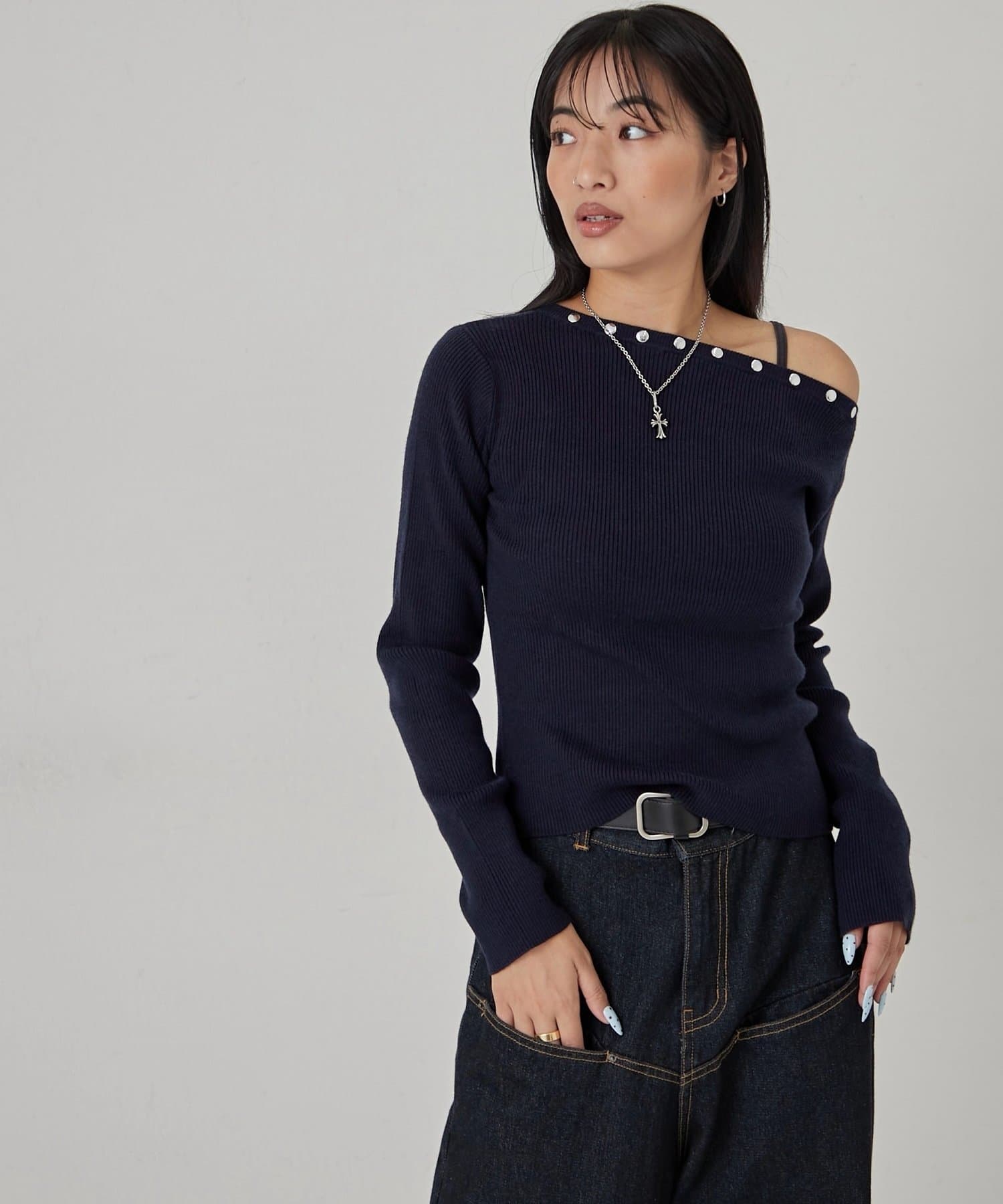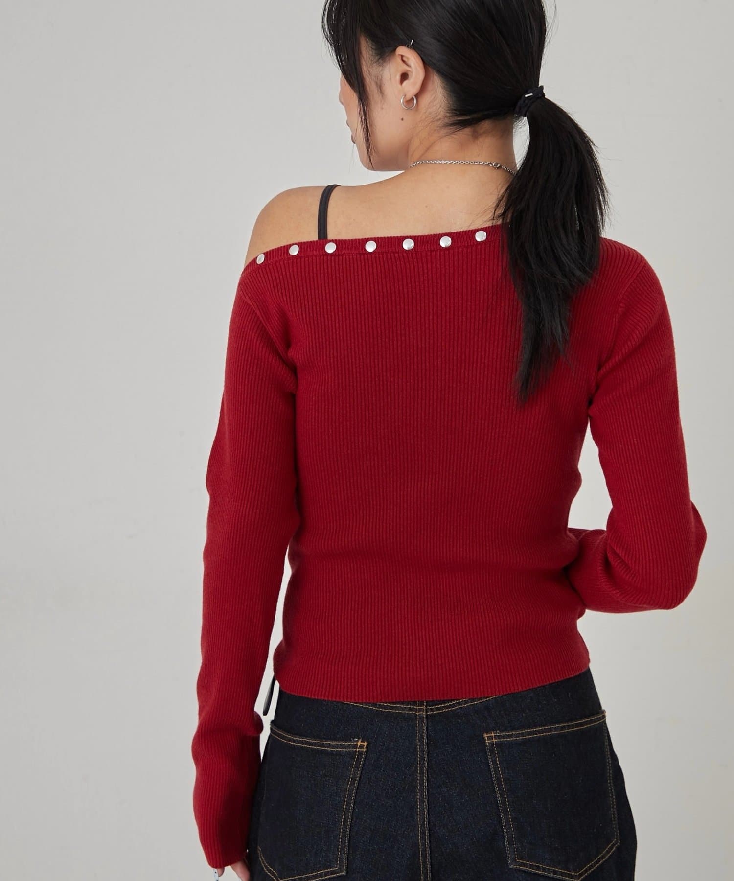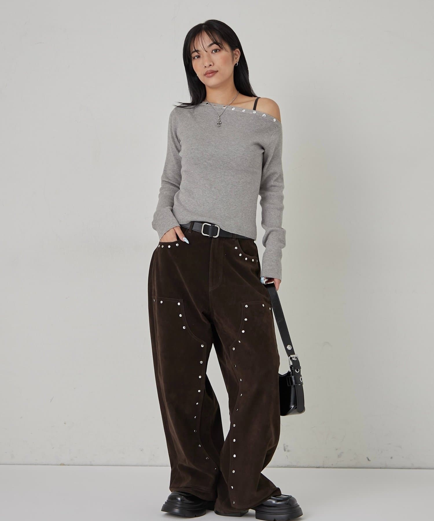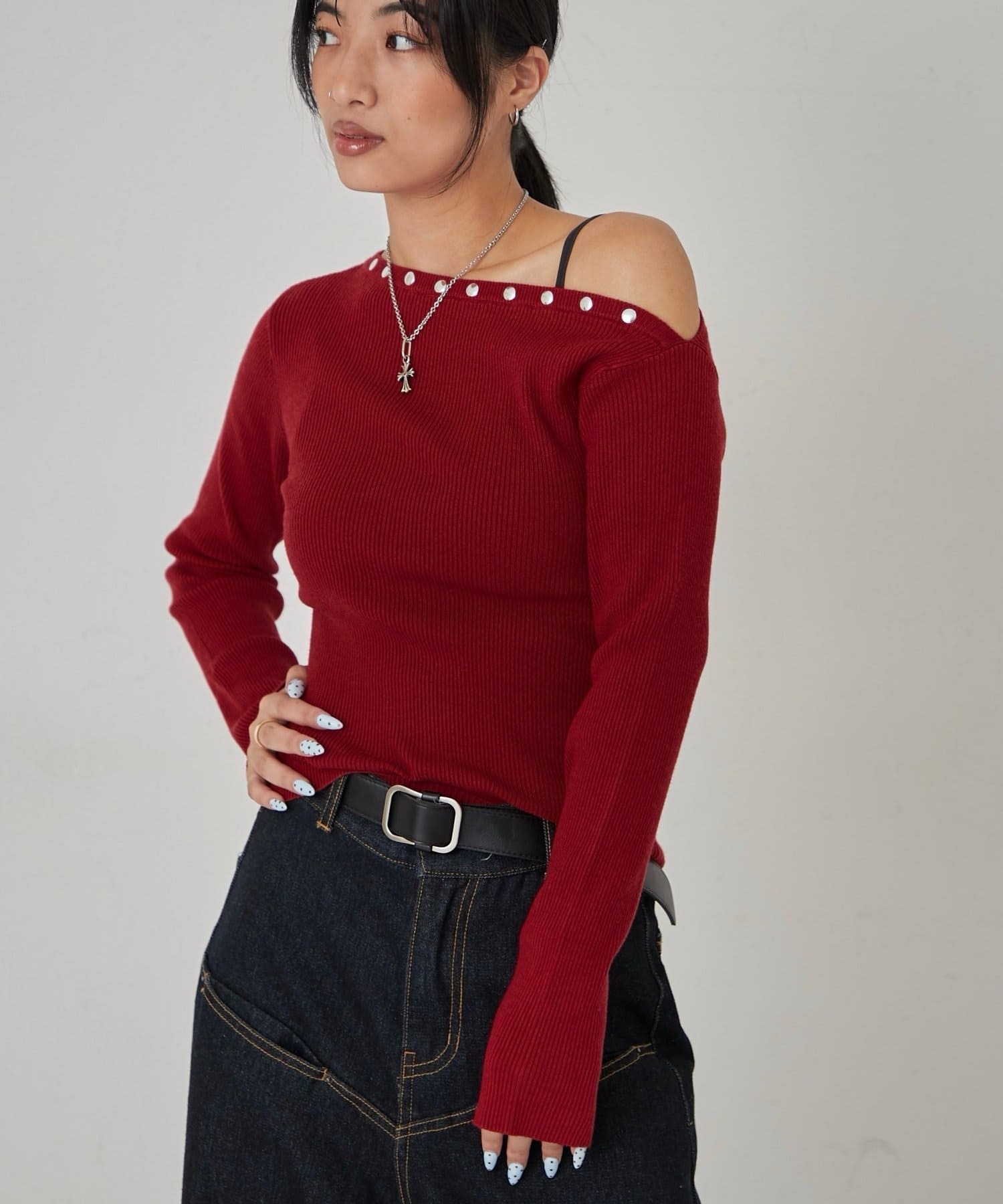 ・首元のスタッズのカッコよさと、ワンショルダーのニットで女性らしさも兼ね備えたトップス。