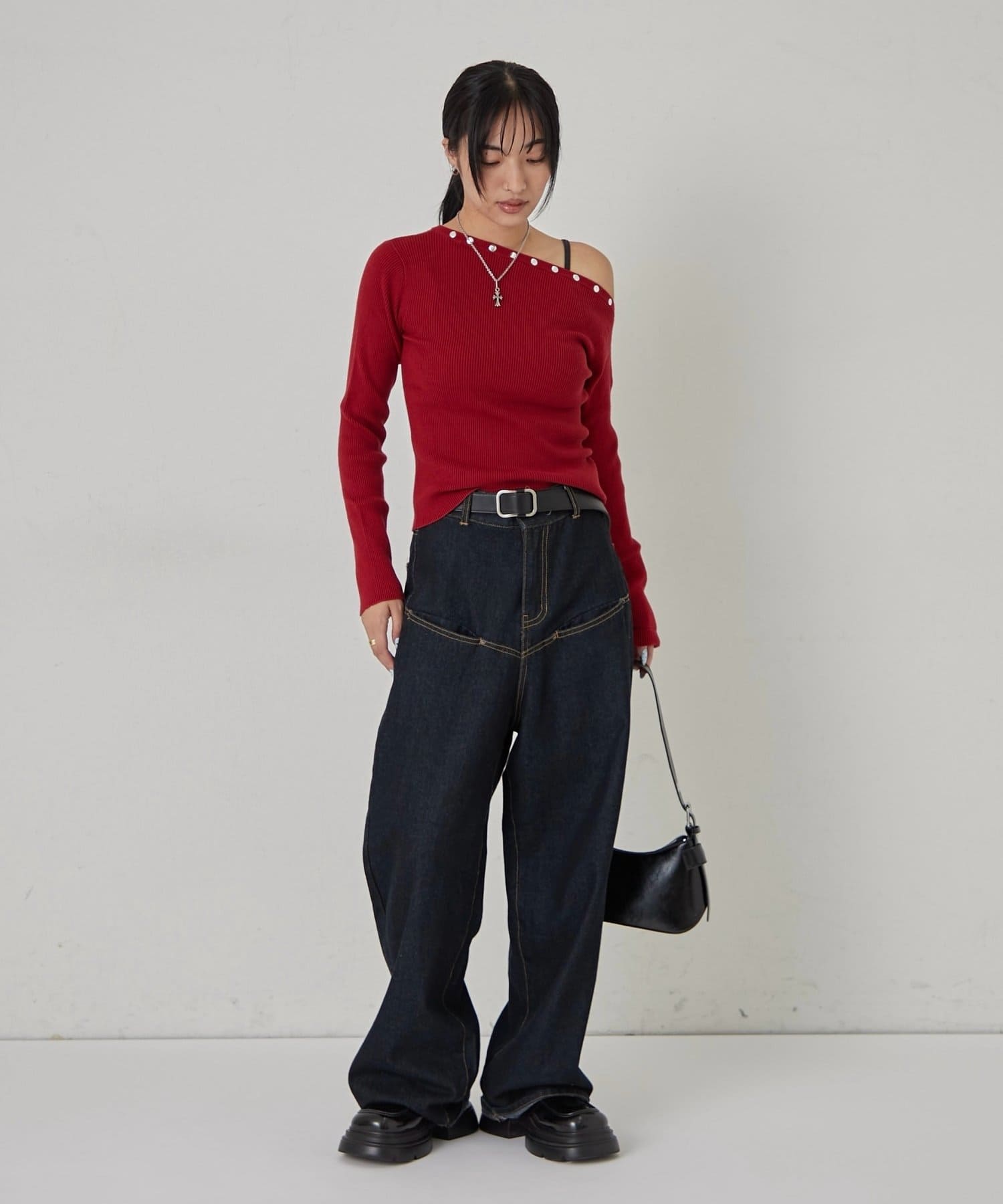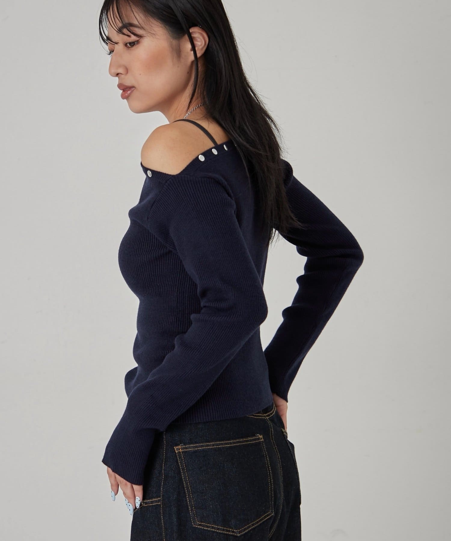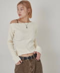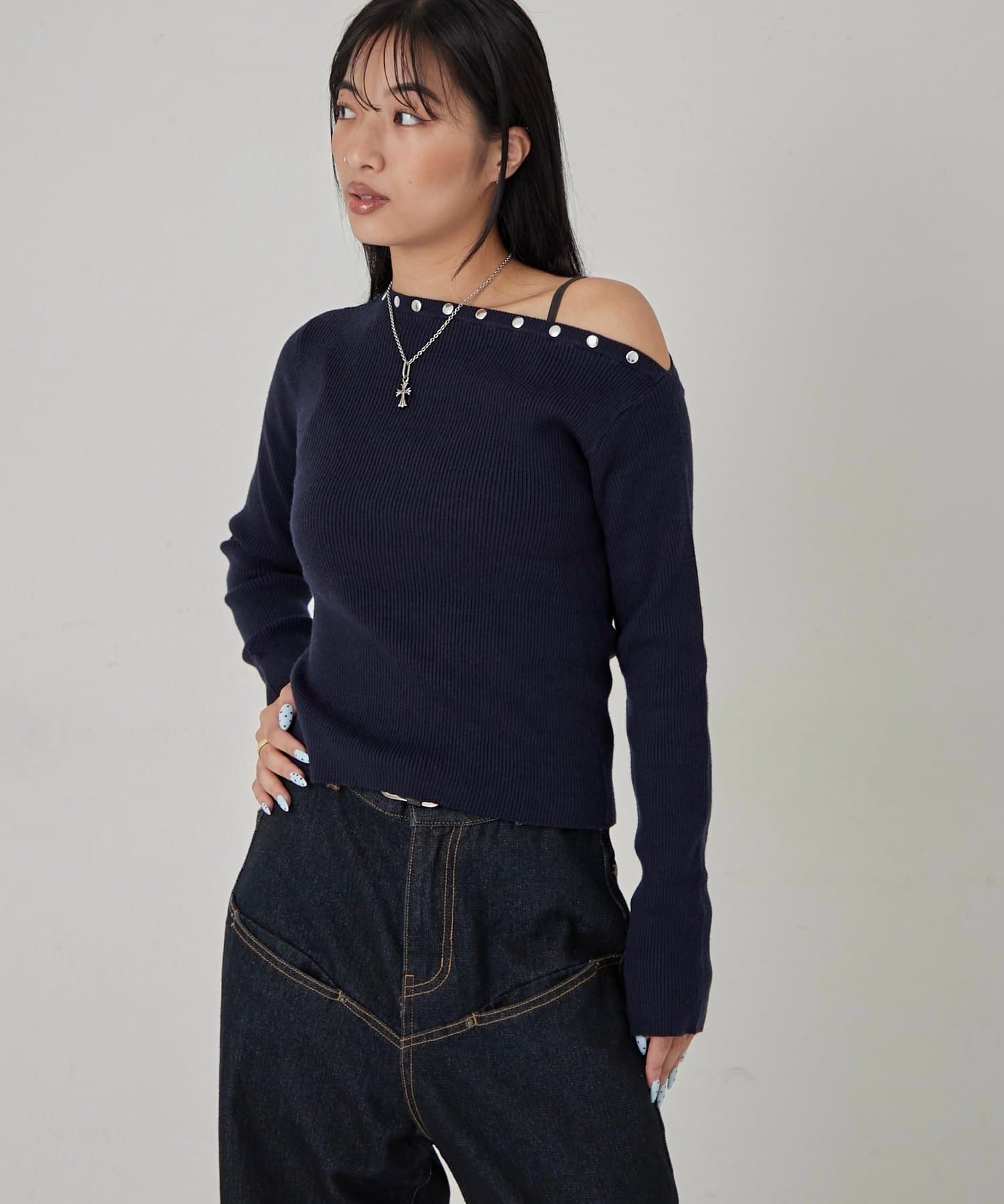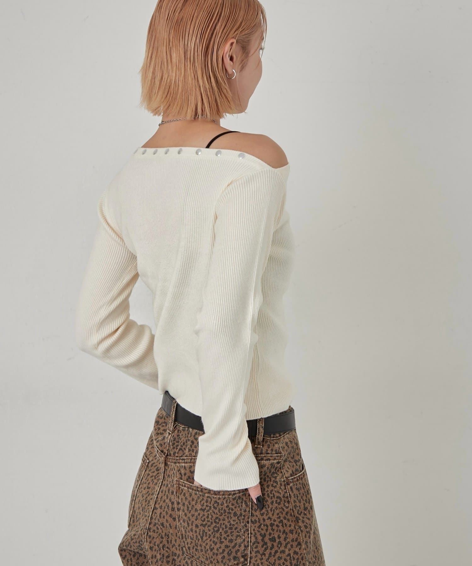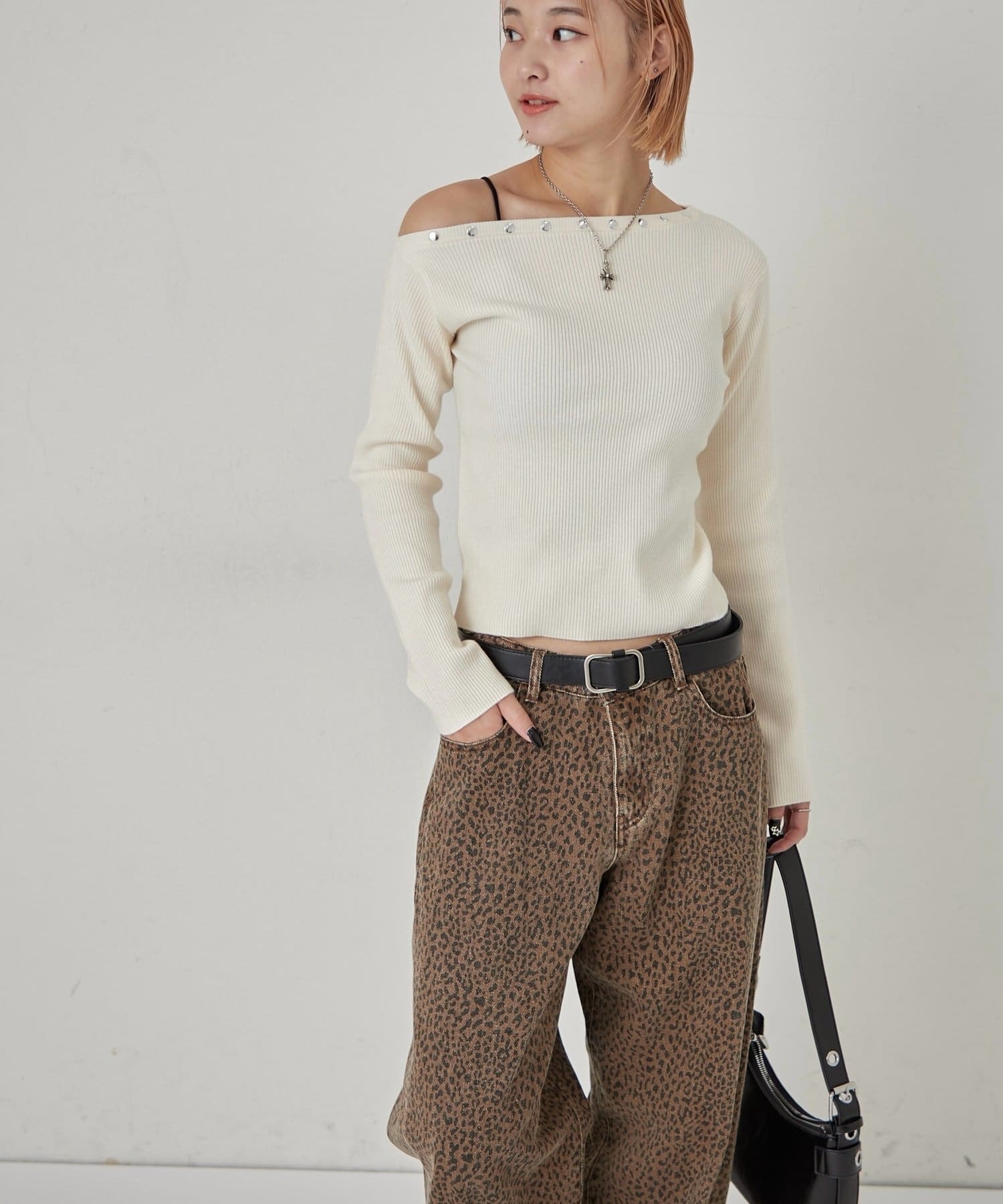 ・首元のスタッズのカッコよさと、ワンショルダーのニットで女性らしさも兼ね備えたトップス。