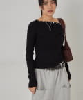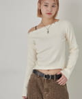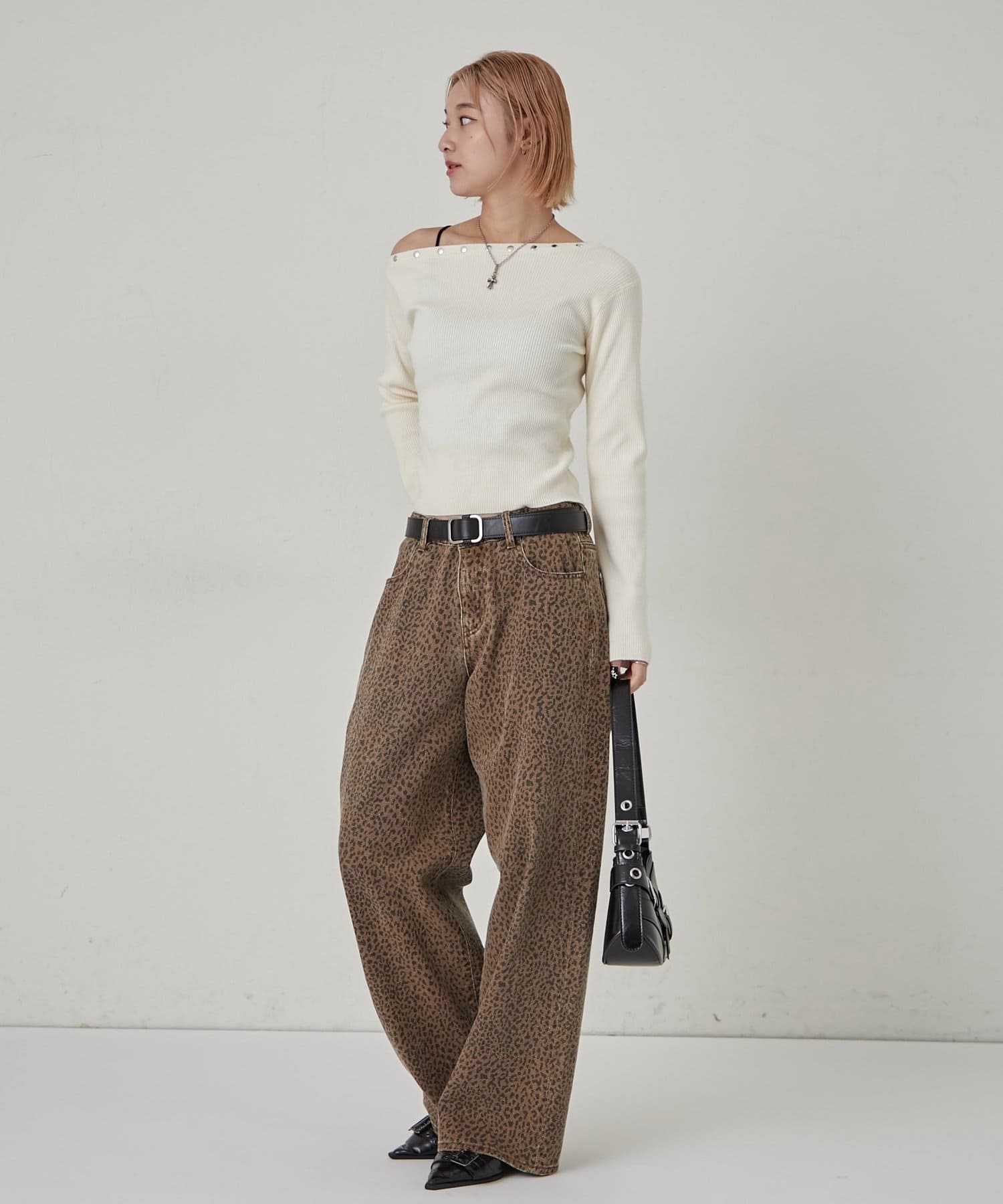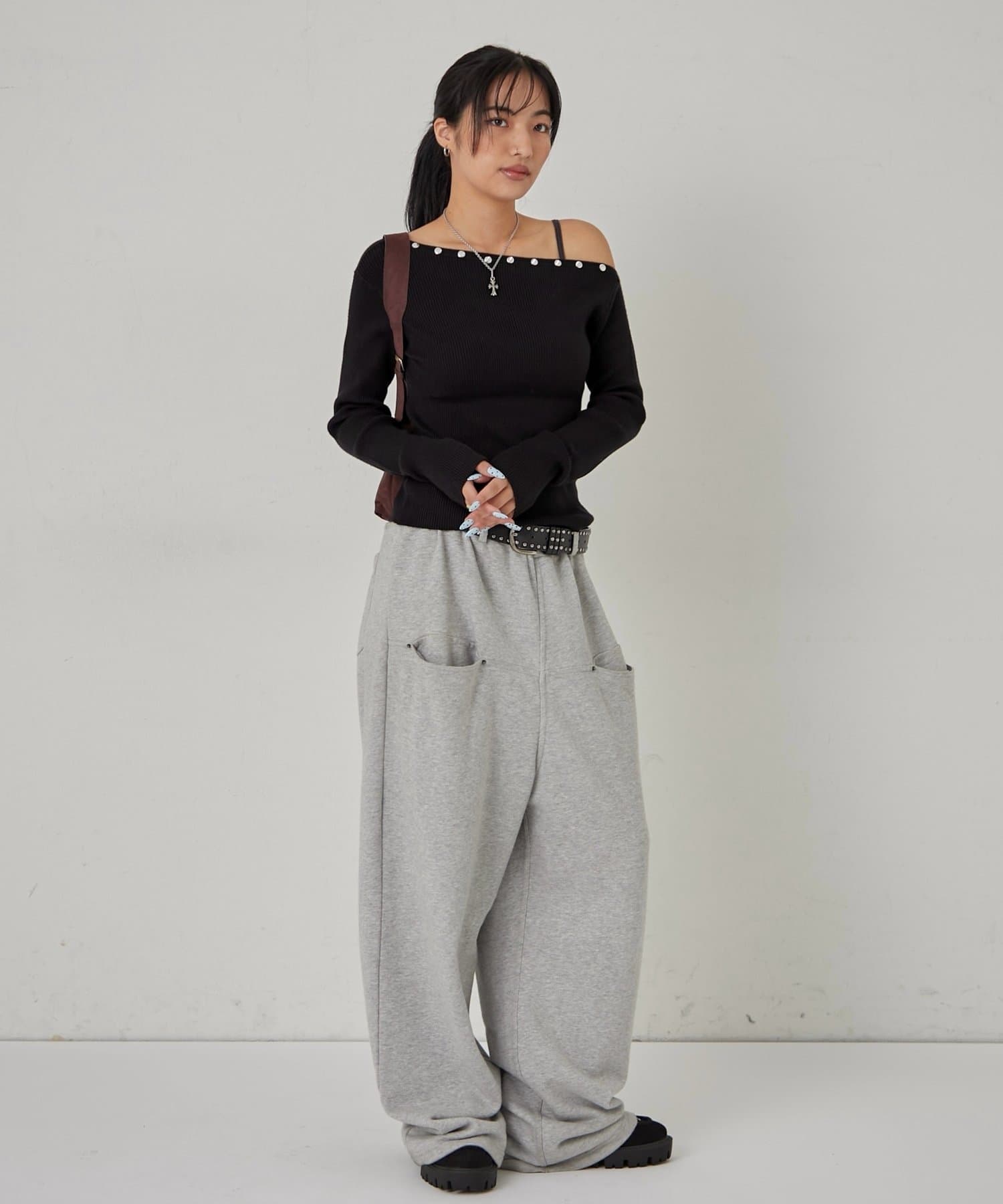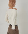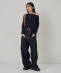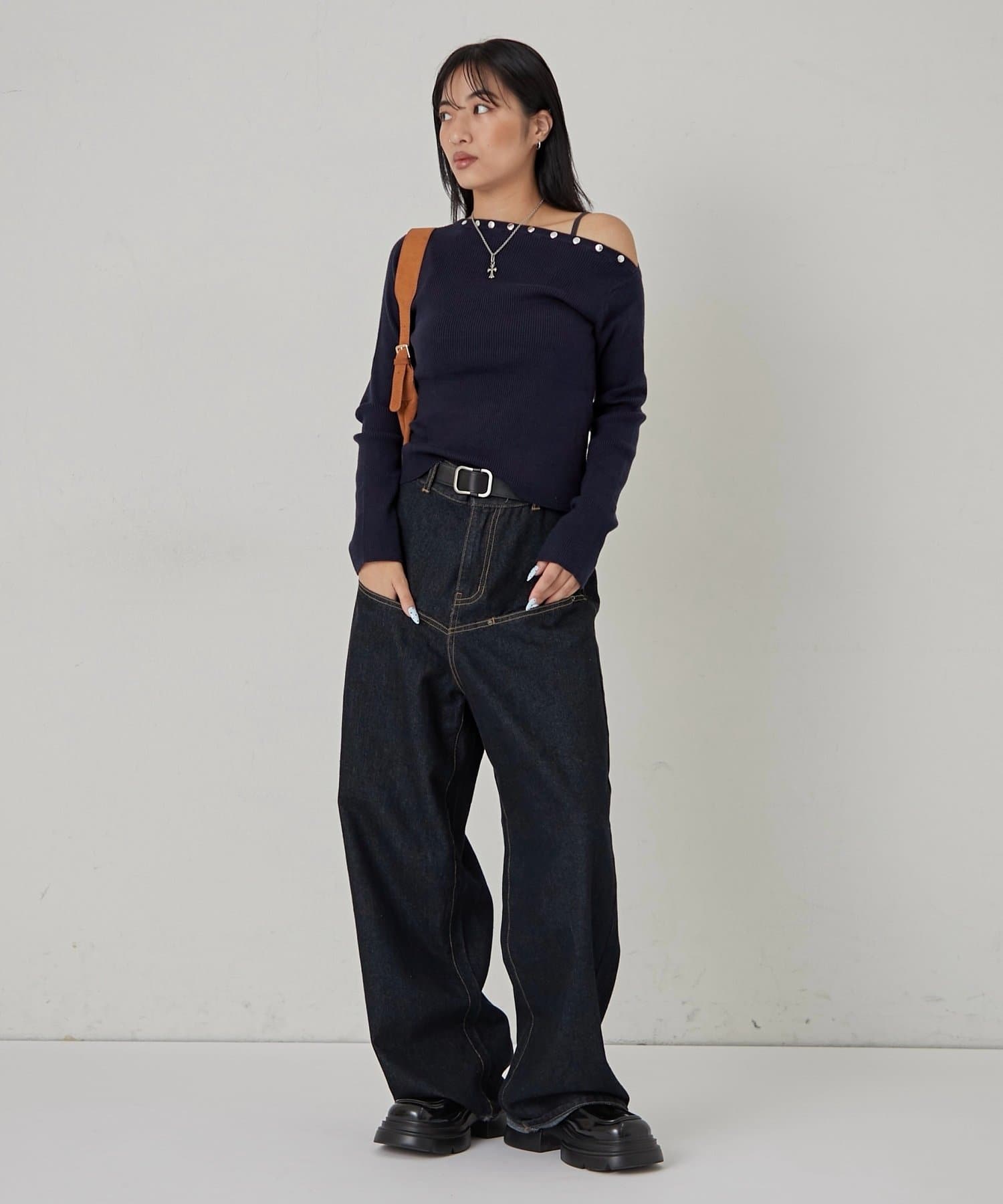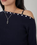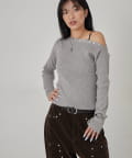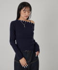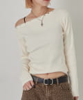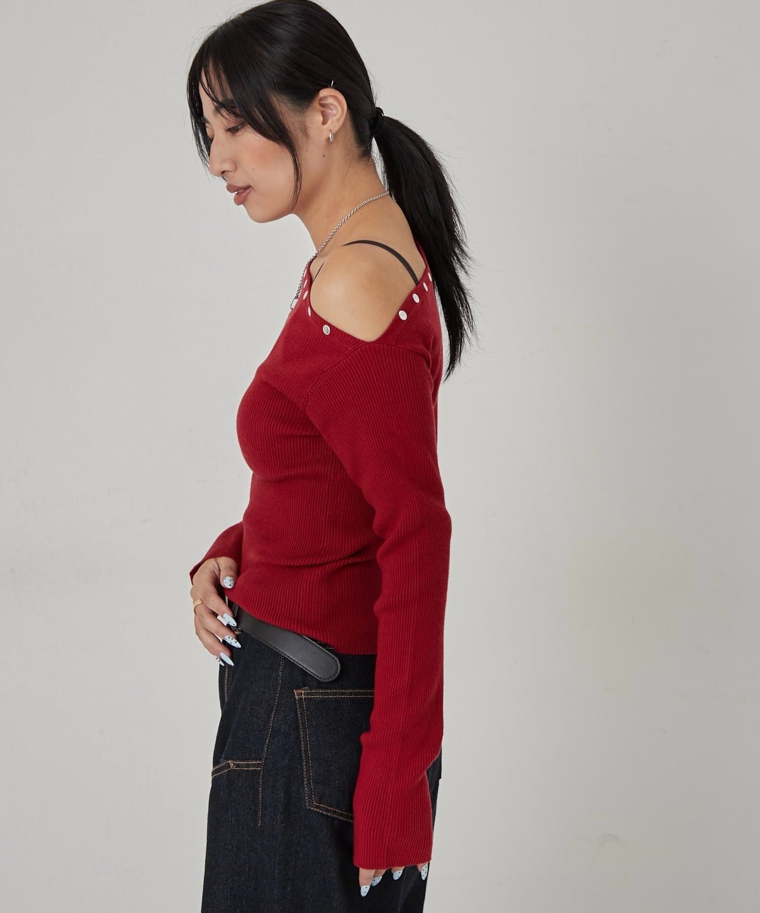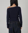 ・首元のスタッズのカッコよさと、ワンショルダーのニットで女性らしさも兼ね備えたトップス。