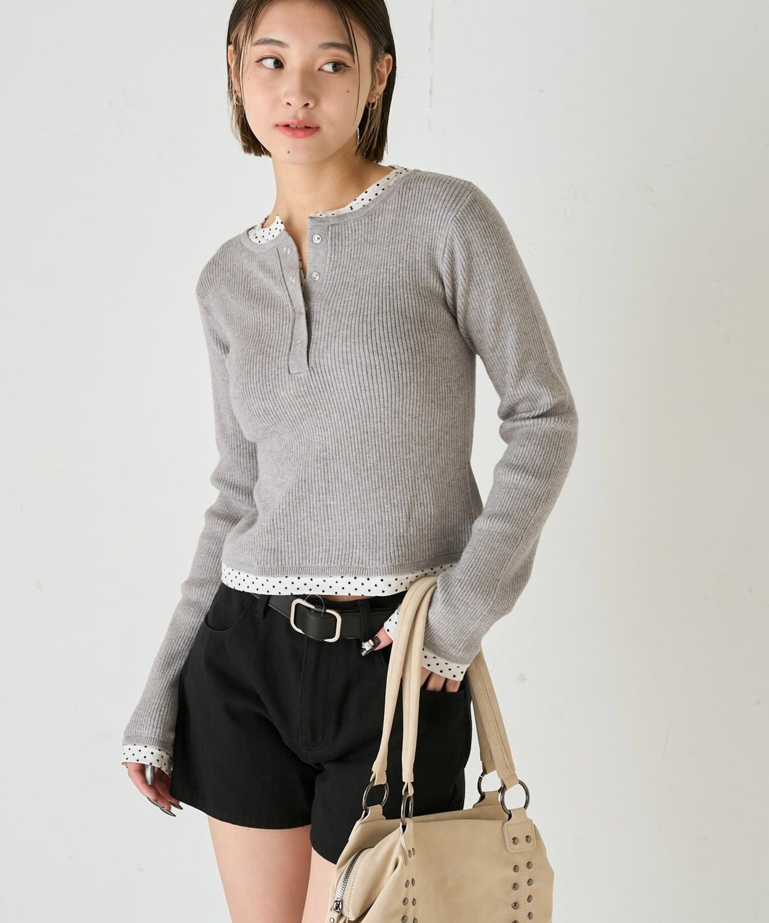 ・シンプルな着こなしでもおしゃれに見える、レイヤードデザインのヘンリーネックニット。