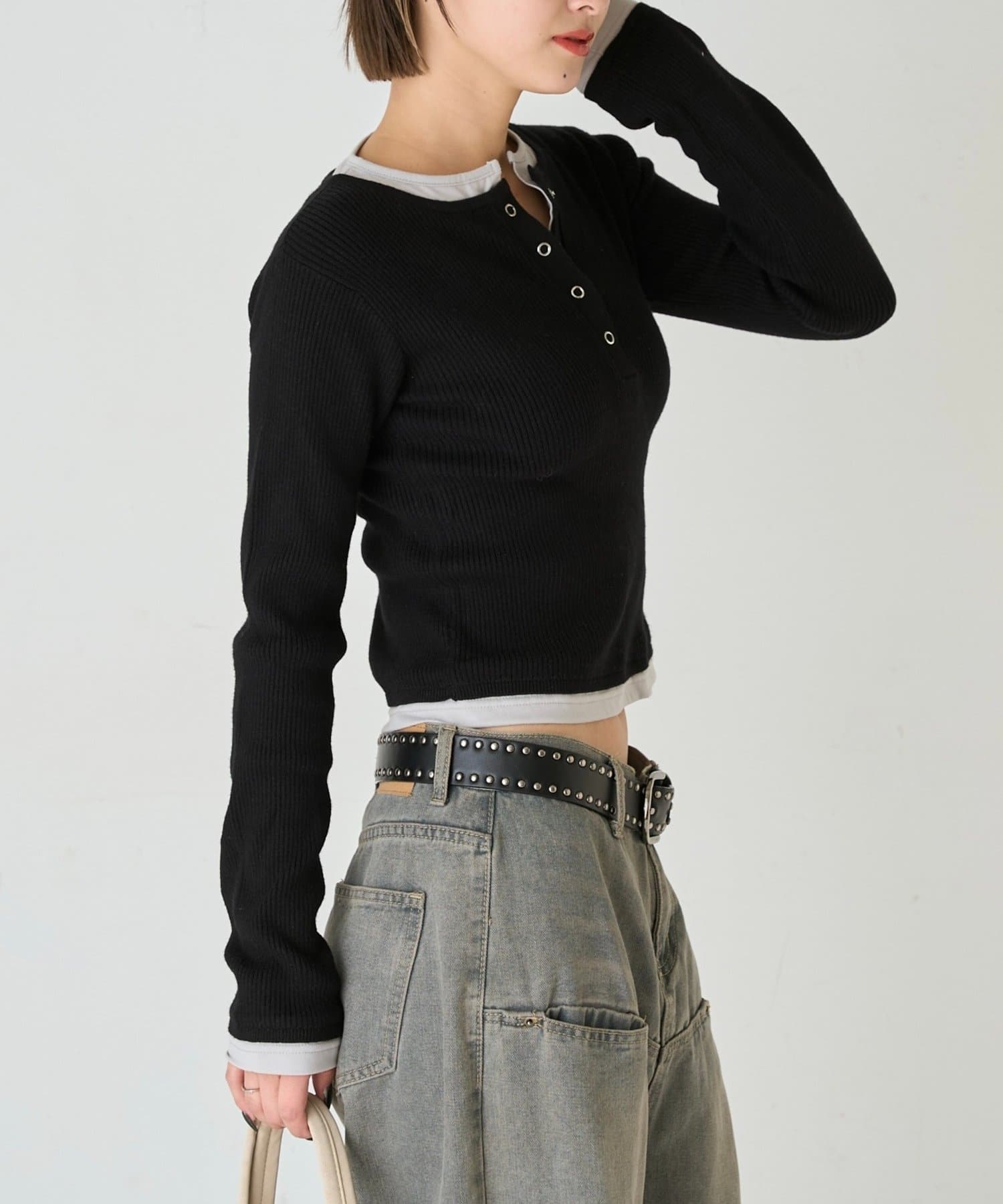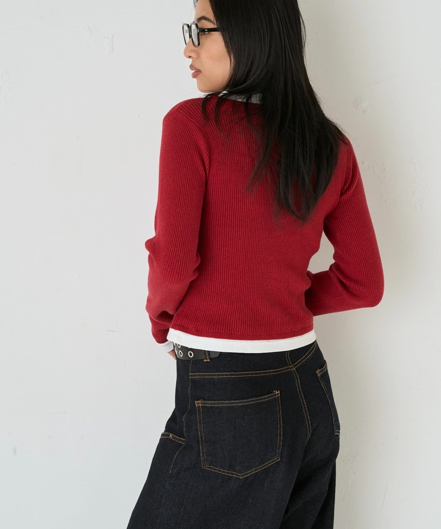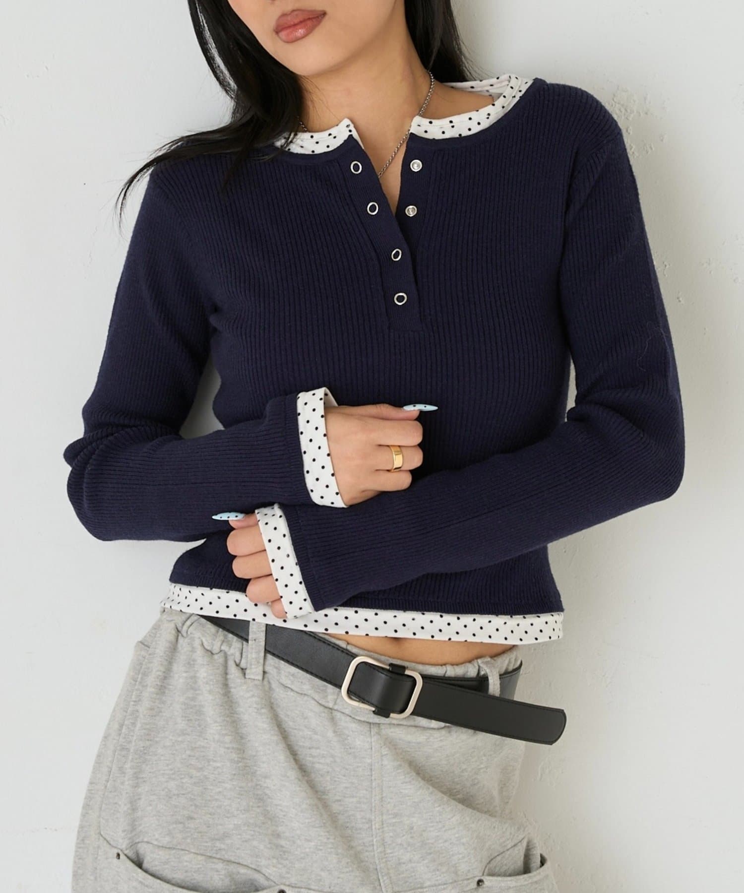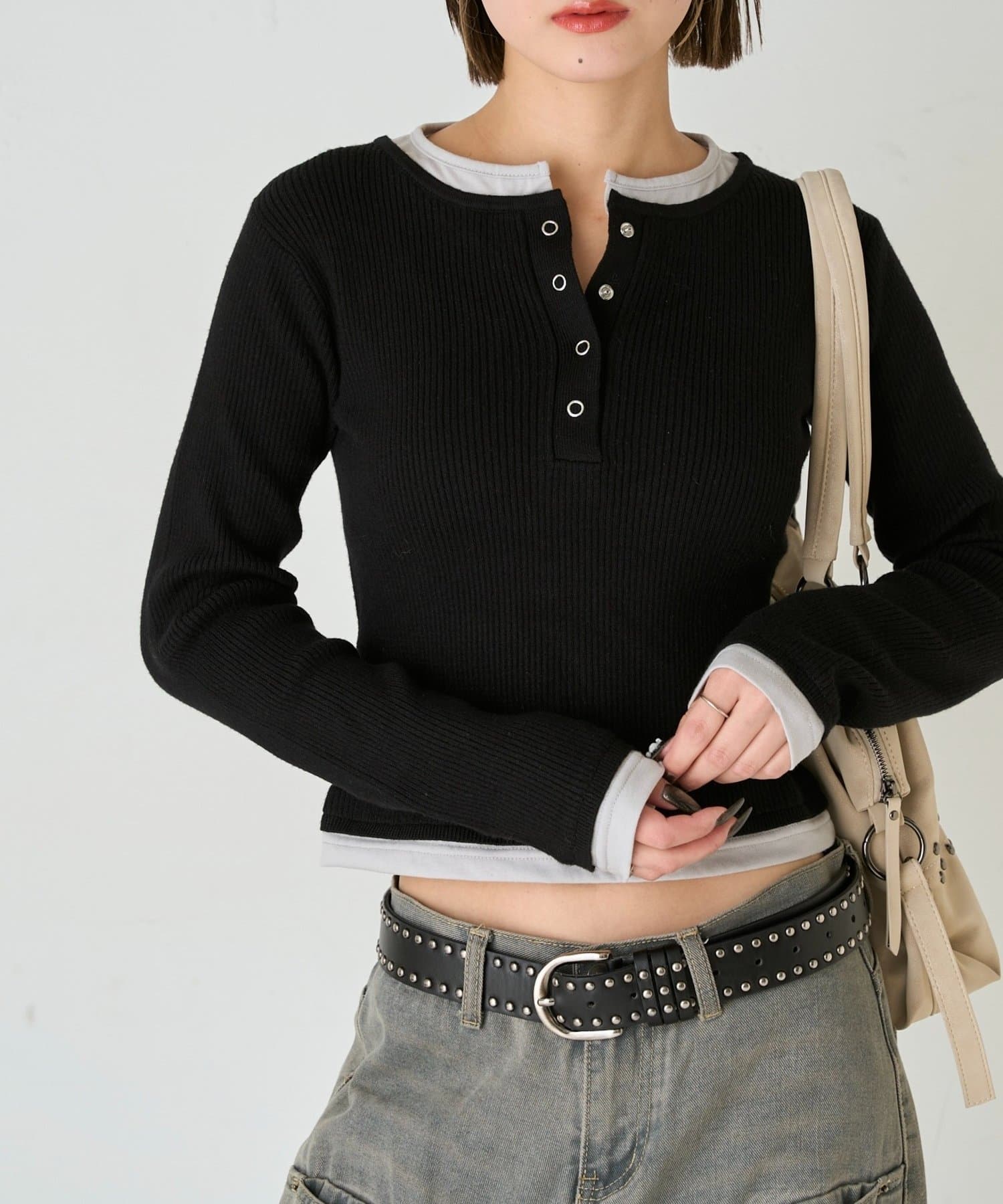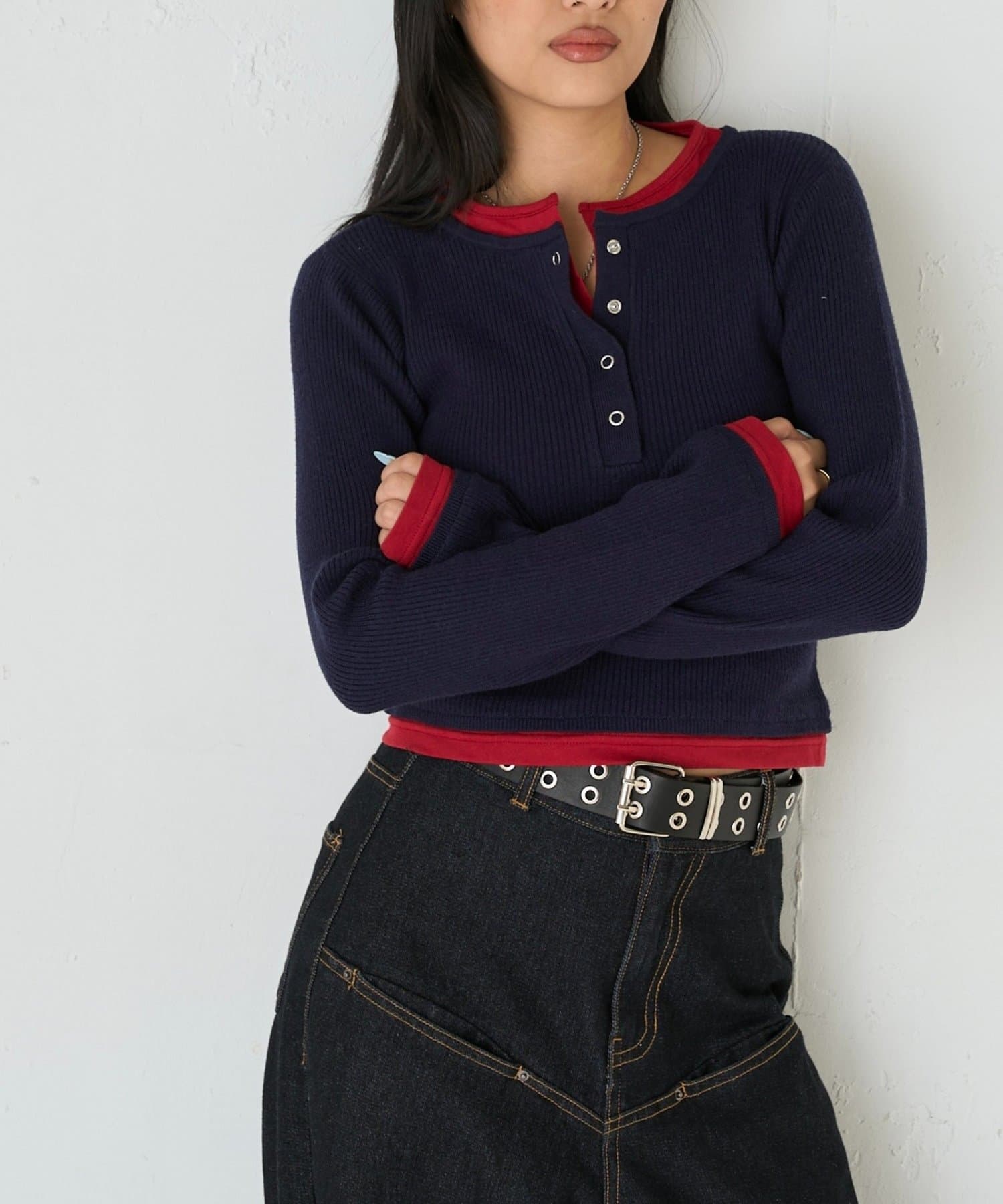 ・シンプルな着こなしでもおしゃれに見える、レイヤードデザインのヘンリーネックニット。