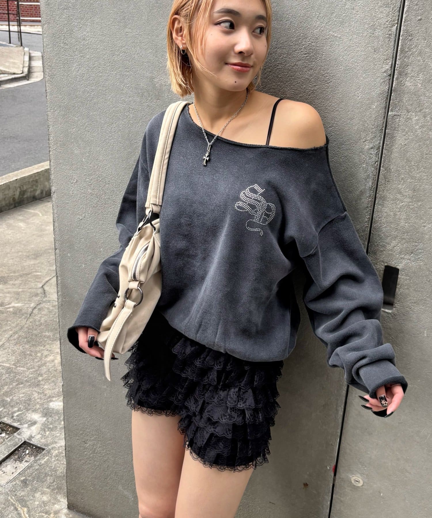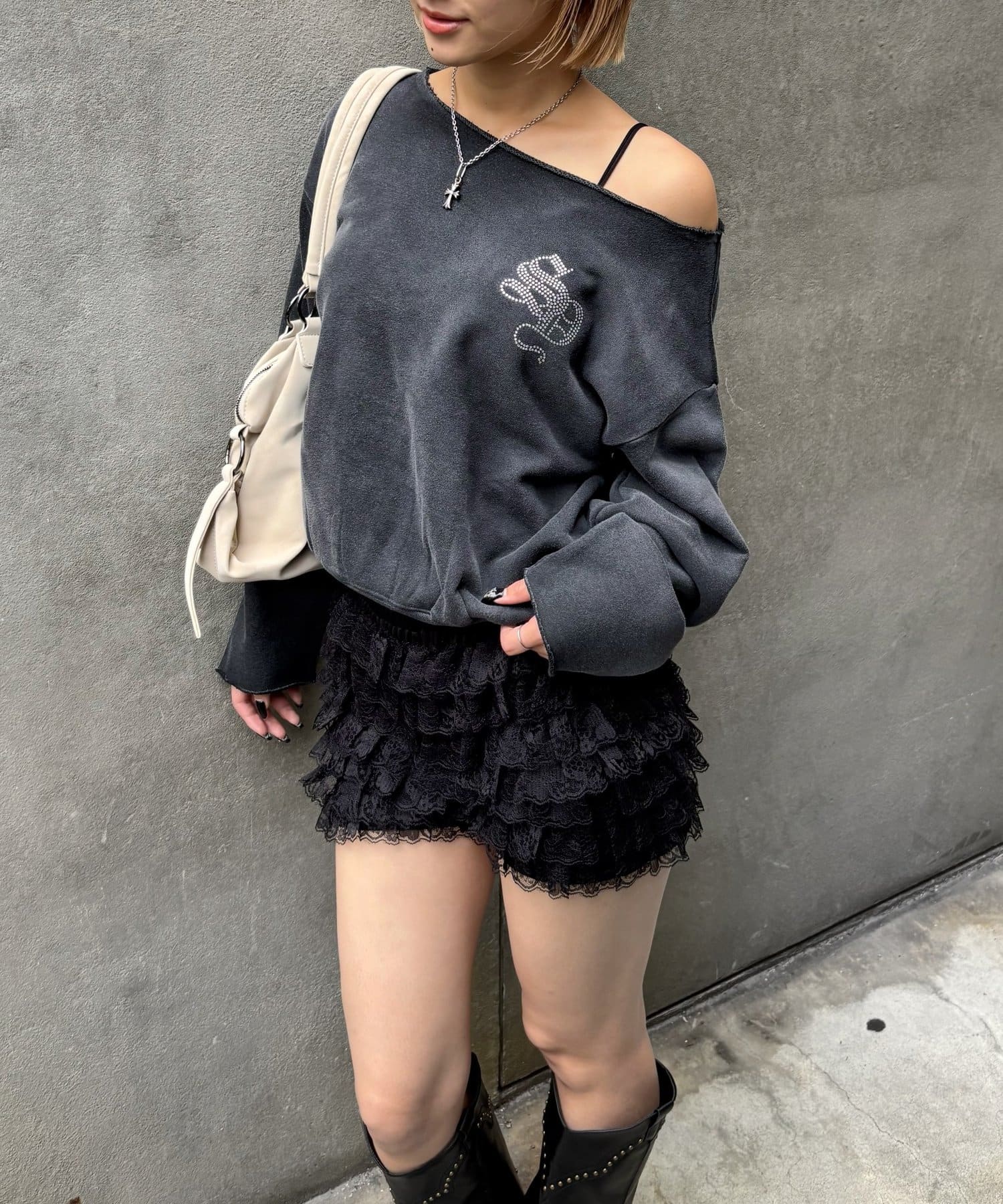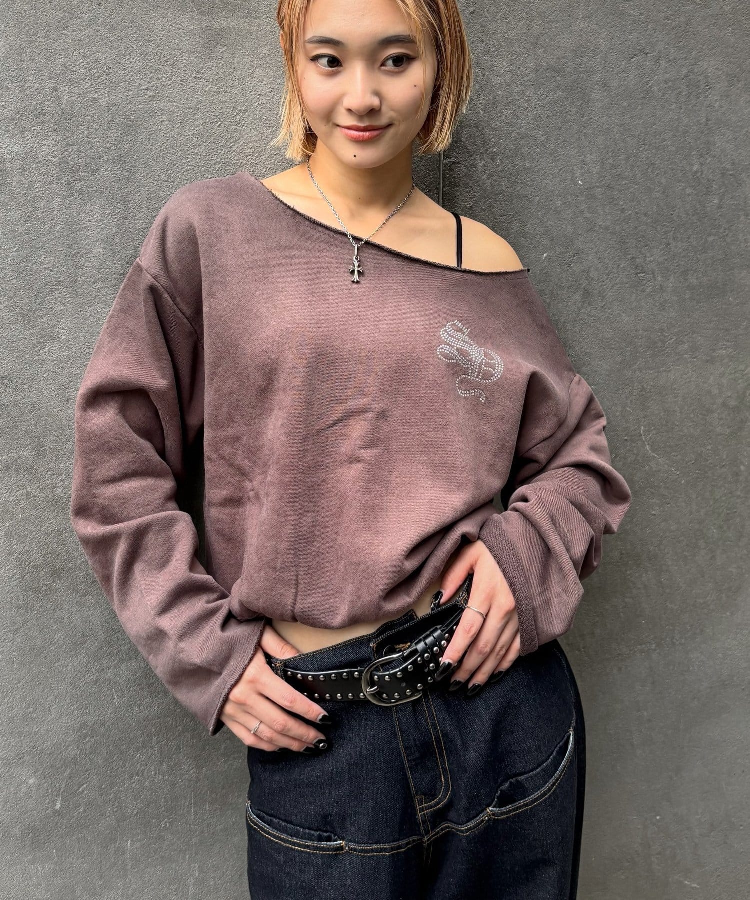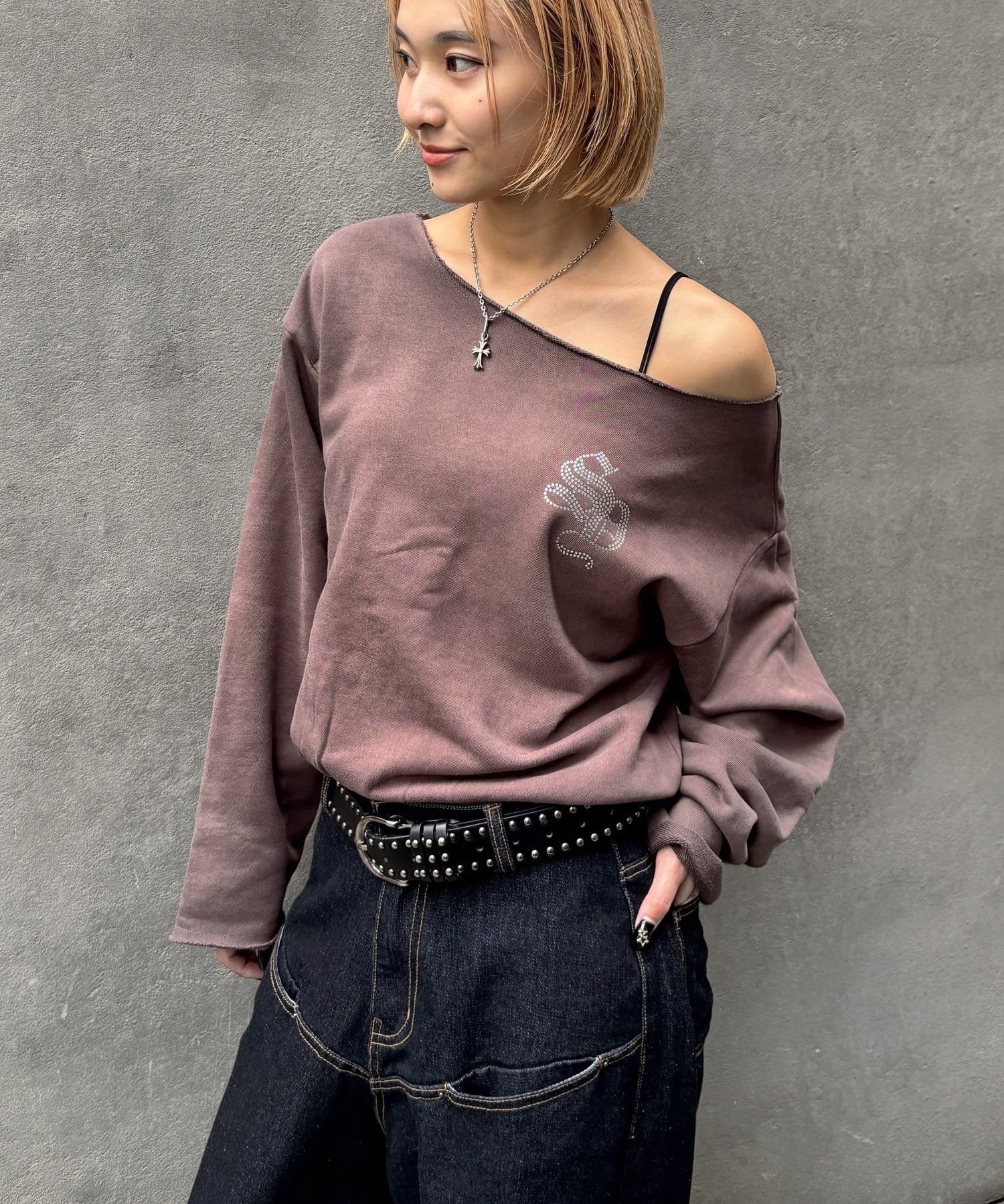 【WHO'S WHO gallery】ラインストーンオフショルスウェット