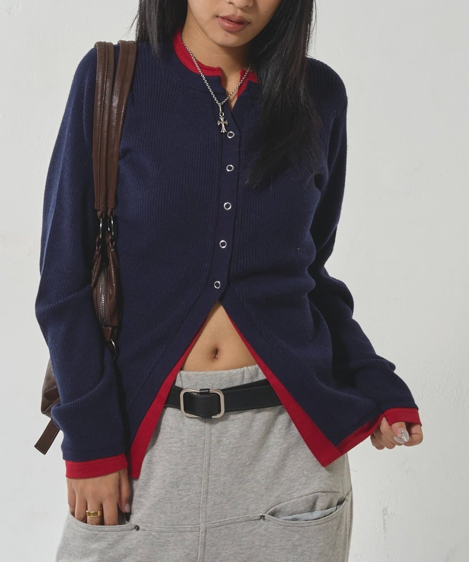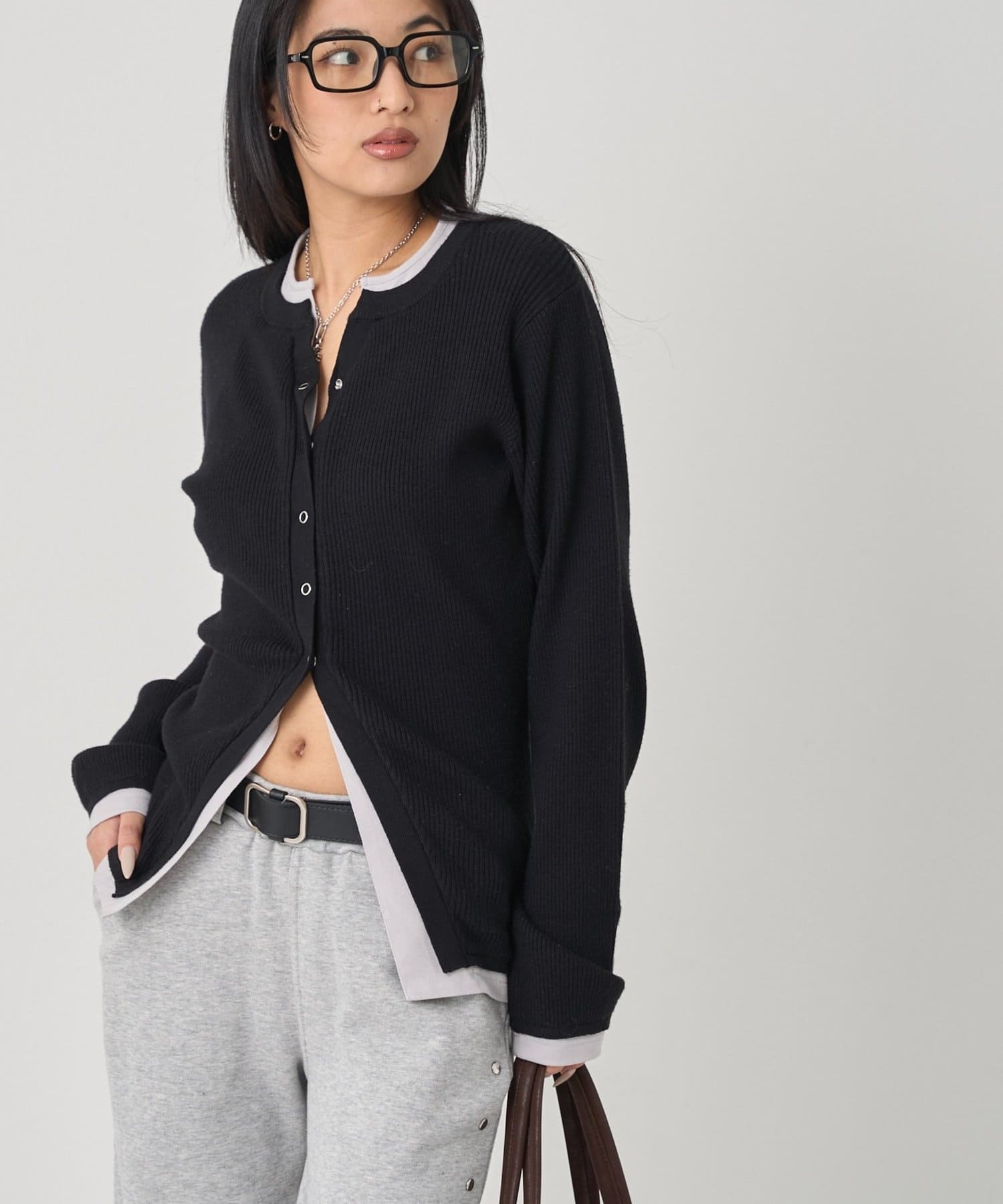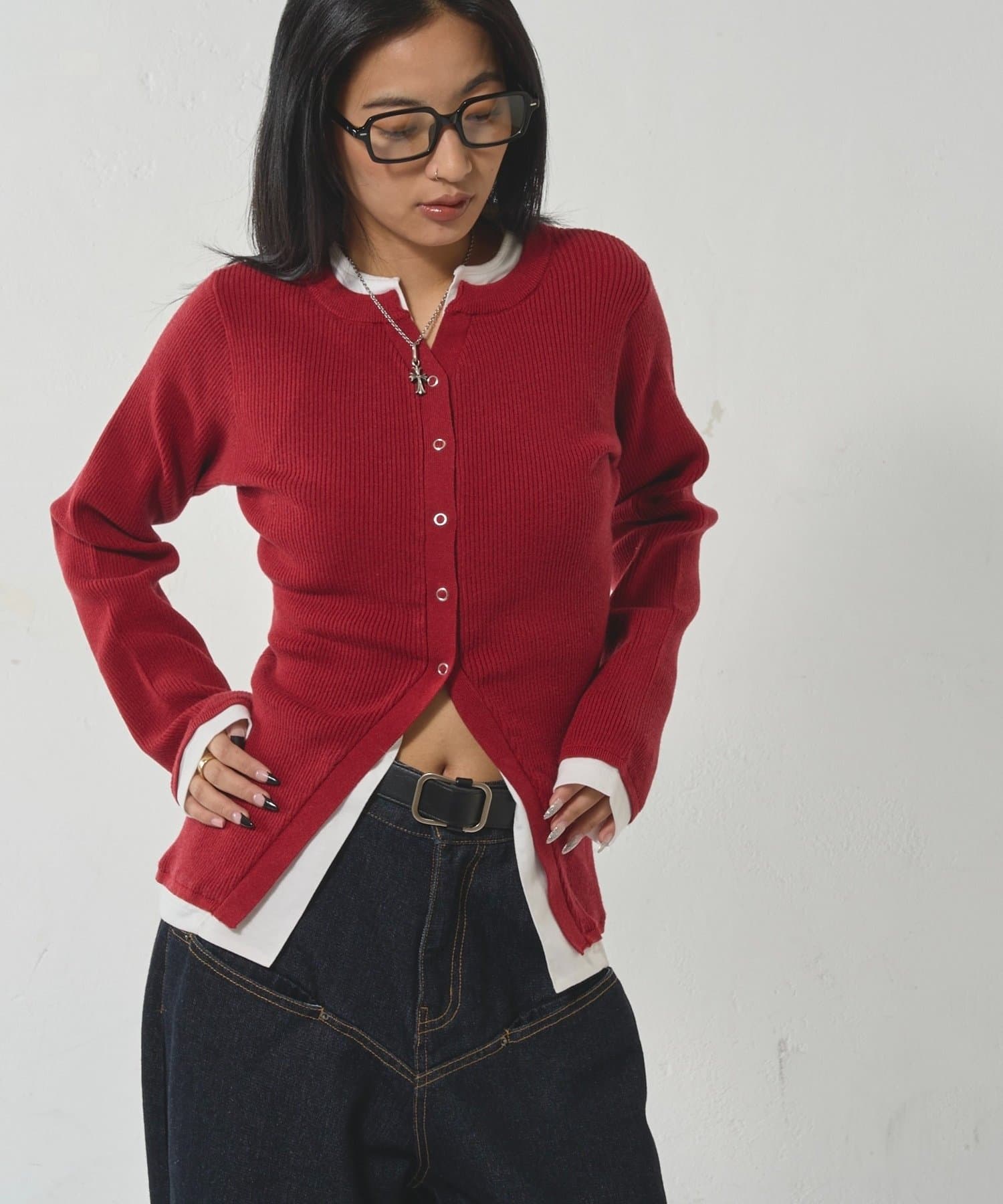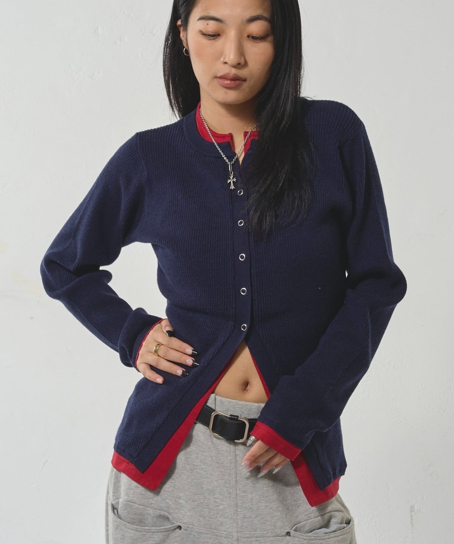 ・ヘンリーネックとカーディガンのレイヤード風デザインが特徴的な、おしゃれなカーディガン。