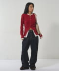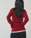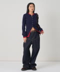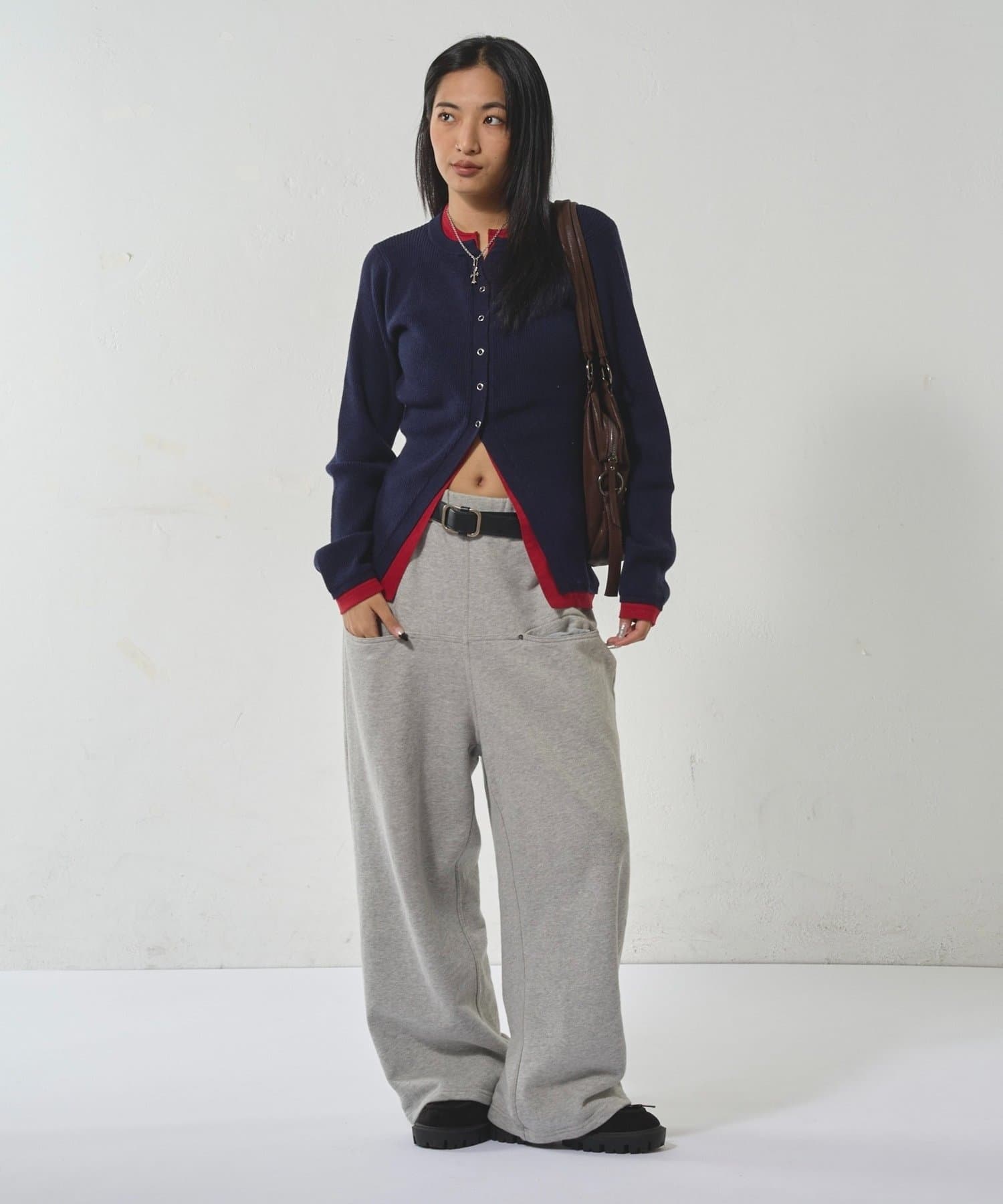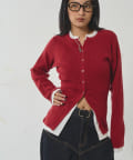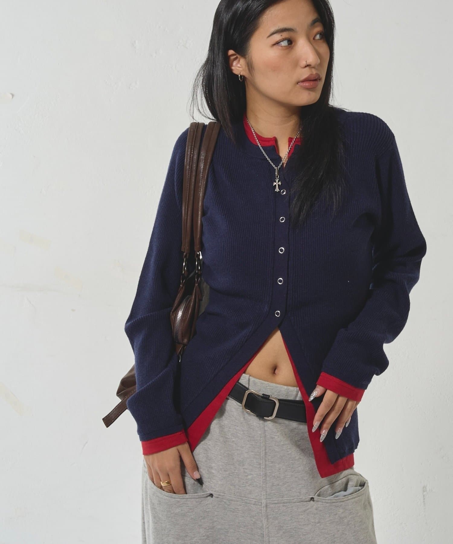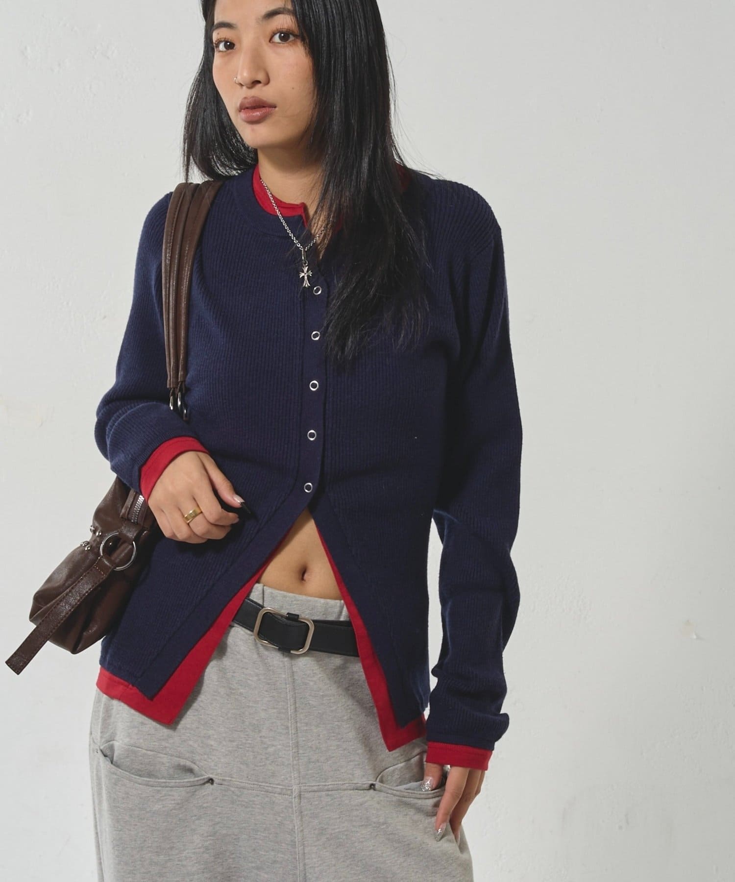 ・ヘンリーネックとカーディガンのレイヤード風デザインが特徴的な、おしゃれなカーディガン。
