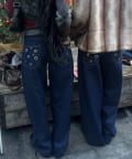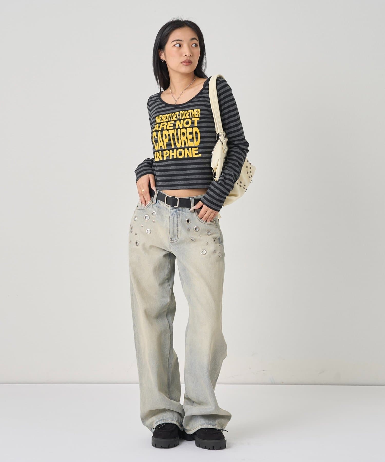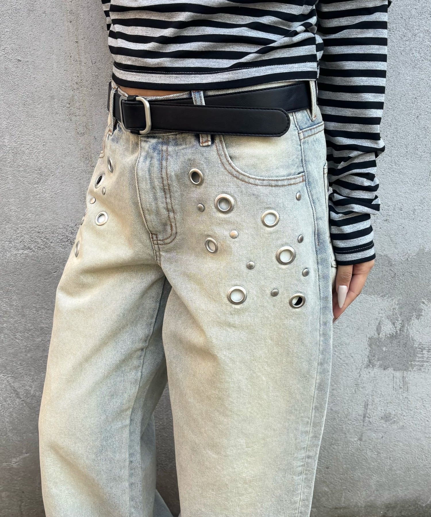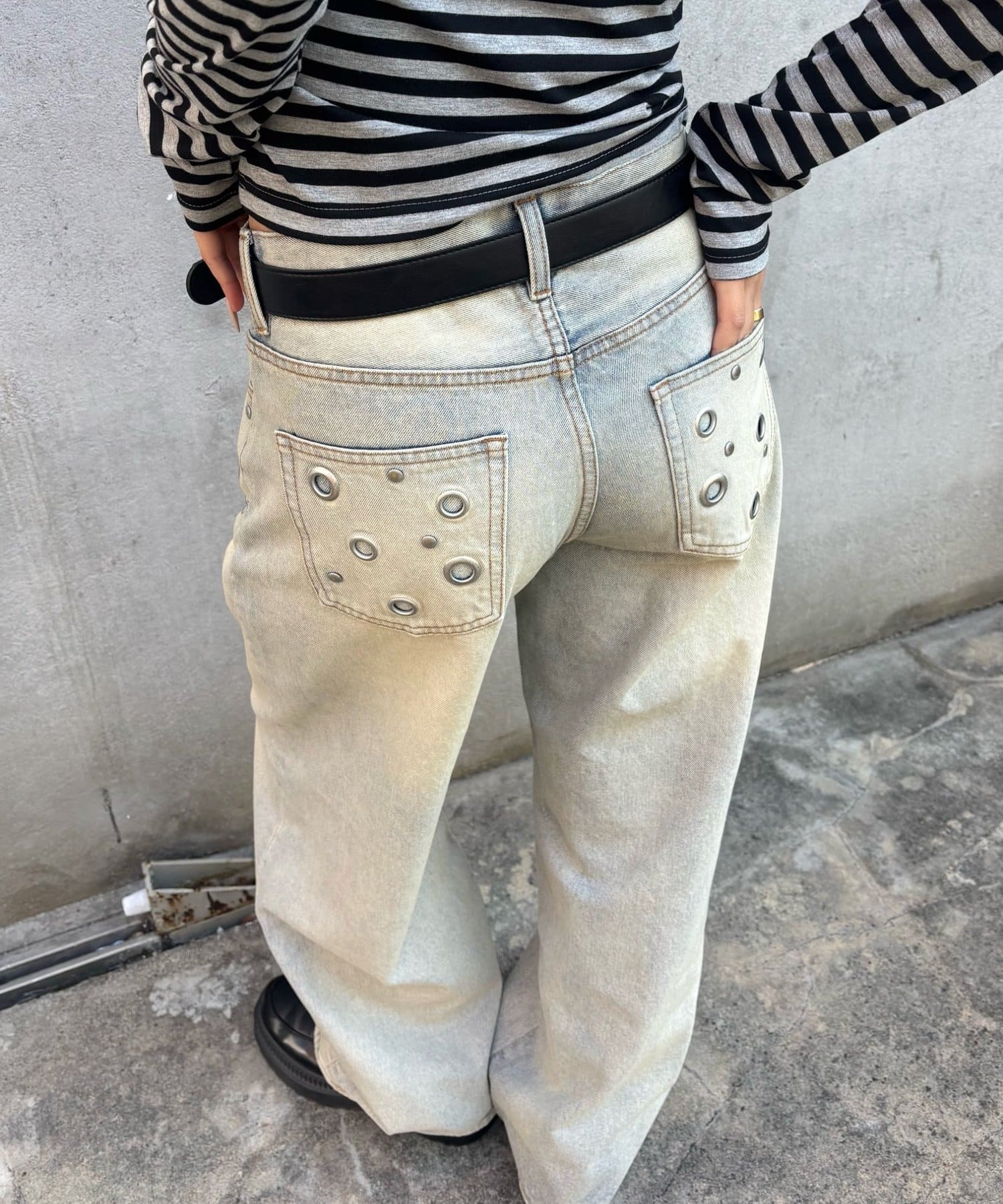 ・大胆なハトメデザインが目を引く、ローライズのワイドデニム。