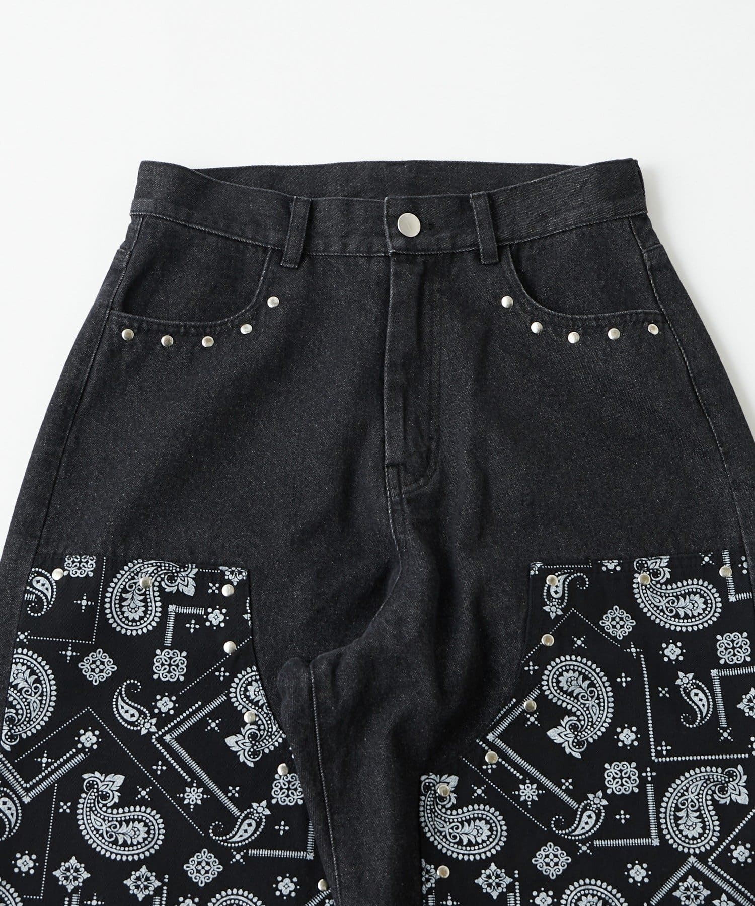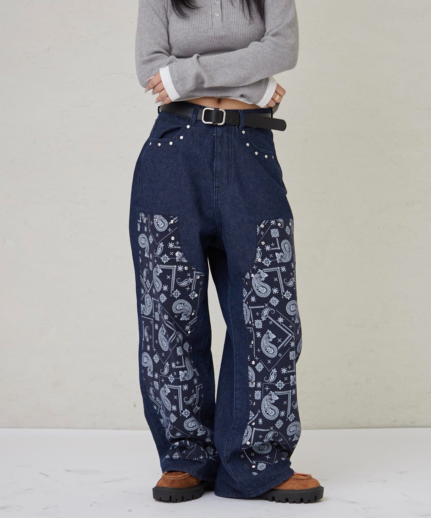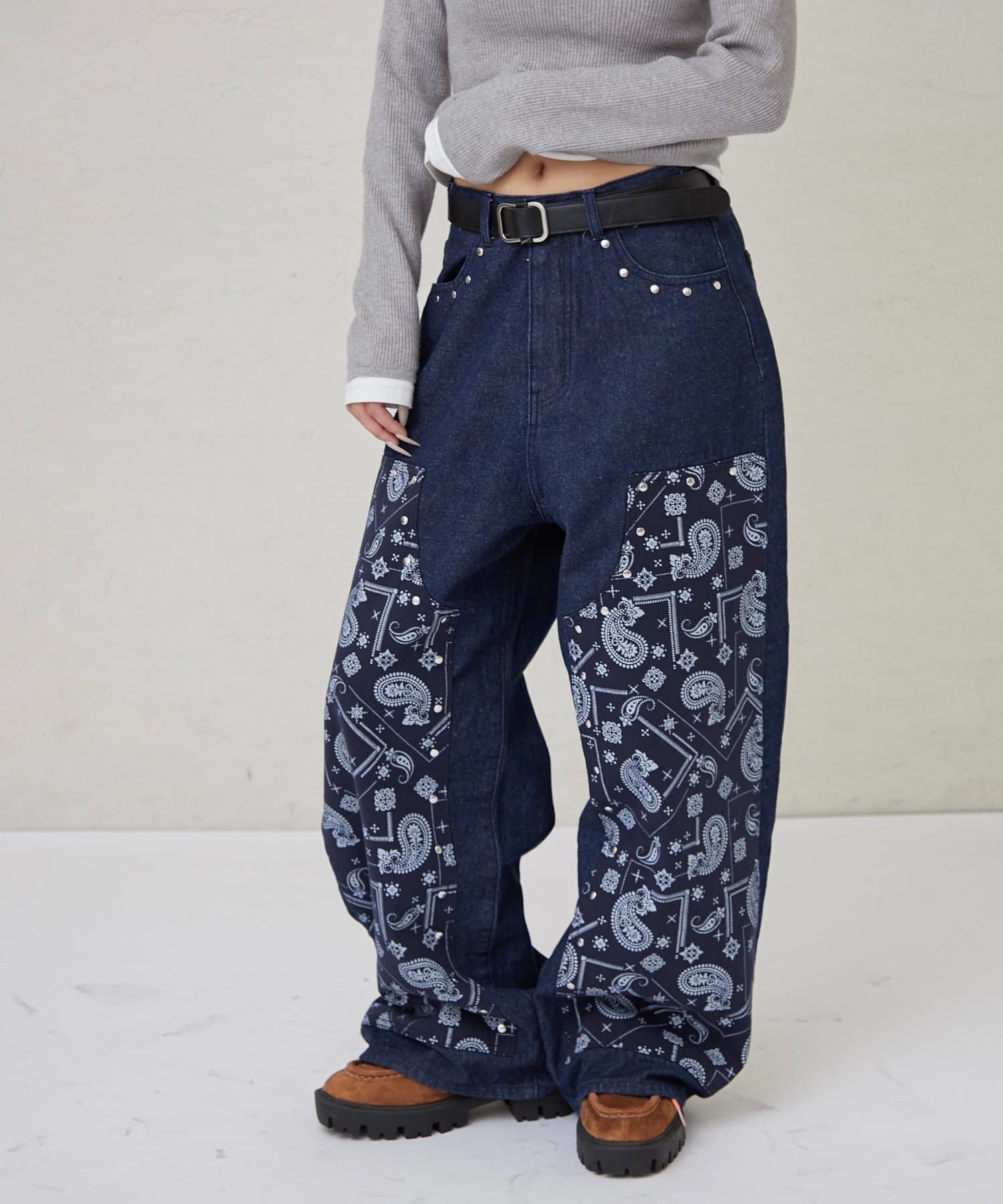 ・ペイズリー柄を大胆にあしらった、ダブルニーデニム。