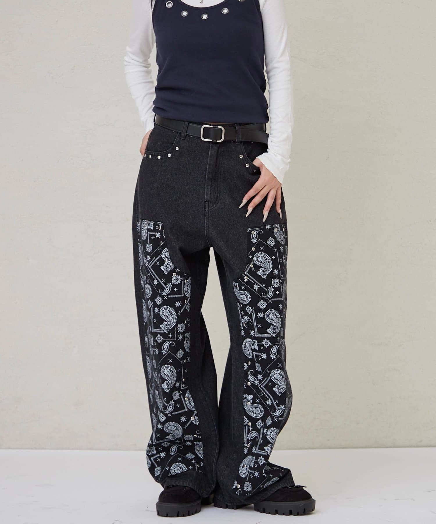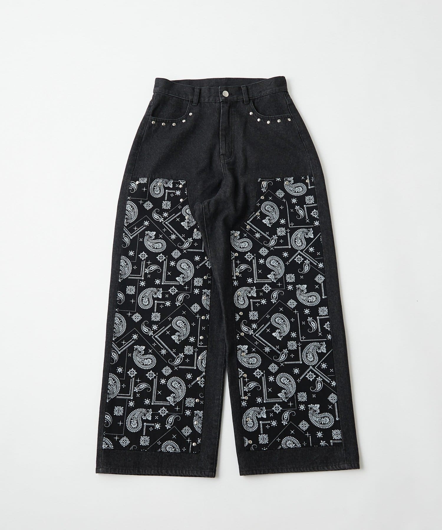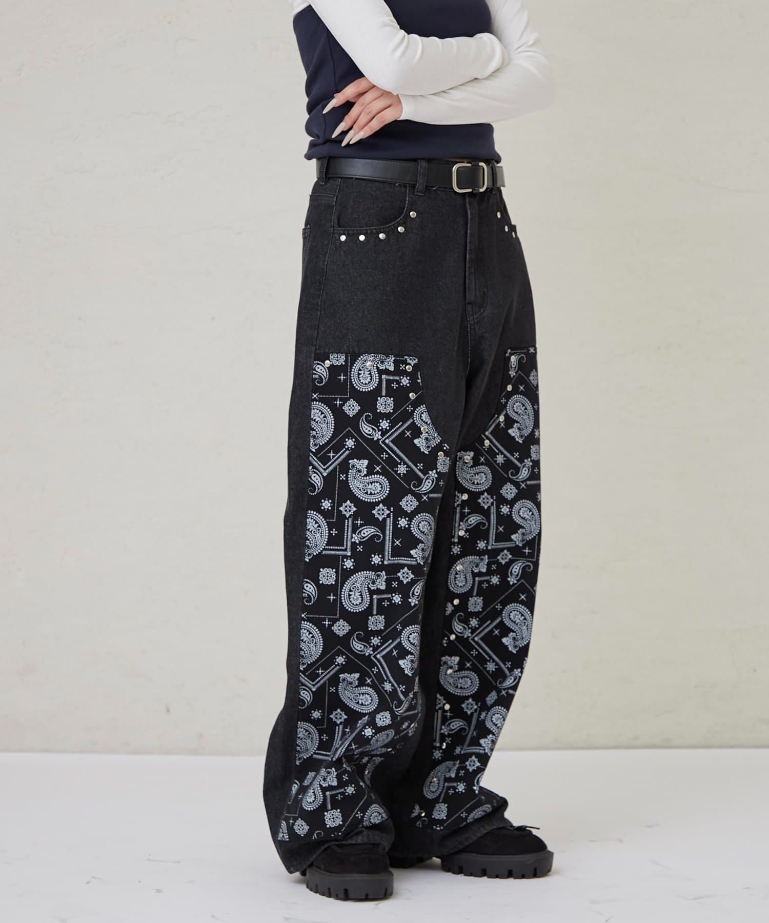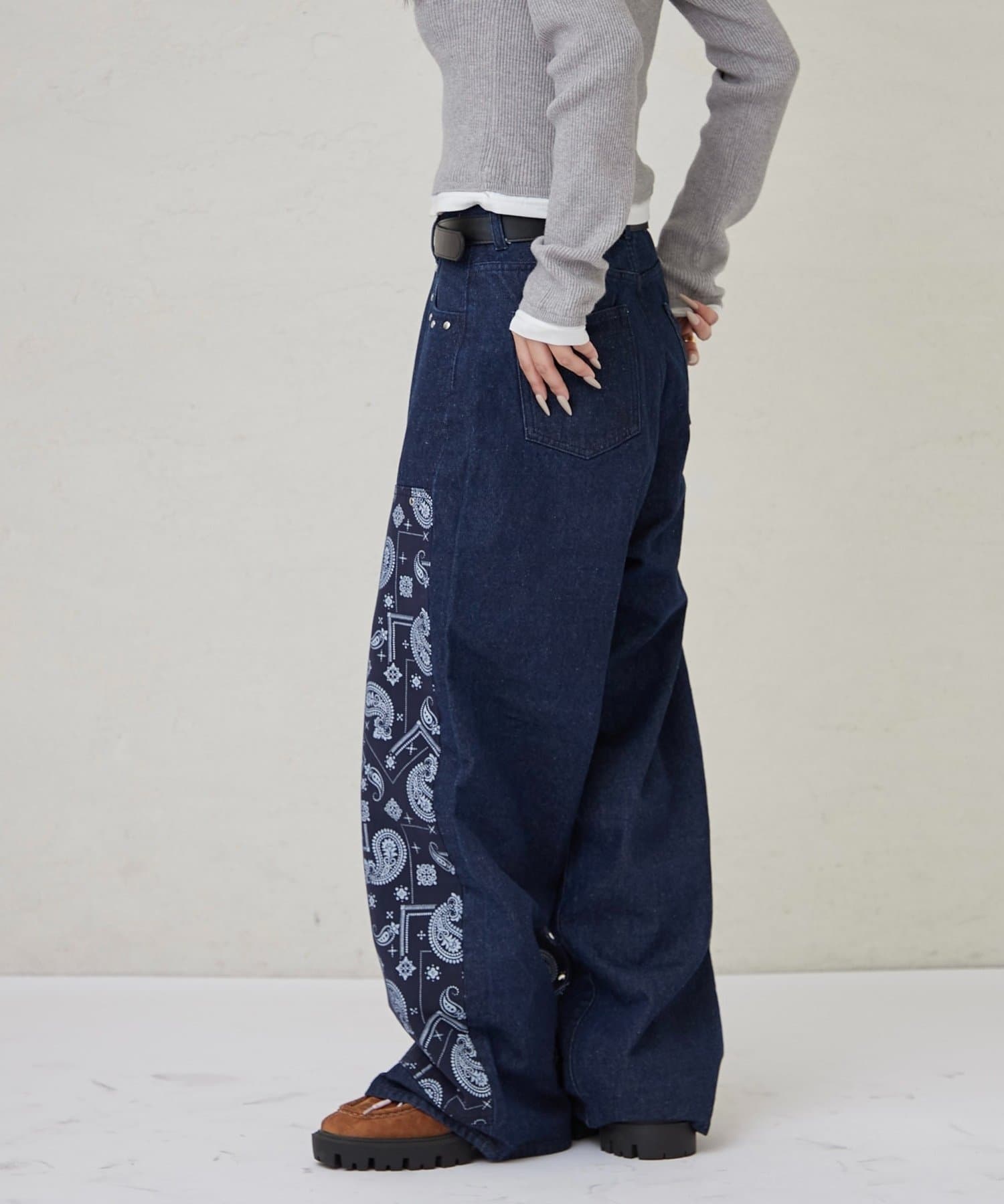・ペイズリー柄を大胆にあしらった、ダブルニーデニム。