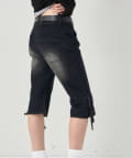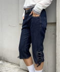 ・裾のレースアップがポイントのデニムカプリパンツ。