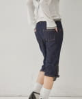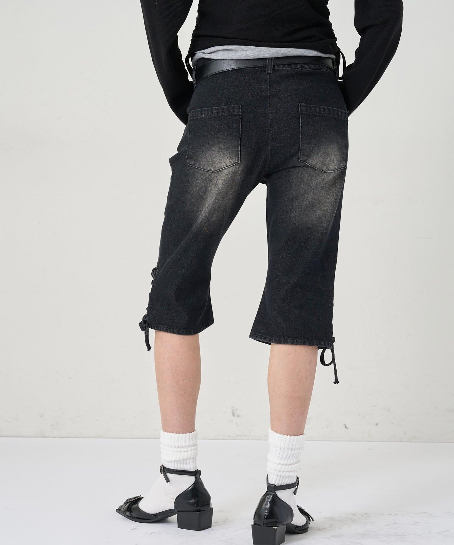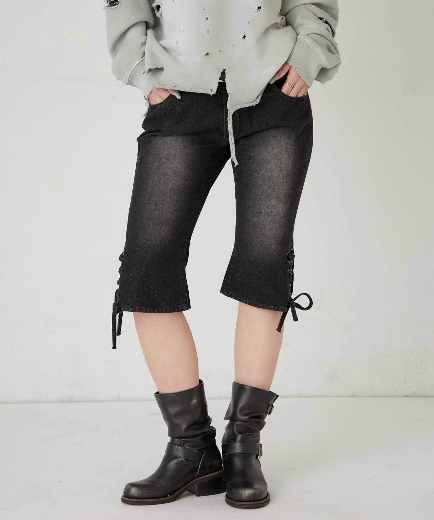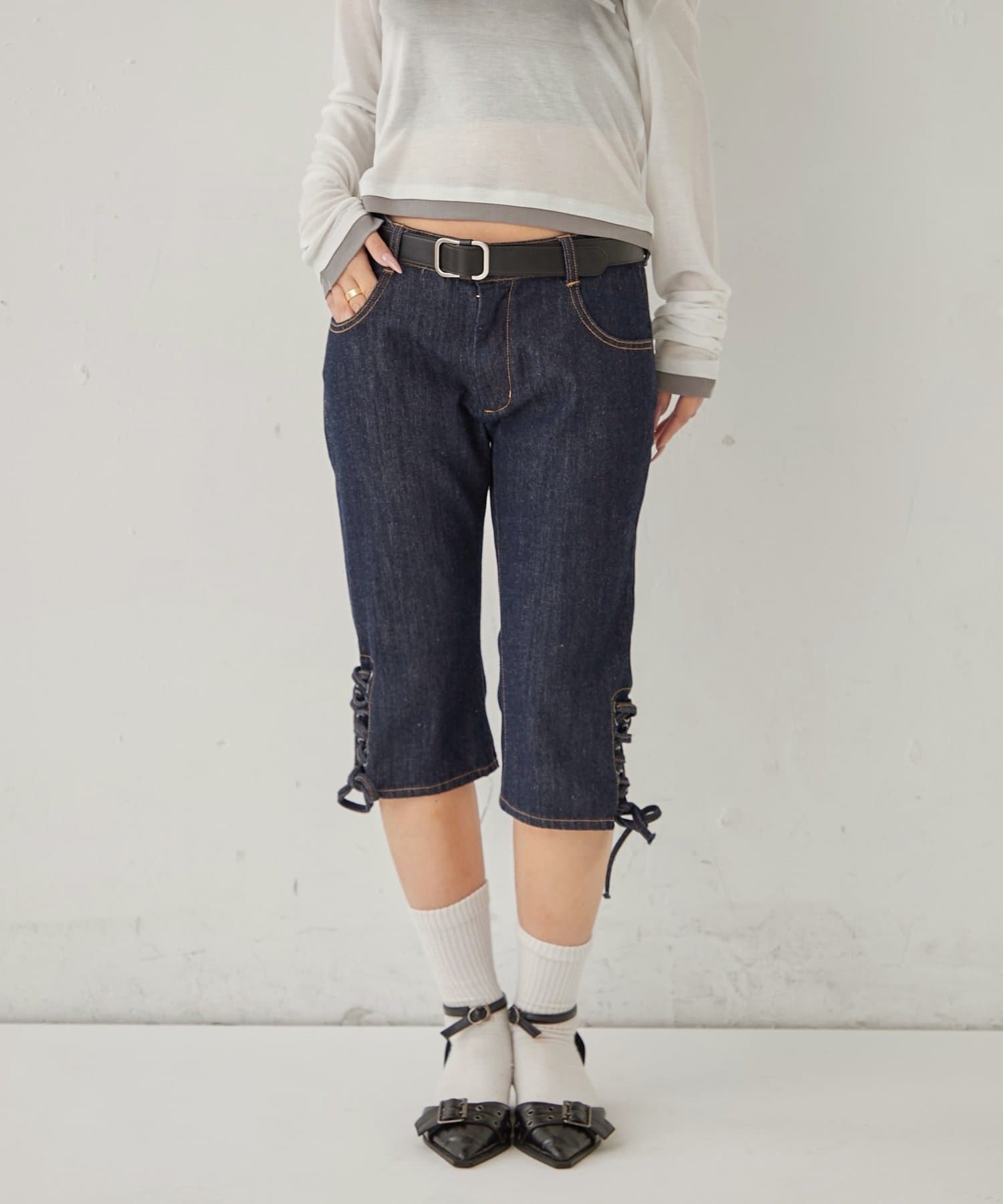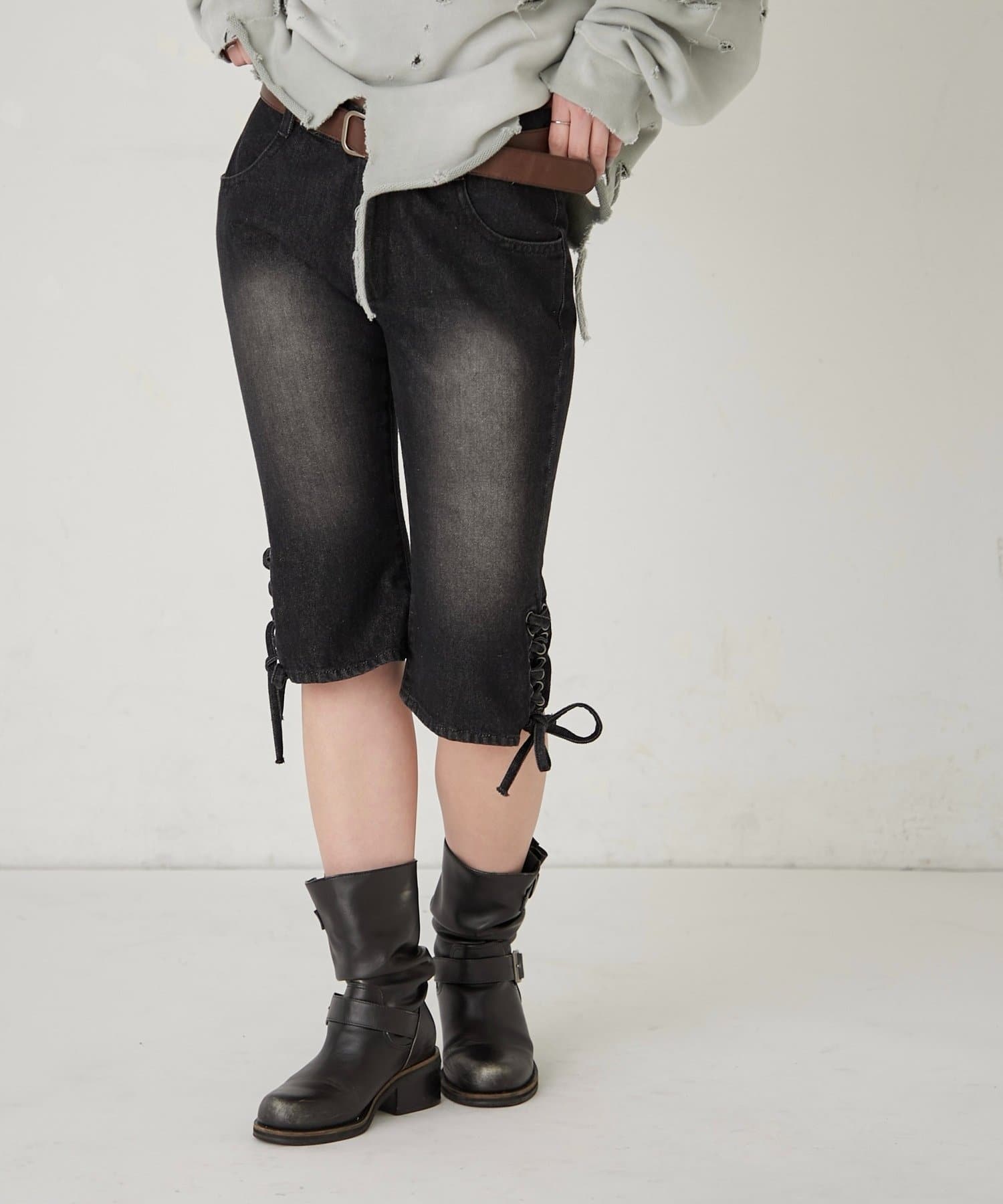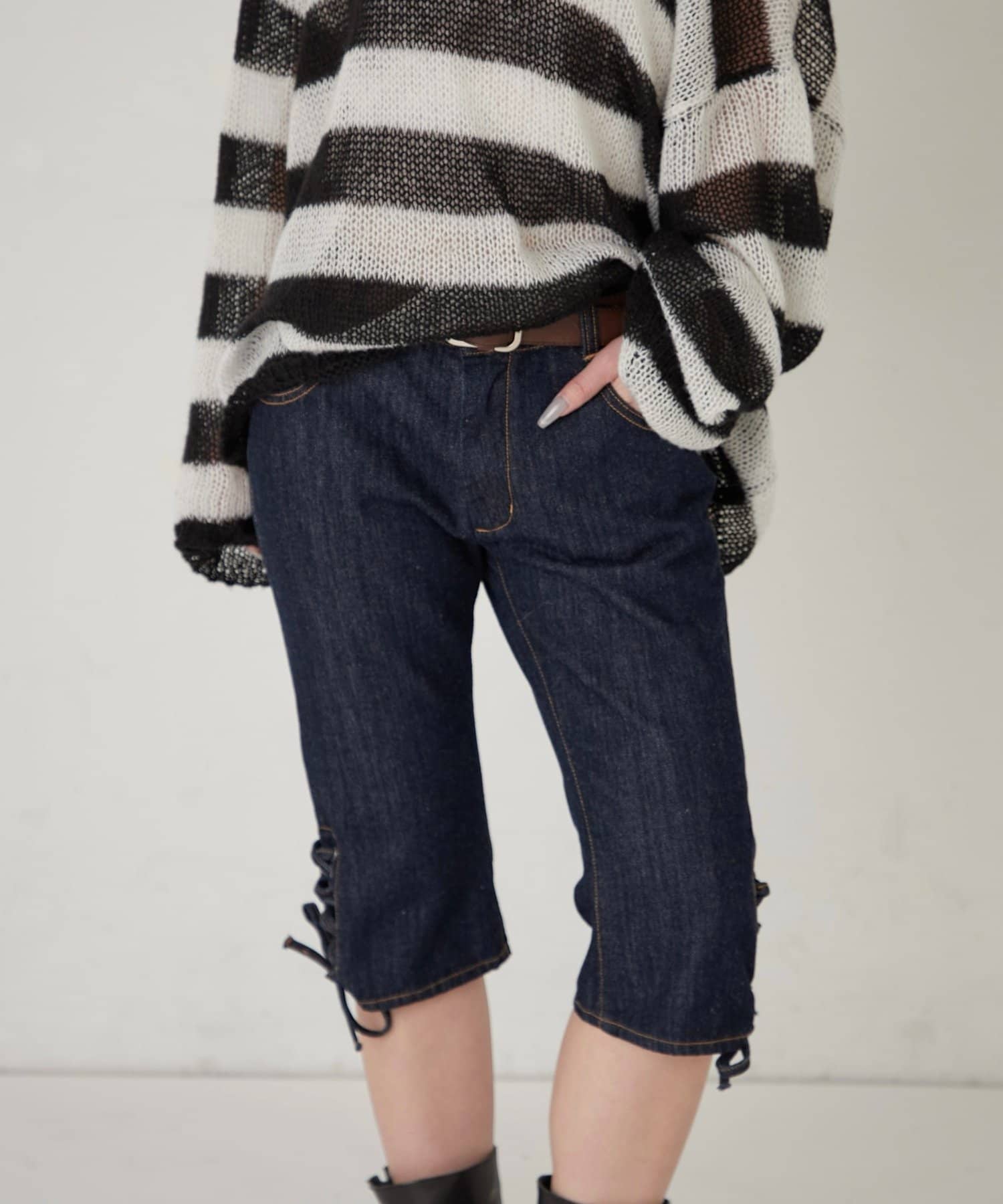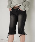・裾のレースアップがポイントのデニムカプリパンツ。