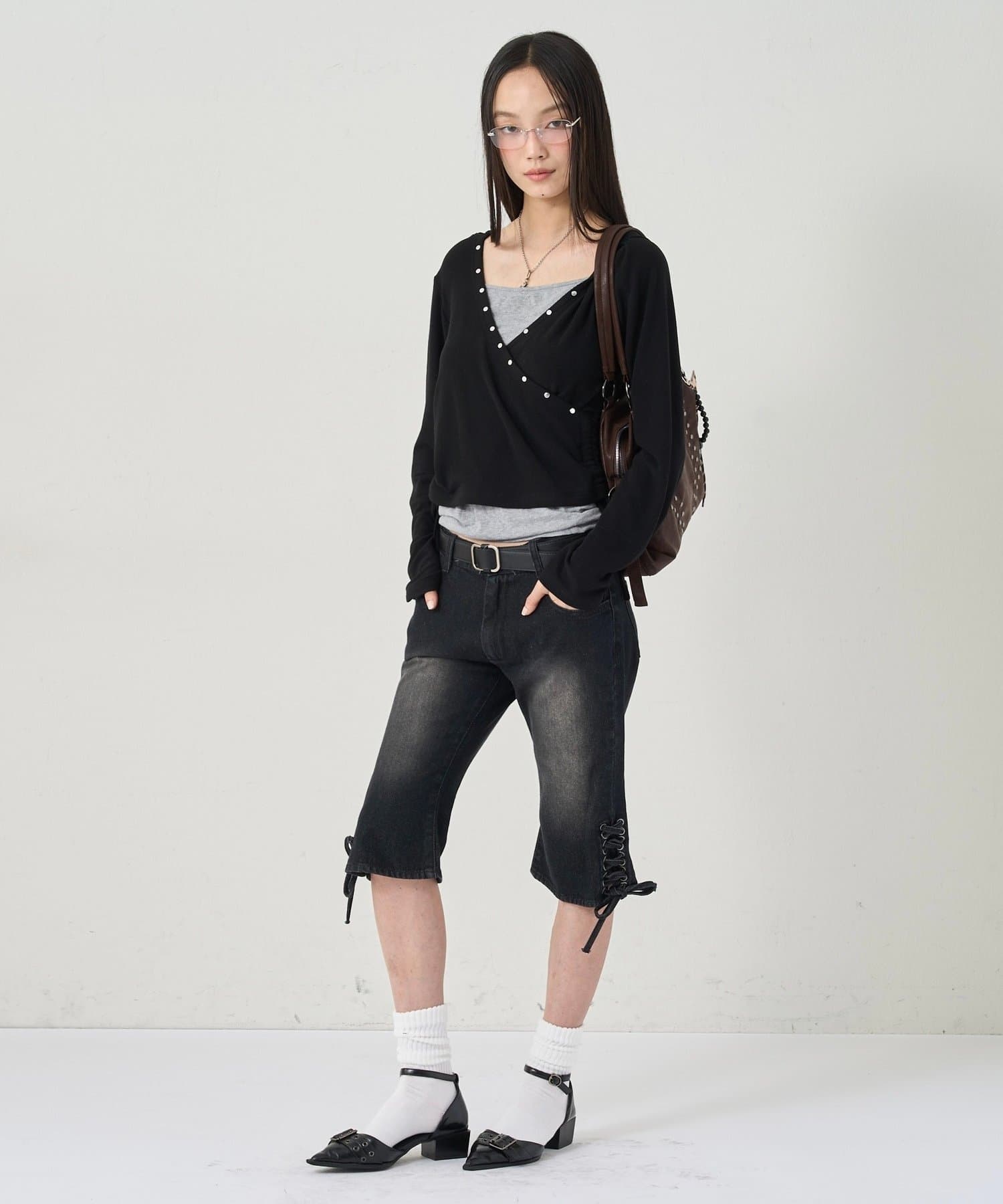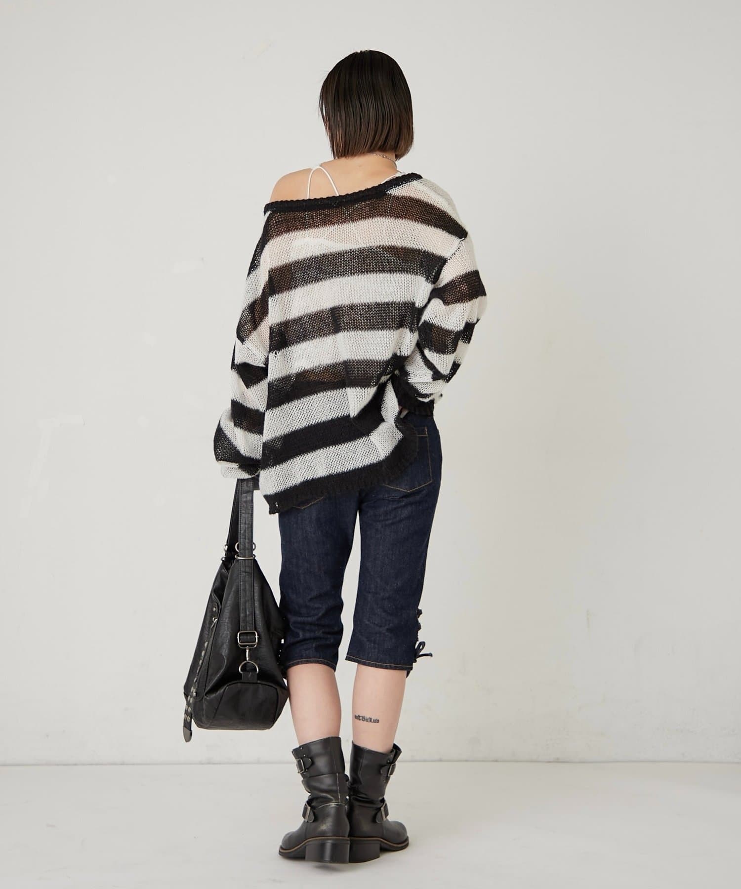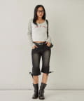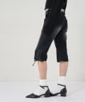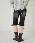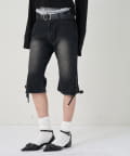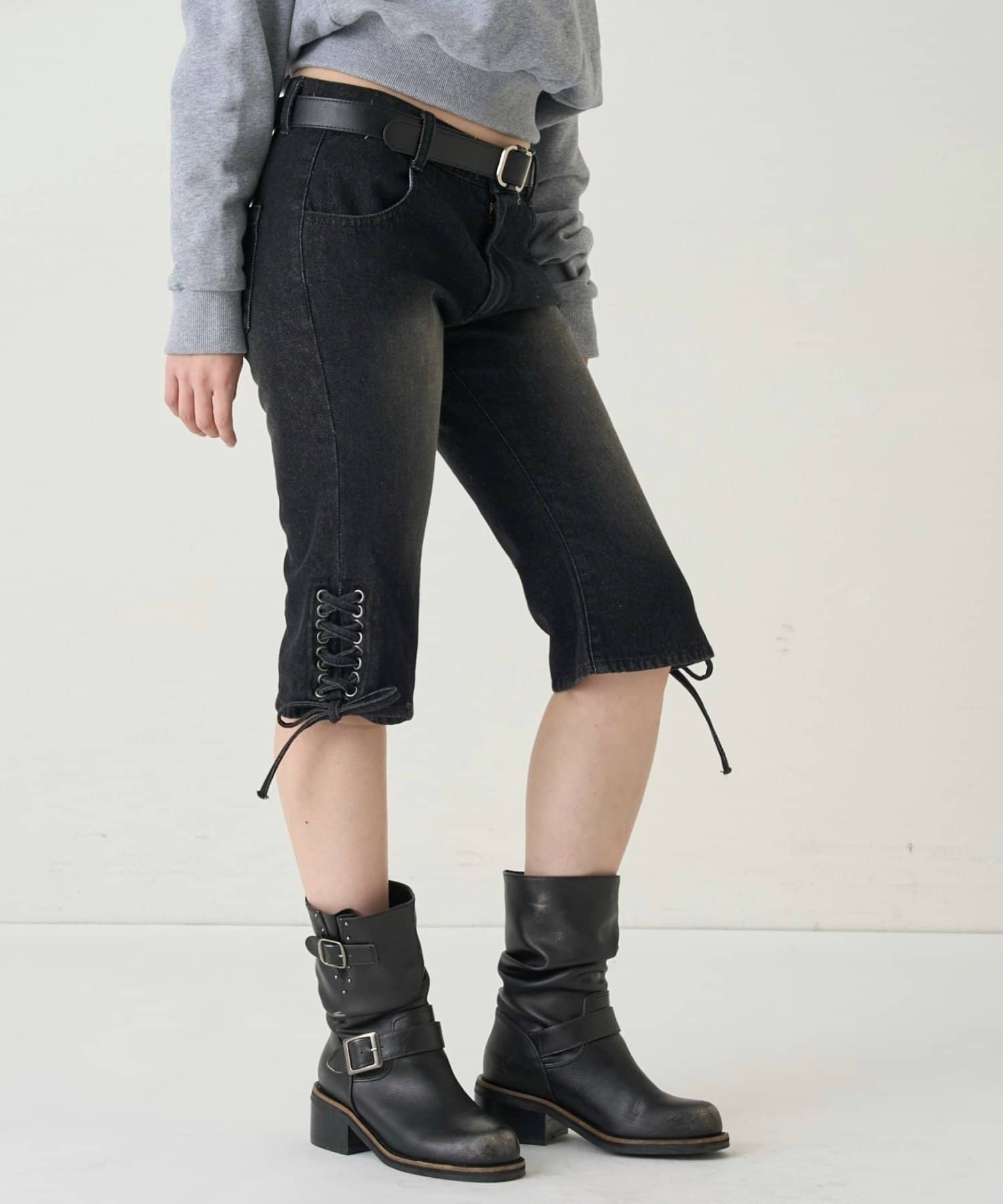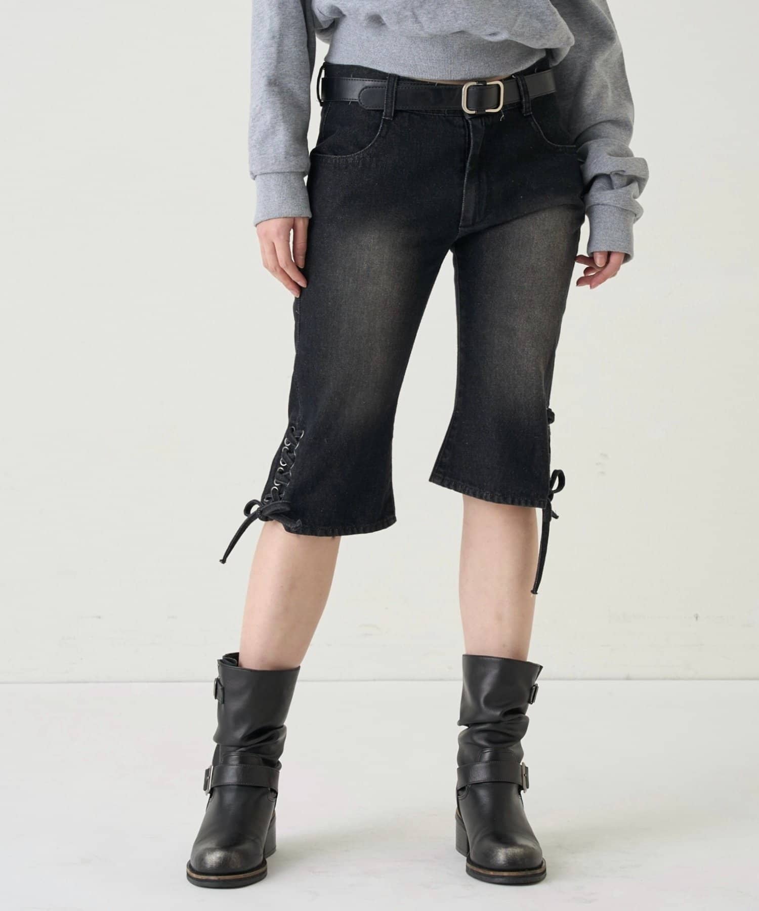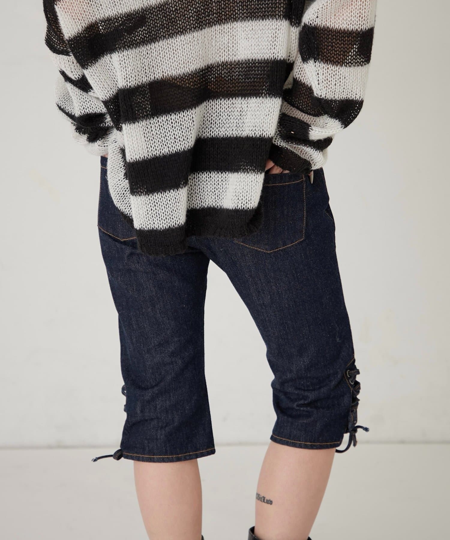 ・裾のレースアップがポイントのデニムカプリパンツ。