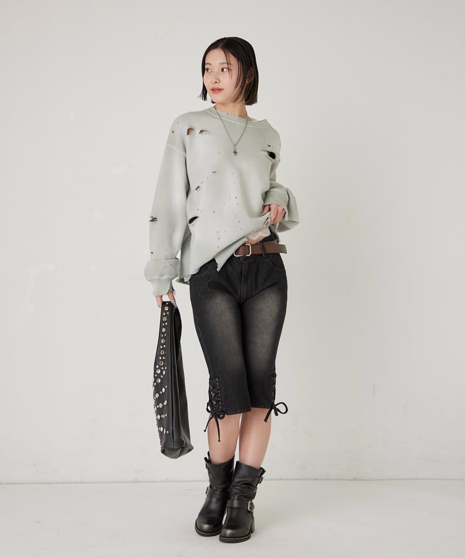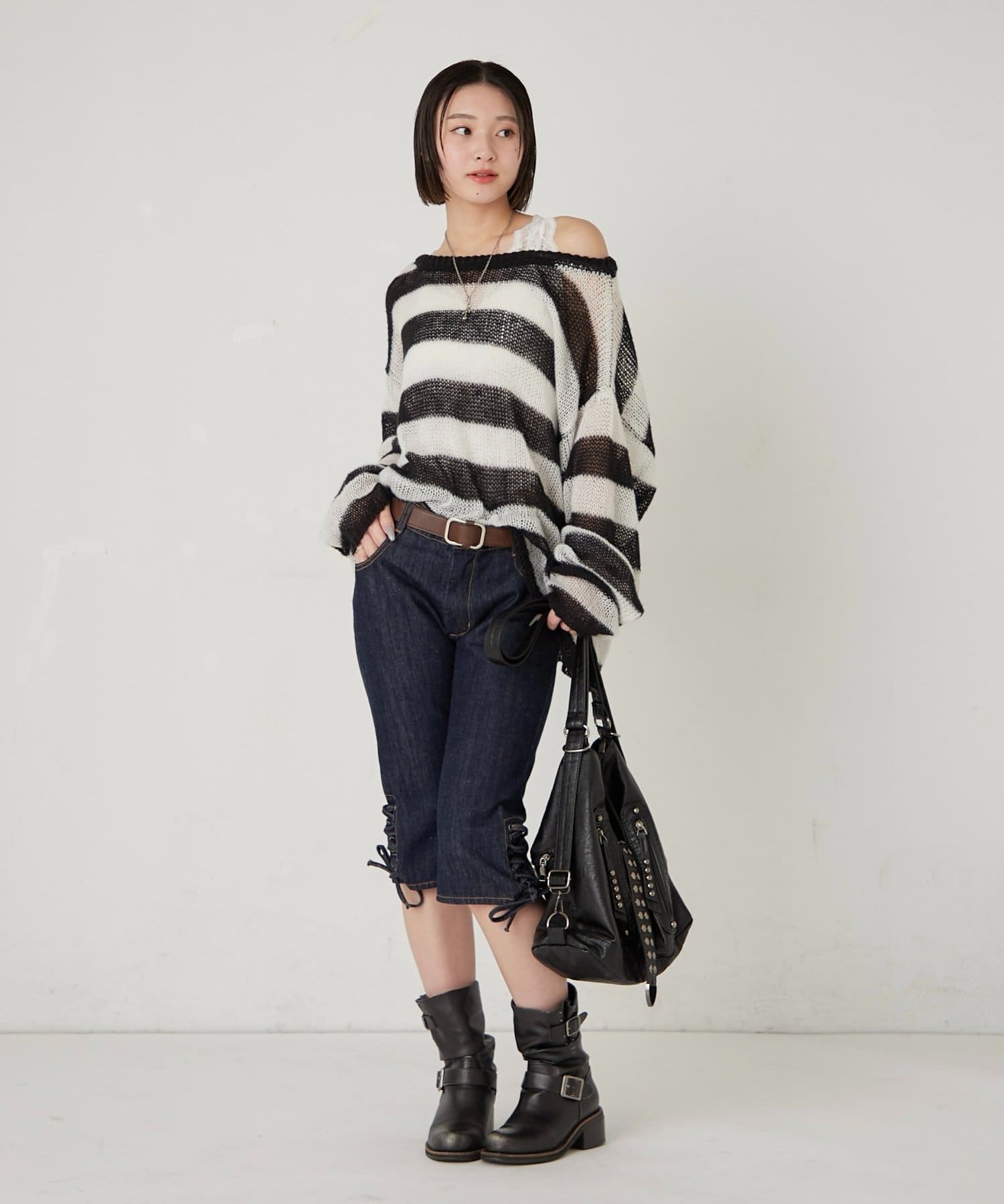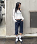 旬のレースアップ!デニムカプリで、トレンド感あふれるスタイリングに。