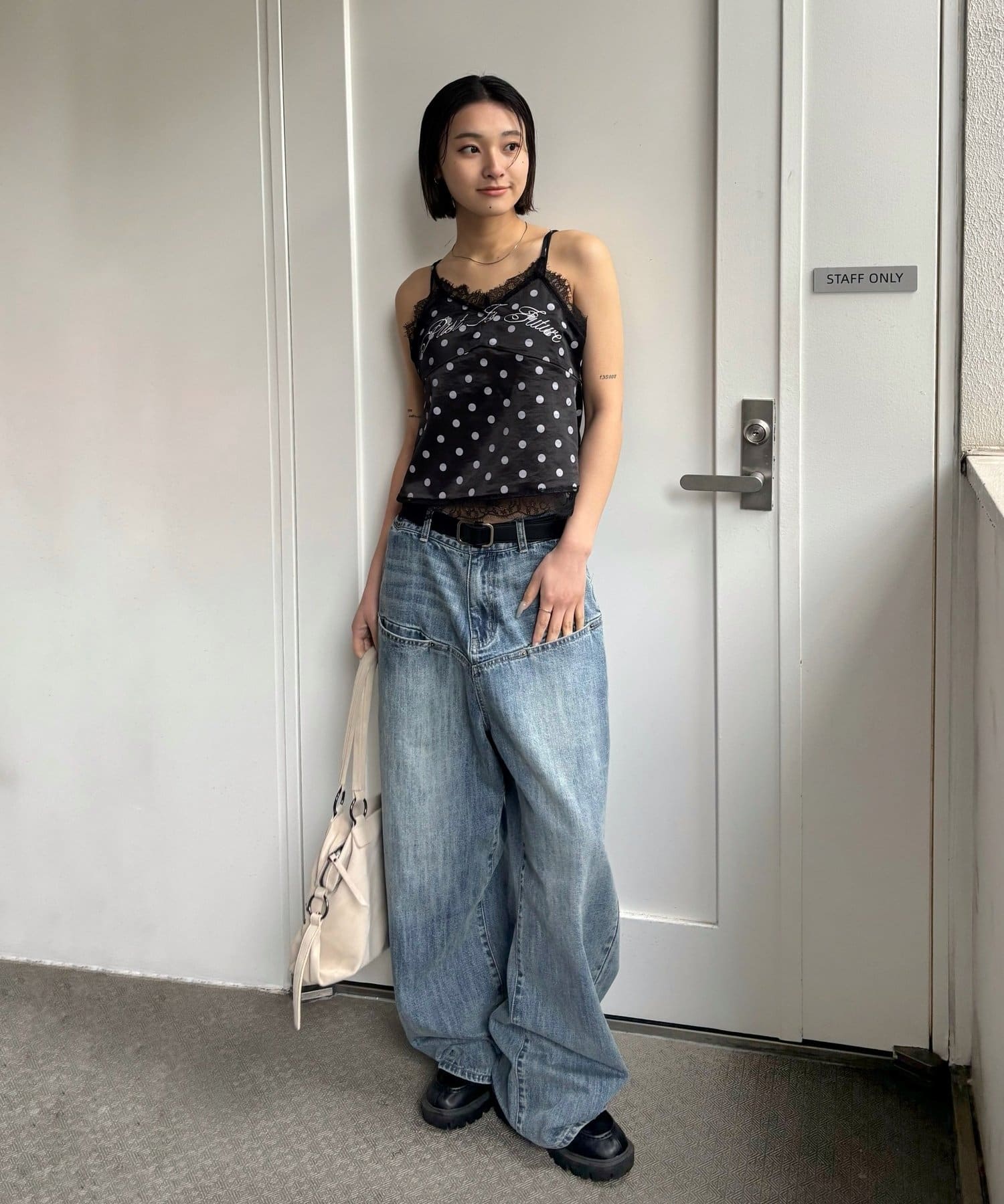 固めのデニム生地に柔らかいサテンの生地を組み合わせて甘め要素を残しつつカジュアルな印象に