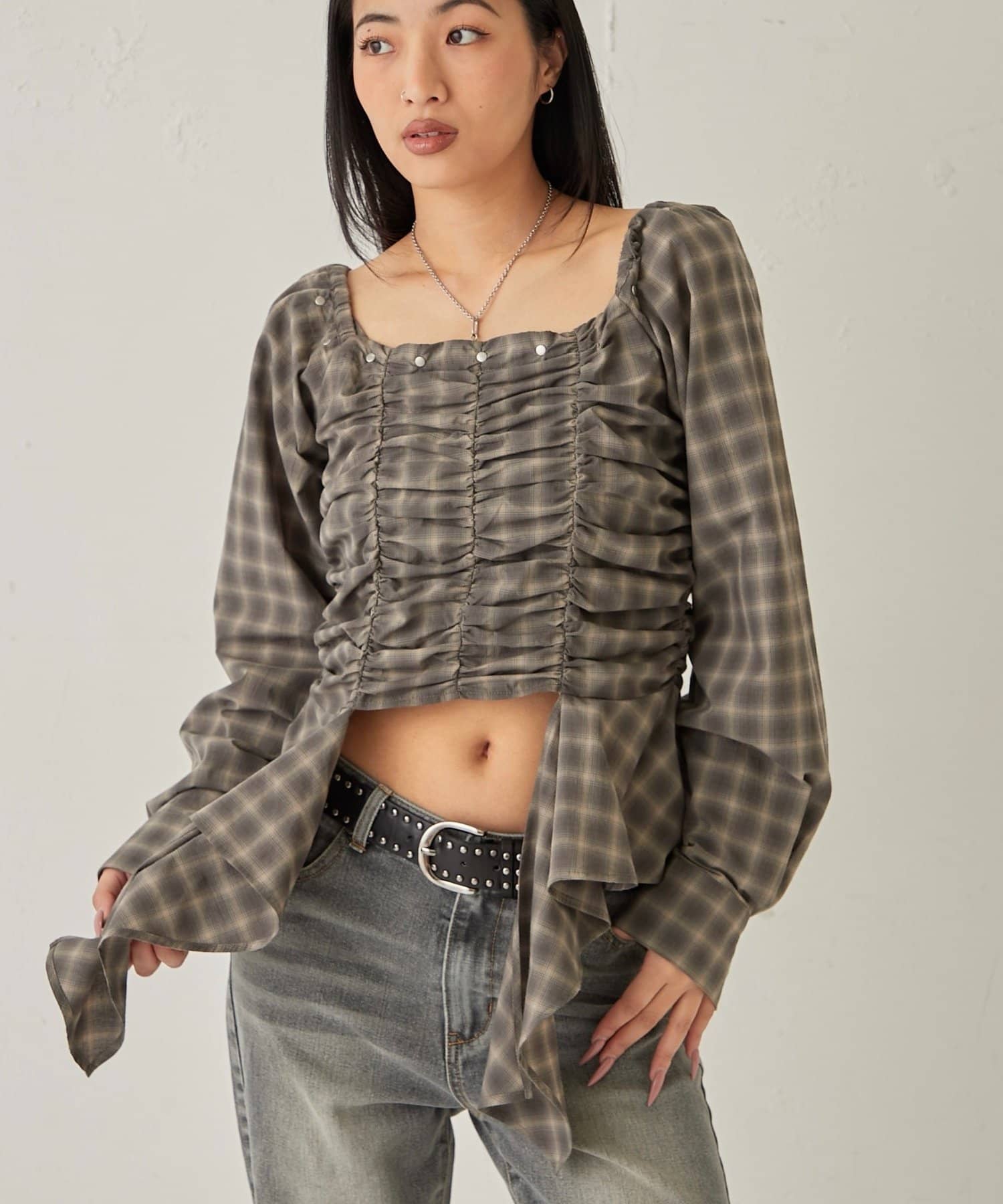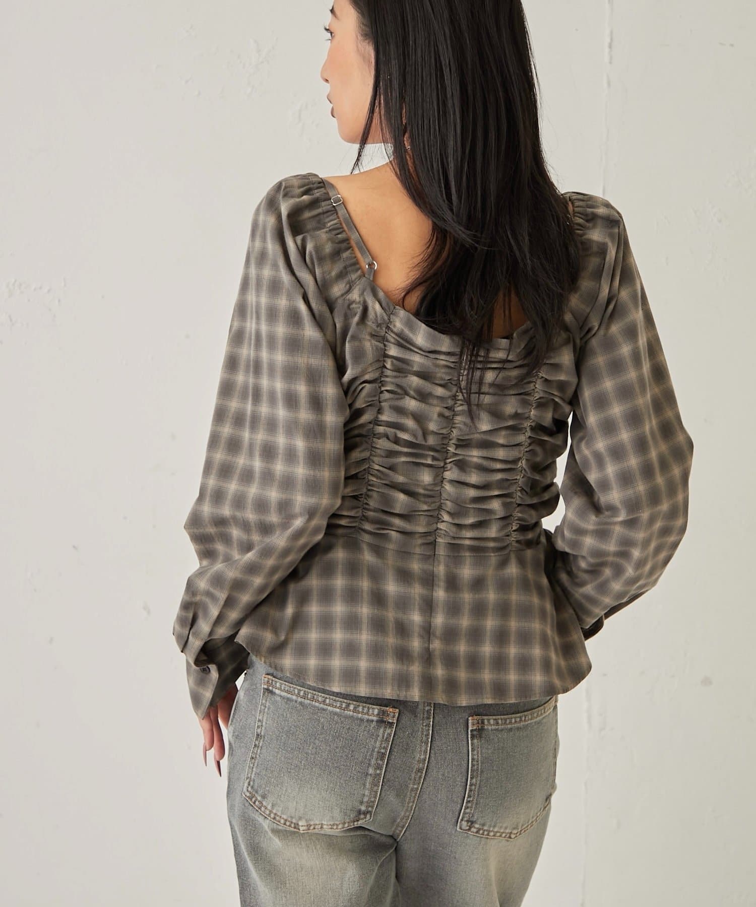 ・胸元のギャザーが女性らしいシルエットを演出し、華奢見え効果も期待できます。