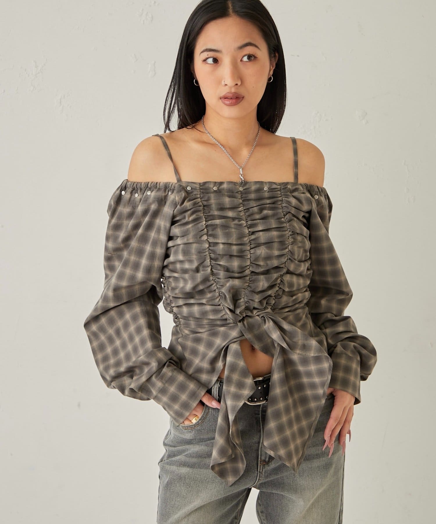 【ASYM HEM GATHER OFF-SHOULDER BLOUSE/イレヘムギャザーオフショルブラウス】