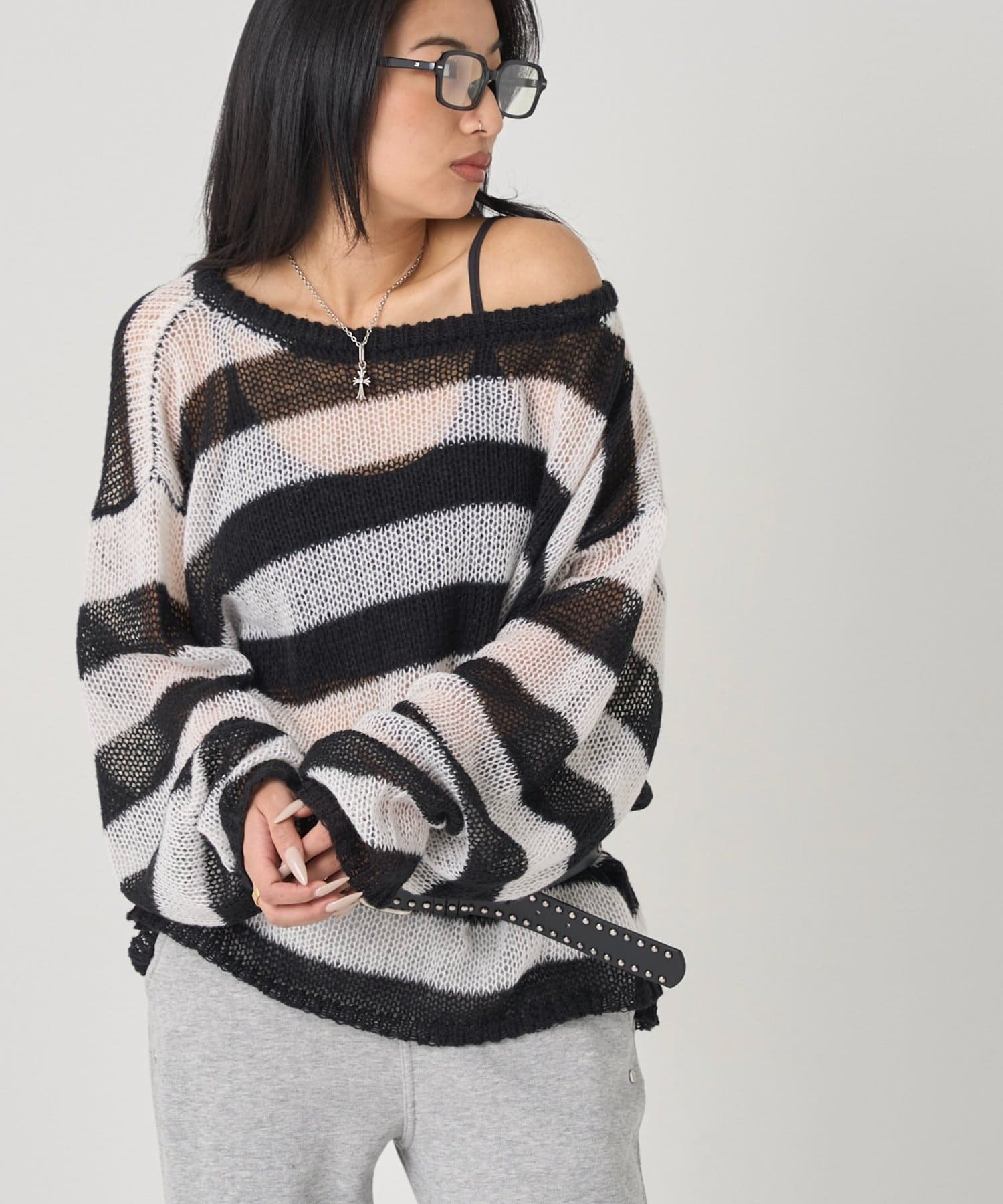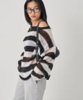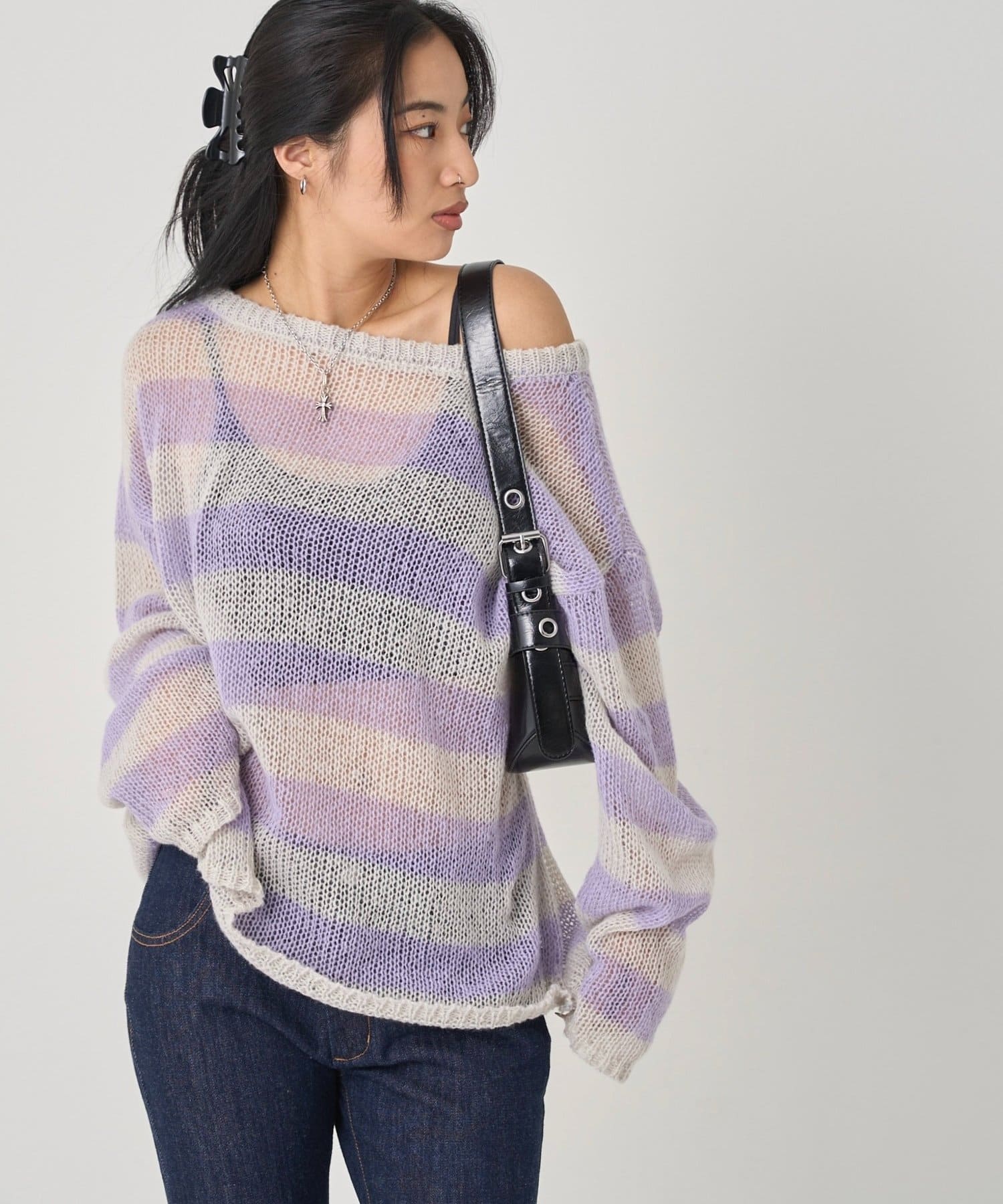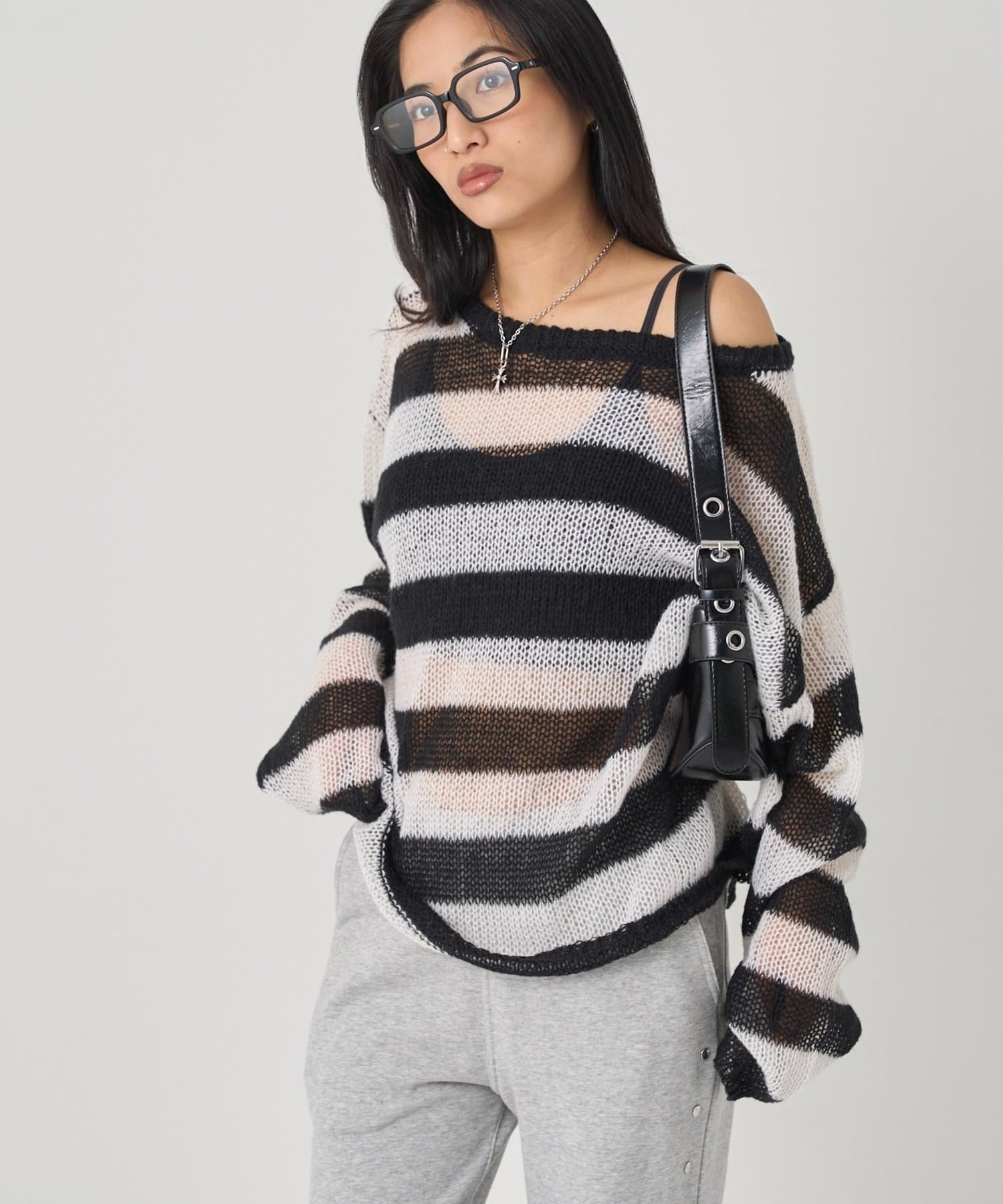 ・ ワンショルダーでこなれ感を演出するメッシュニット。