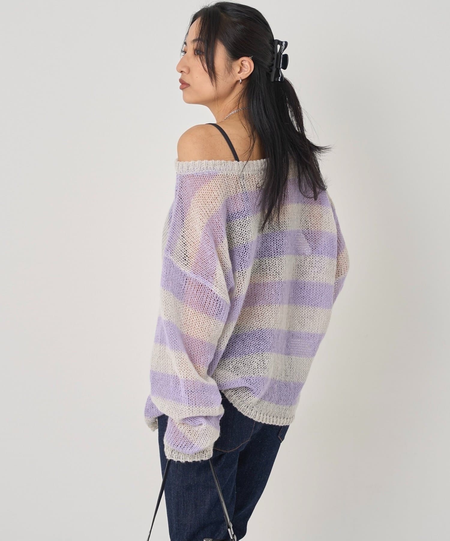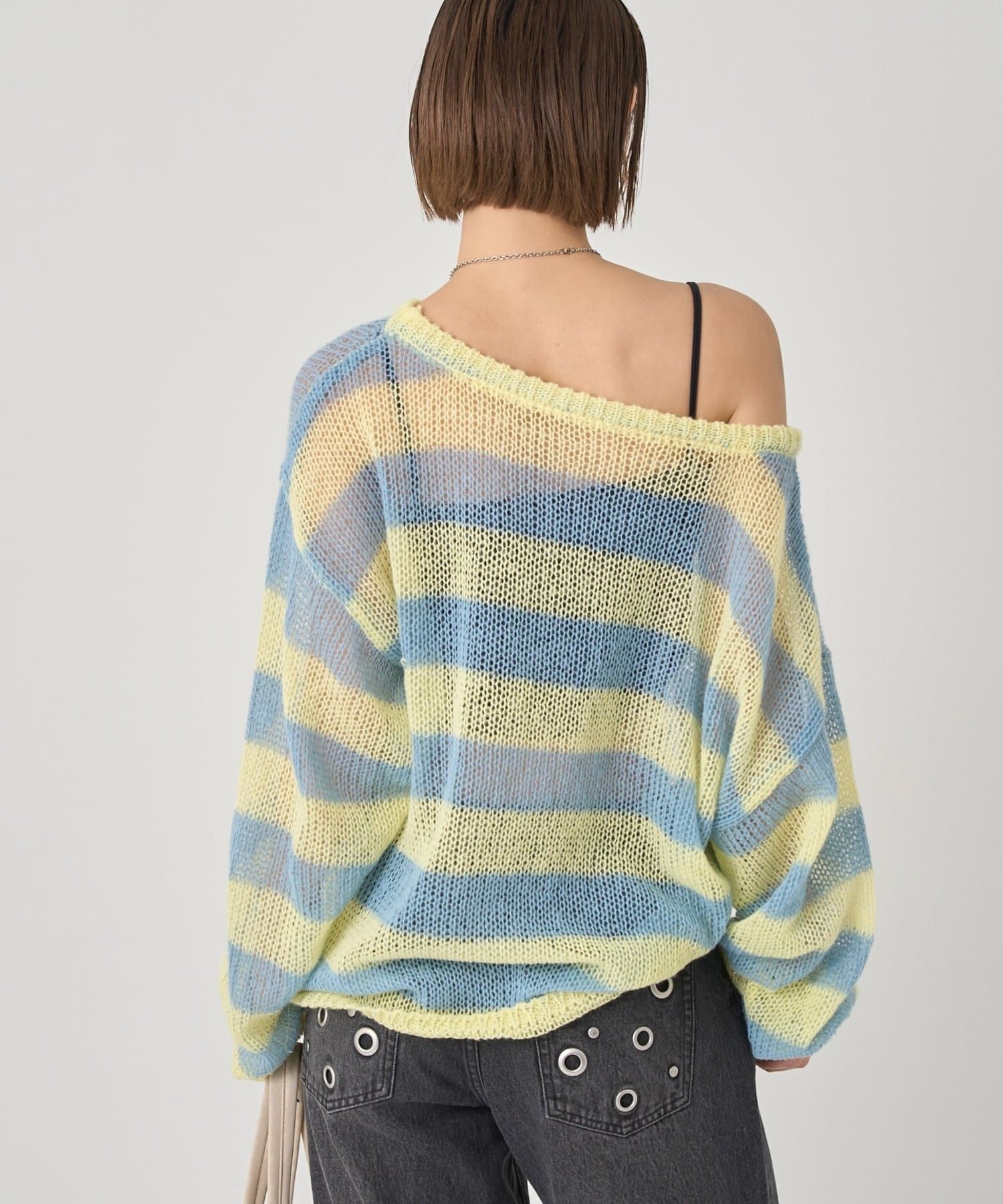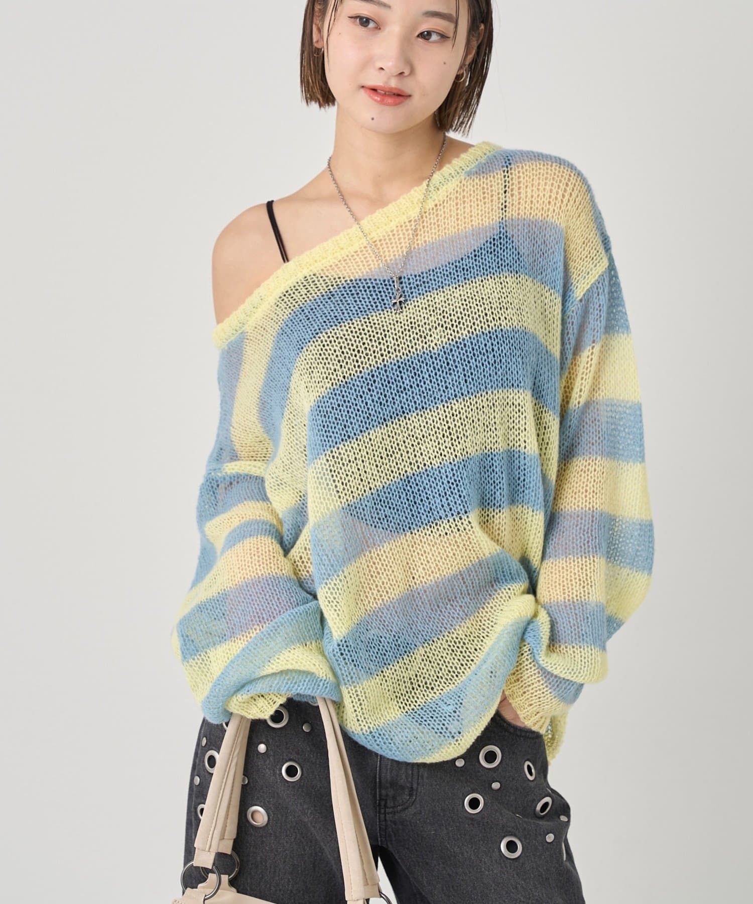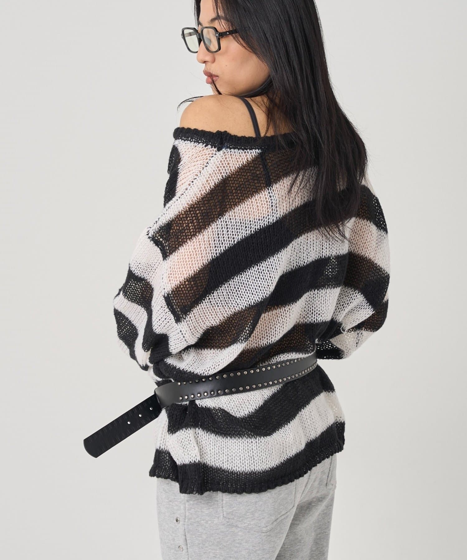 ・ ワンショルダーでこなれ感を演出するメッシュニット。