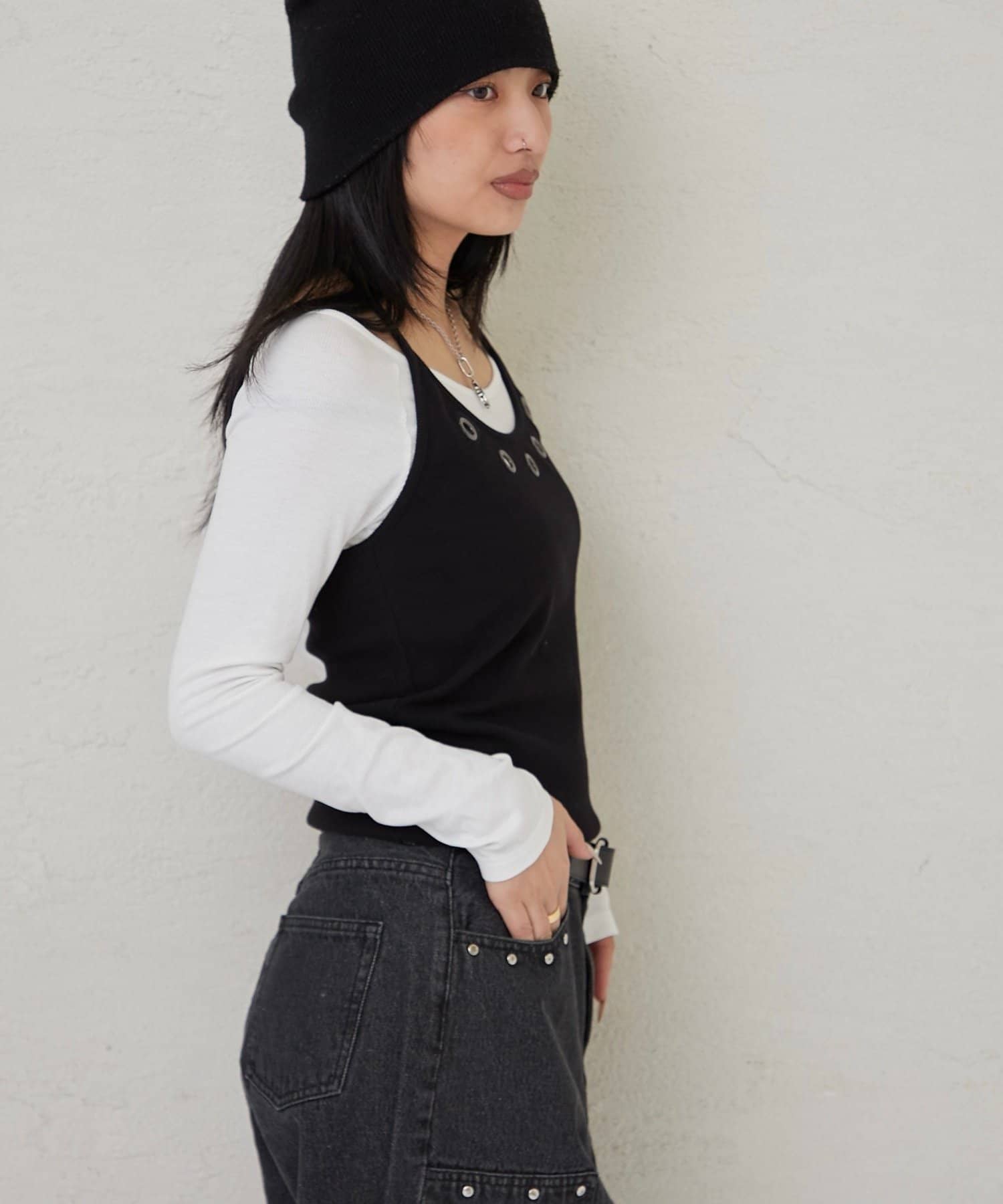 ・アイレットデザインが、かっこいい印象になり1枚で存在感のあるトップスに。