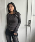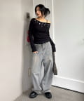 ・ ハトメデザインがアクセントになり、トレンド感のある着こなしに。