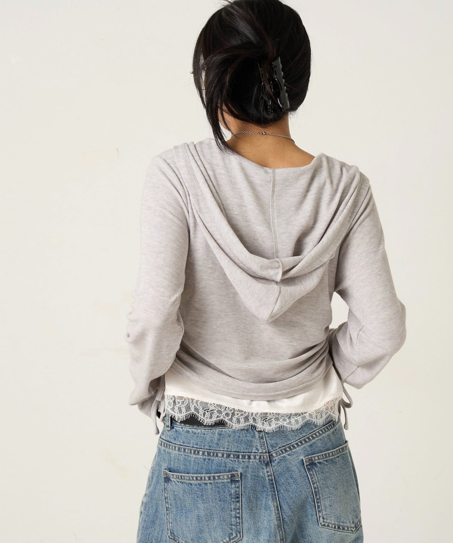 ・ リブ素材を使用した、カジュアルながらも女性らしい印象のフーディ。