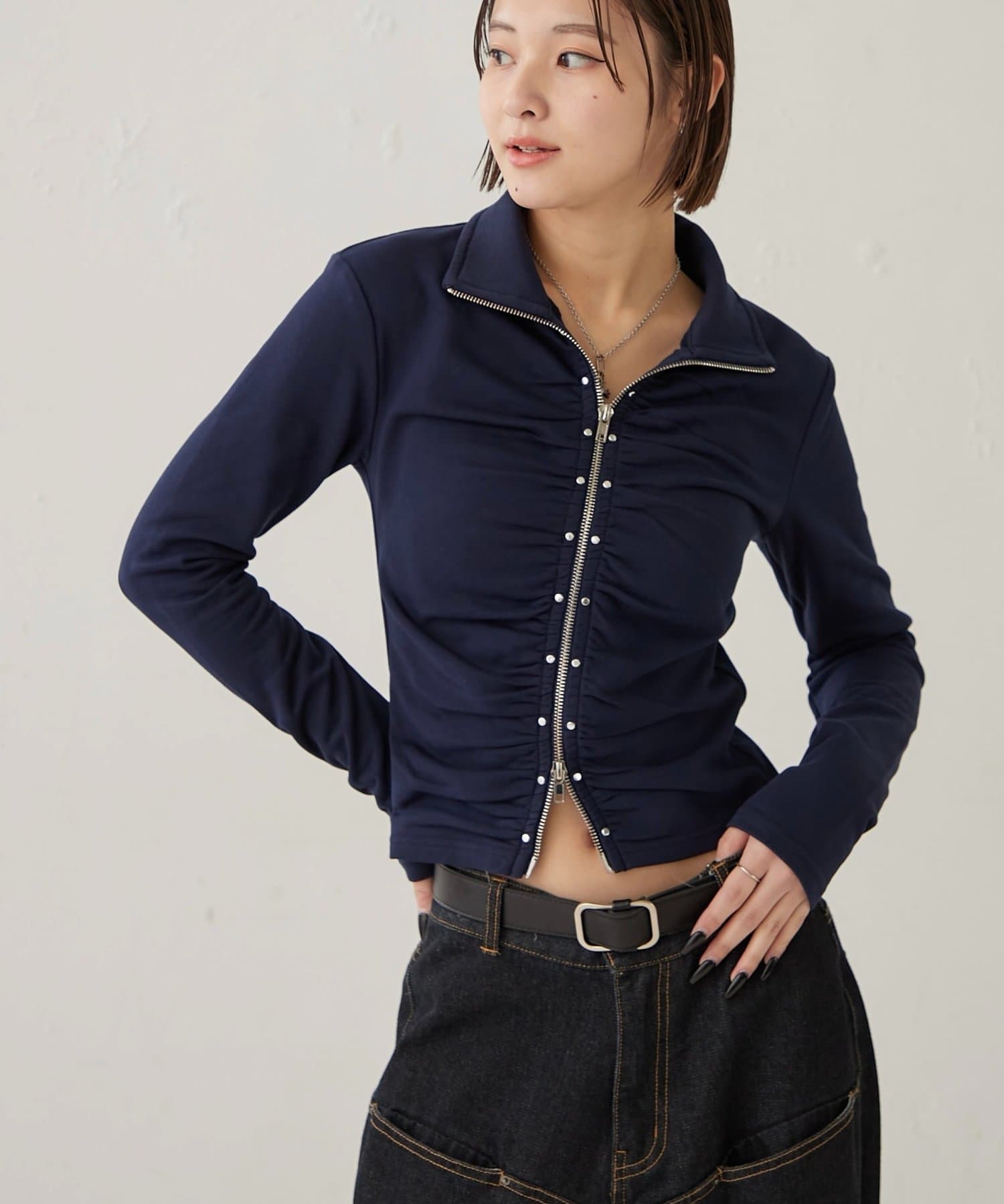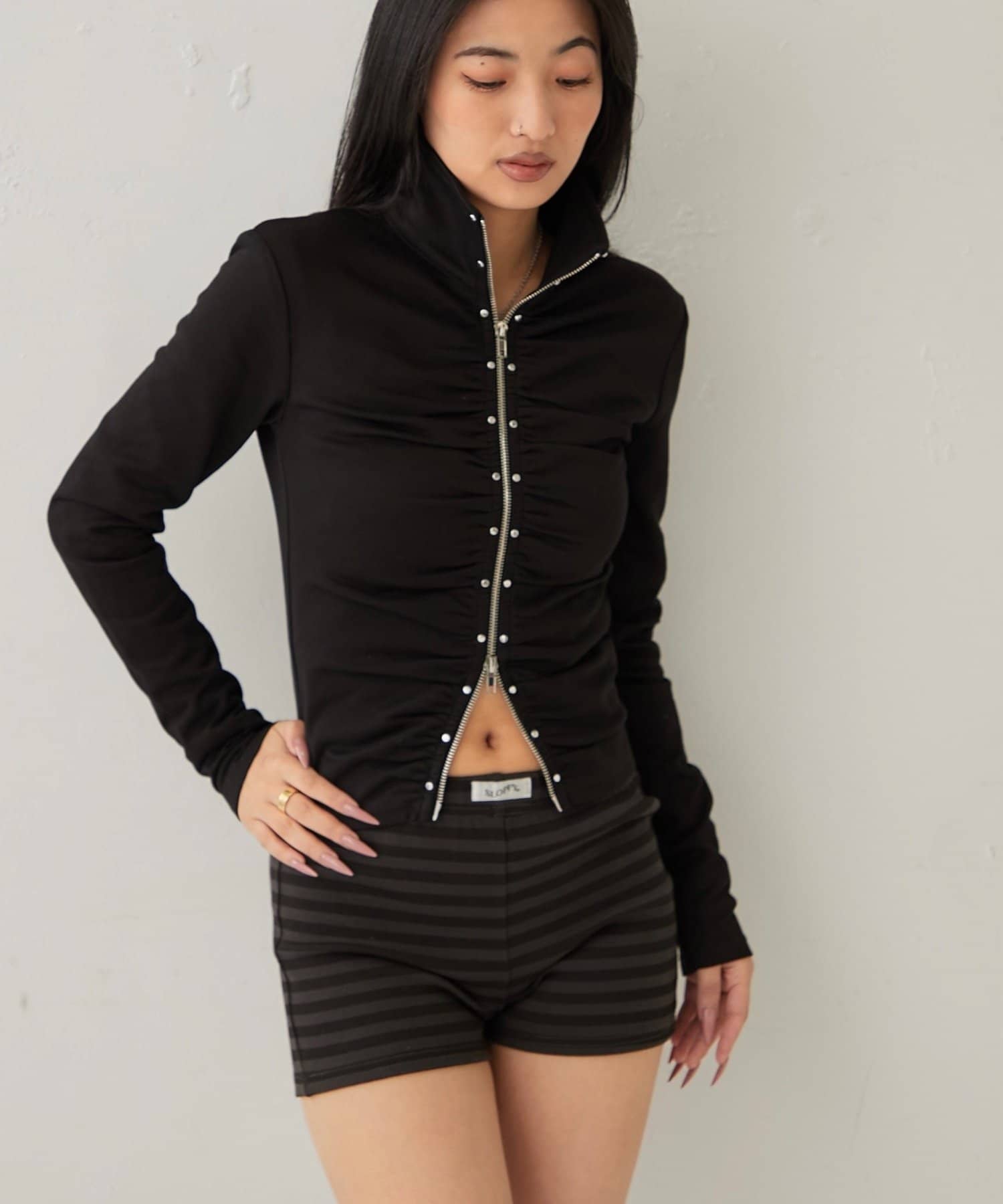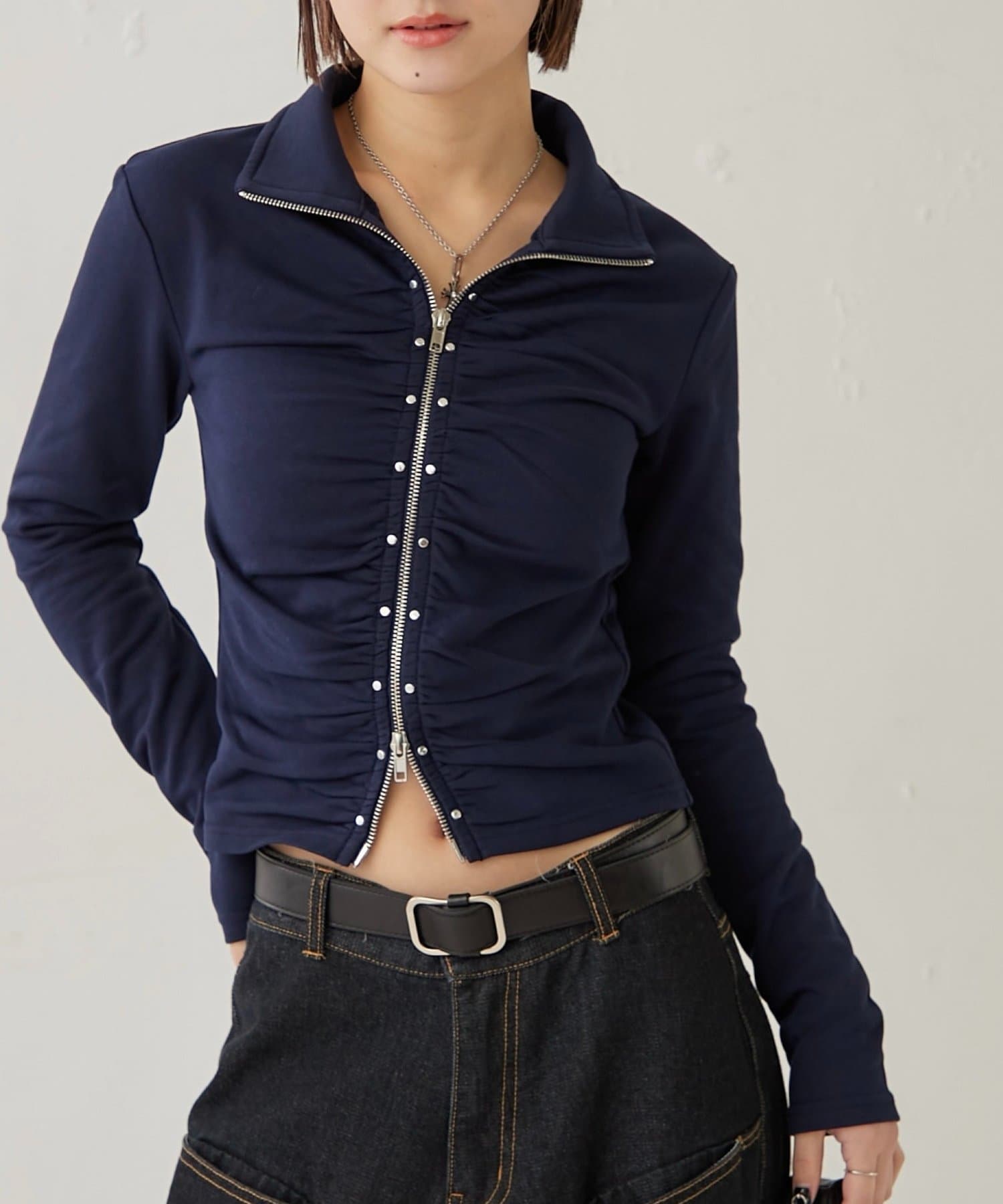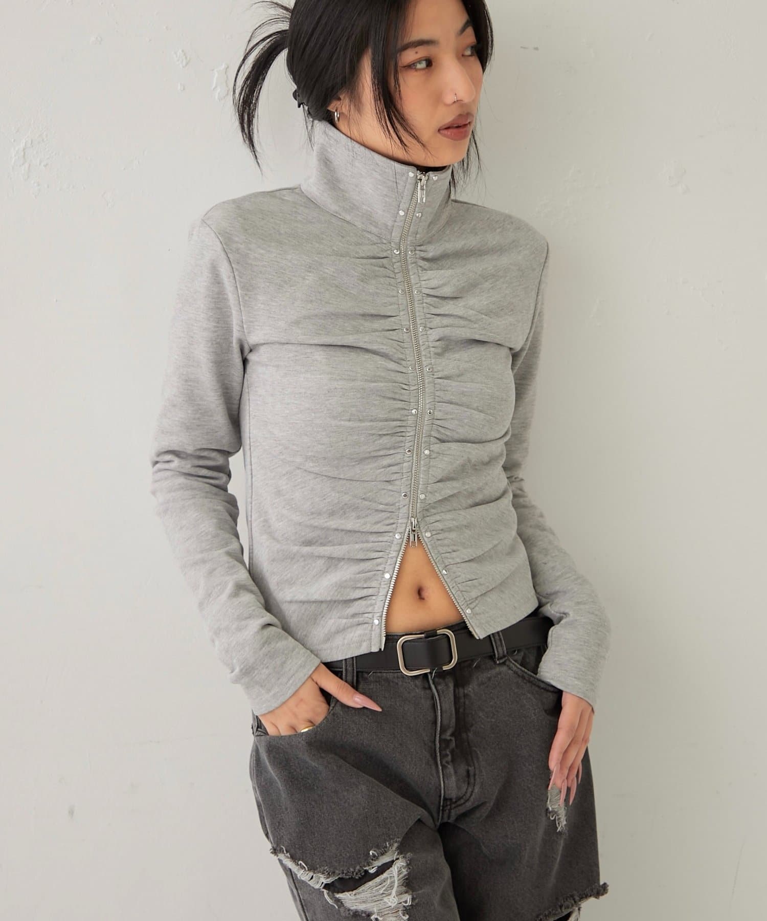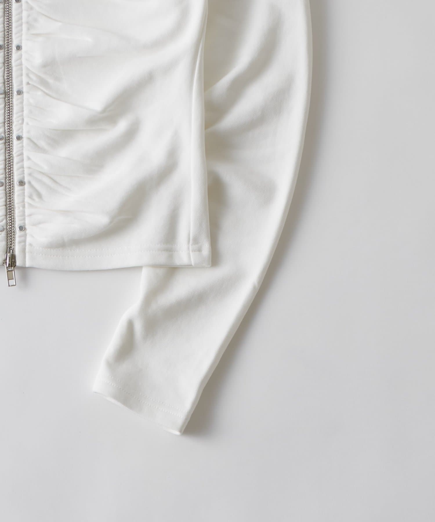 【STUDDED ZIP GATHERED TOP/スタッズジップギャザートップス】