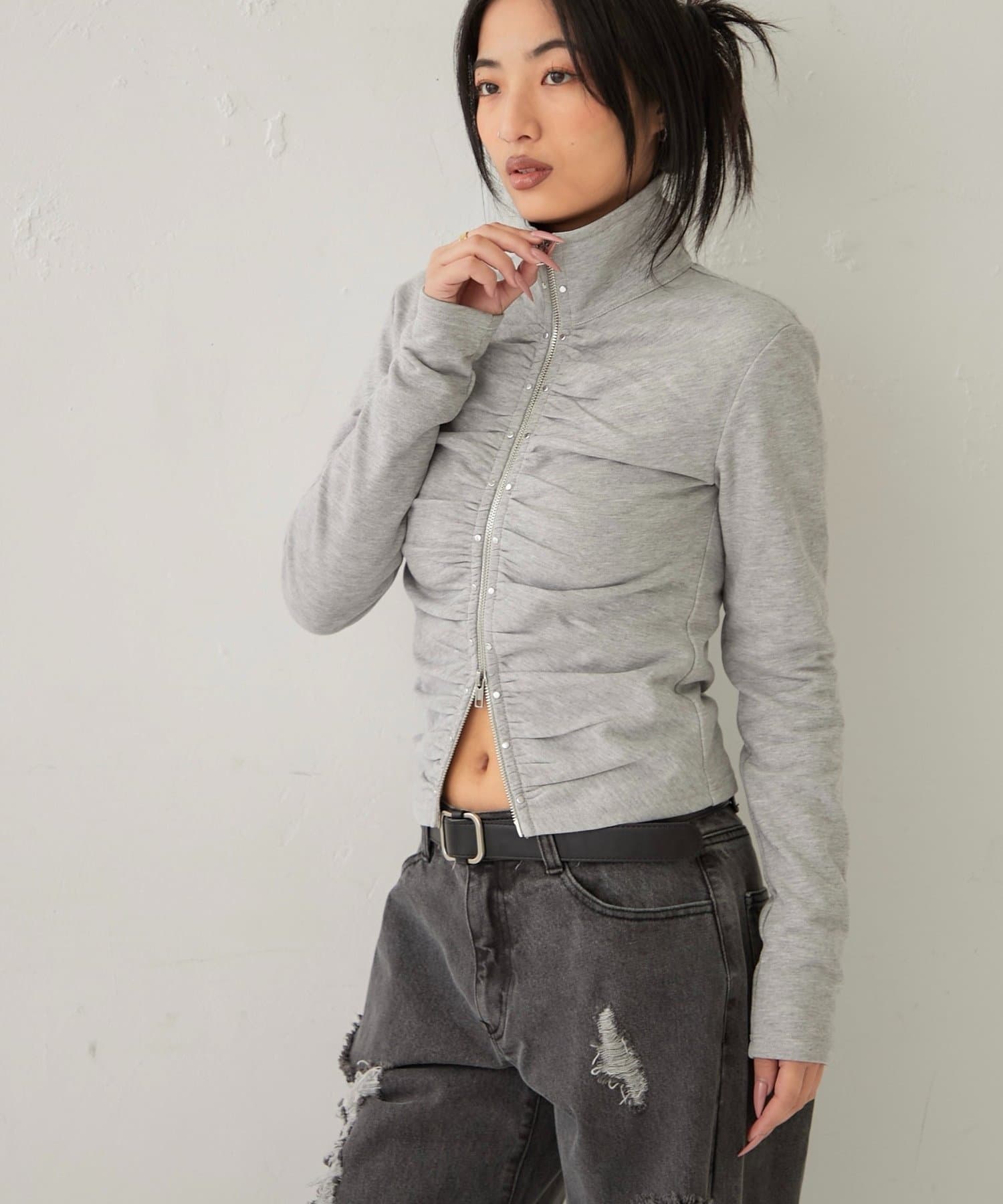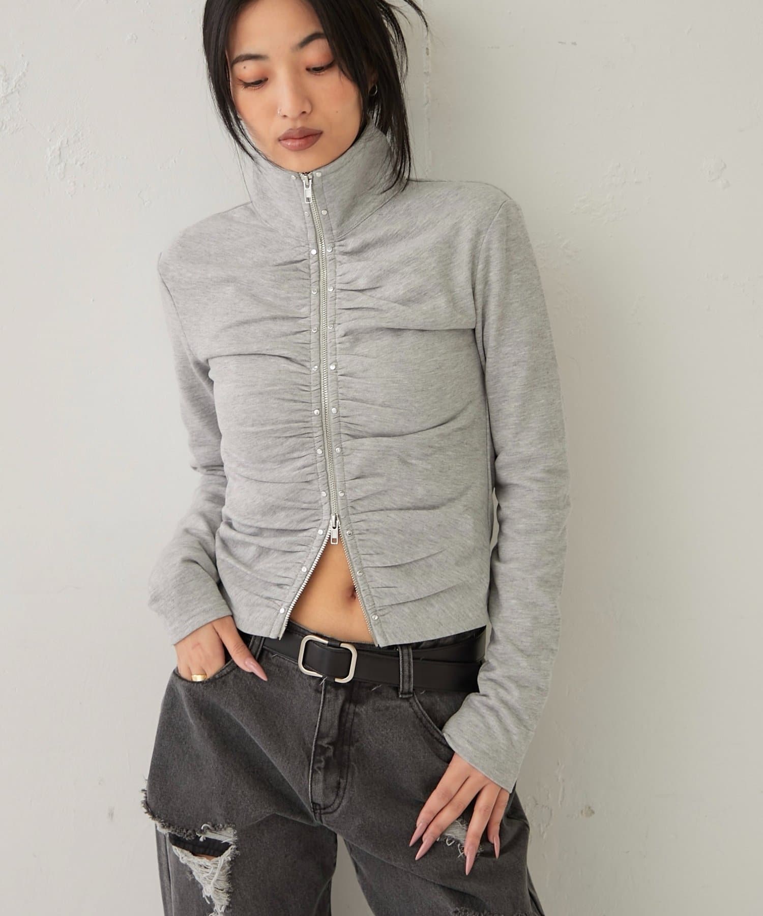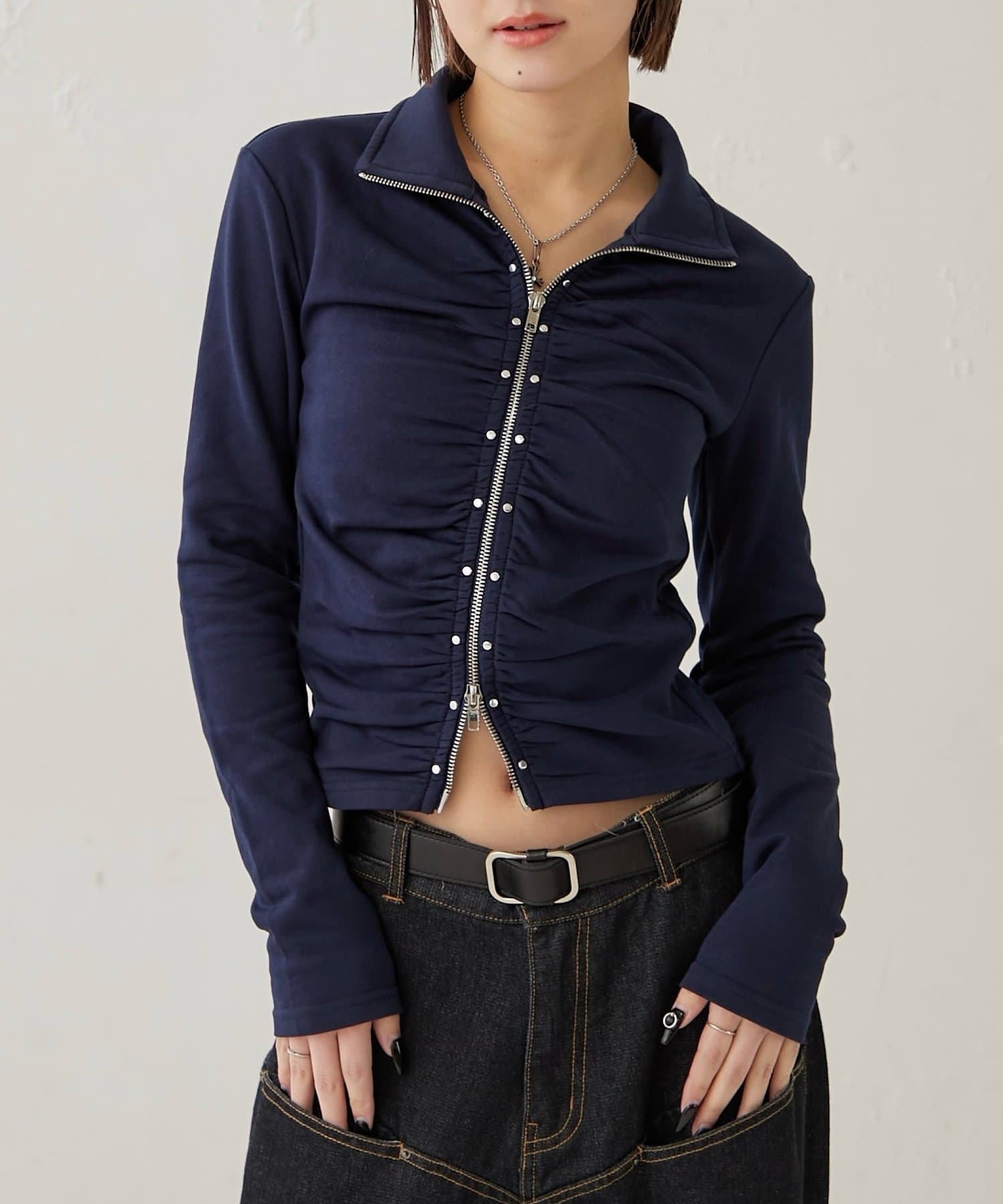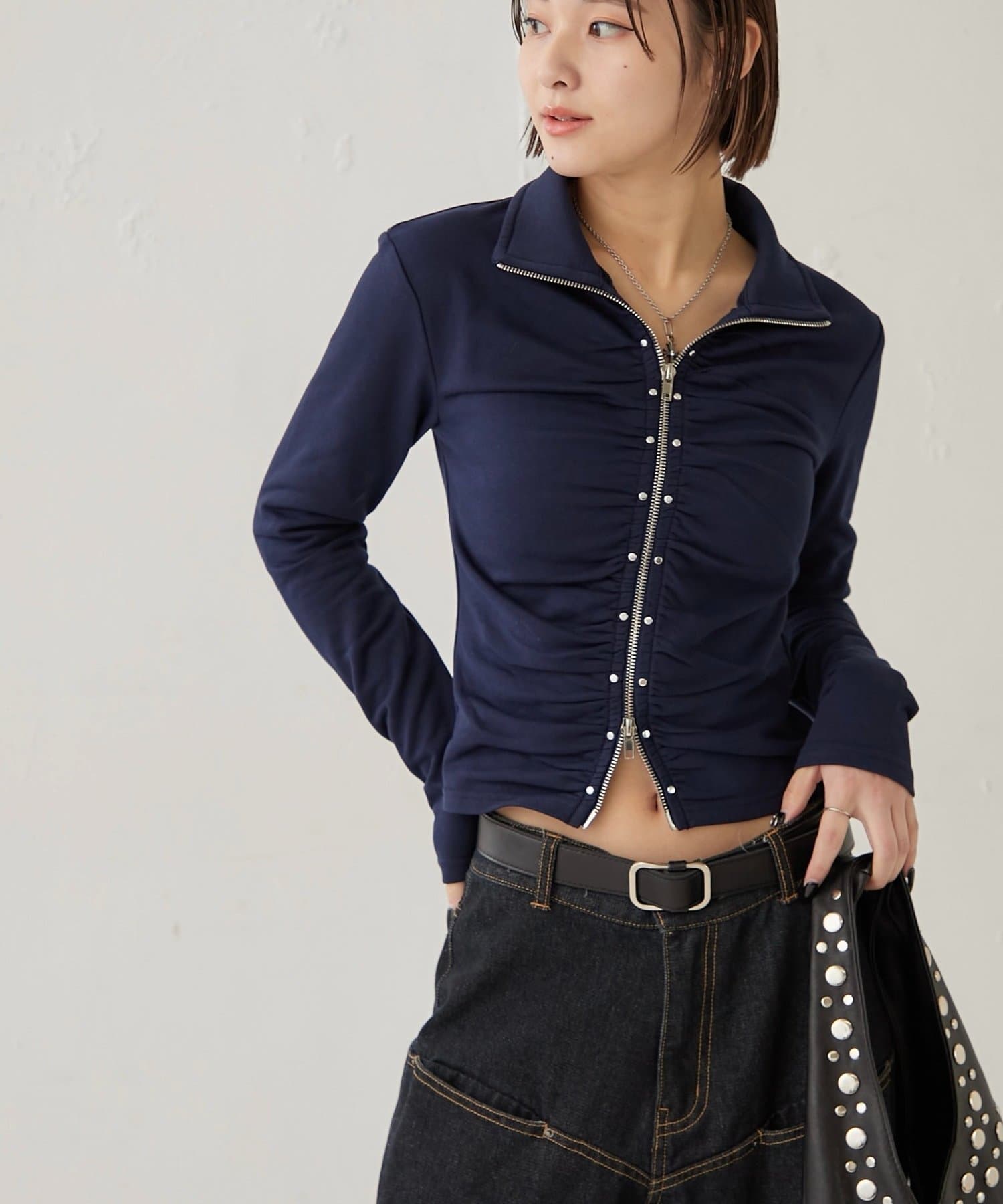 【STUDDED ZIP GATHERED TOP/スタッズジップギャザートップス】