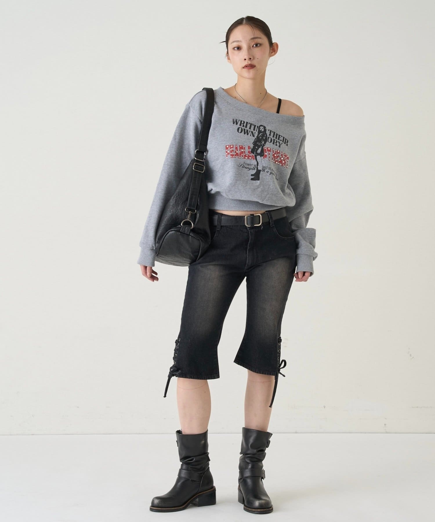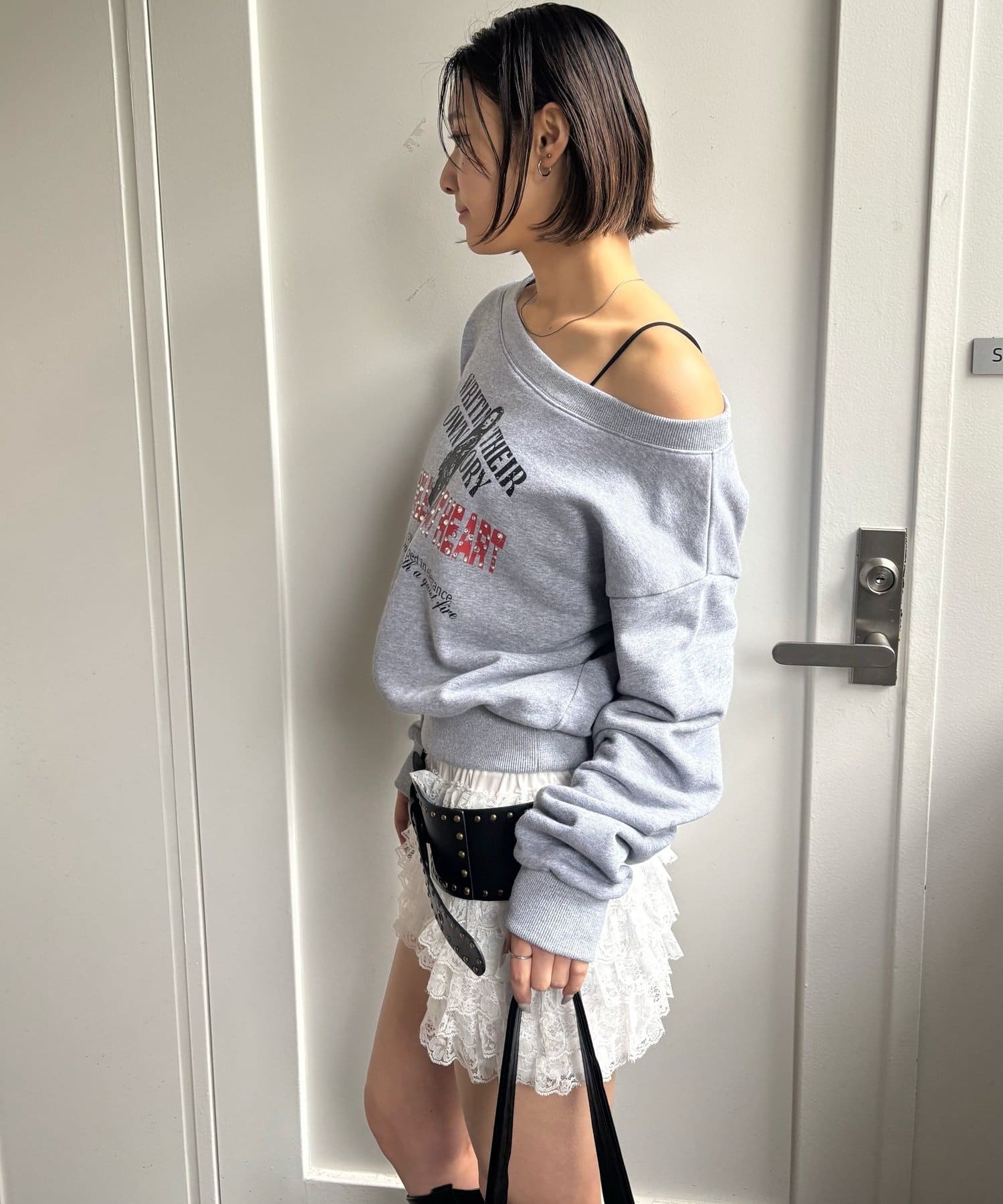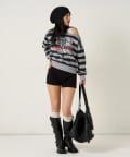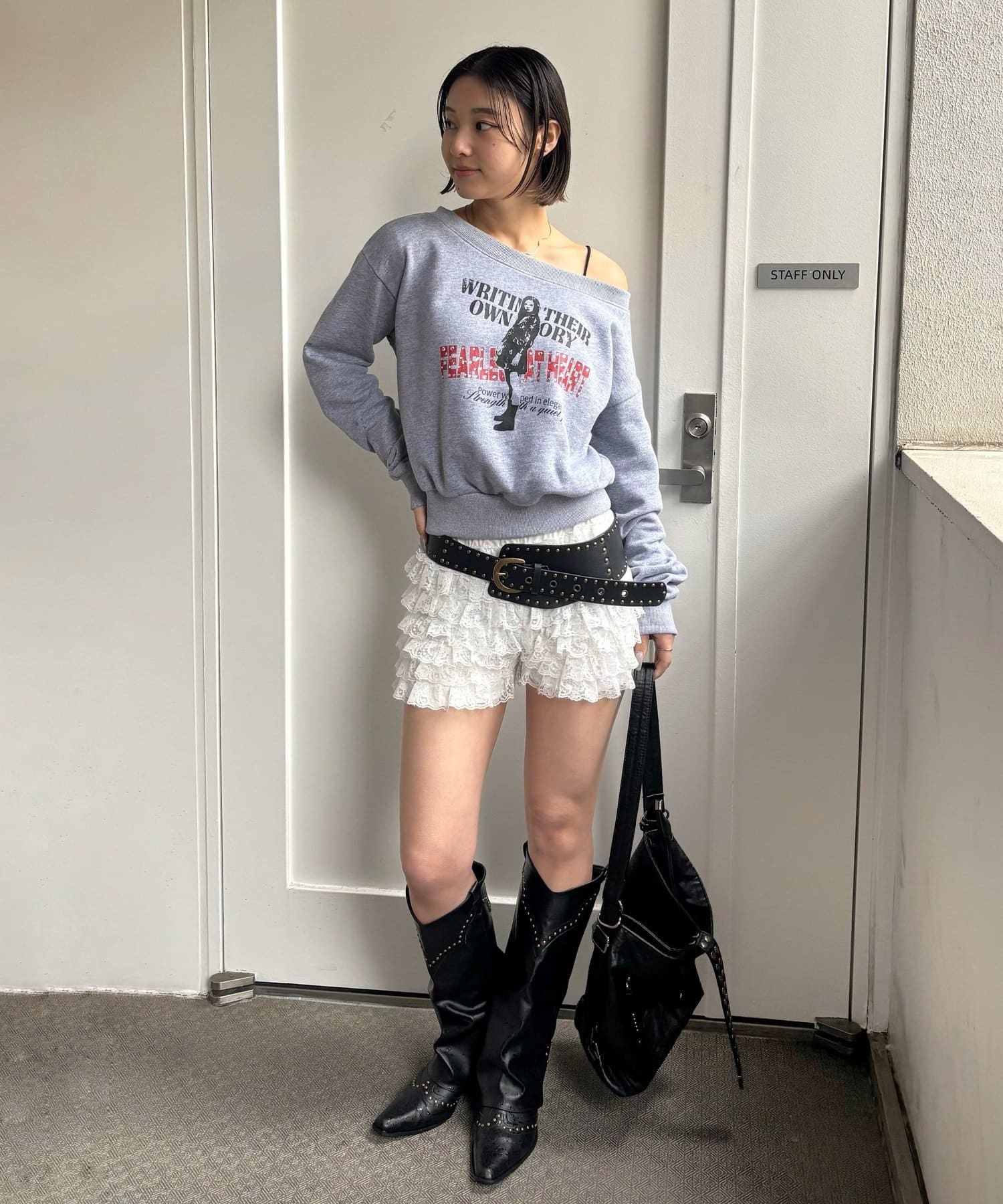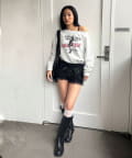 ・ミニのボトムス合わせで甘辛ミックスコーデ。