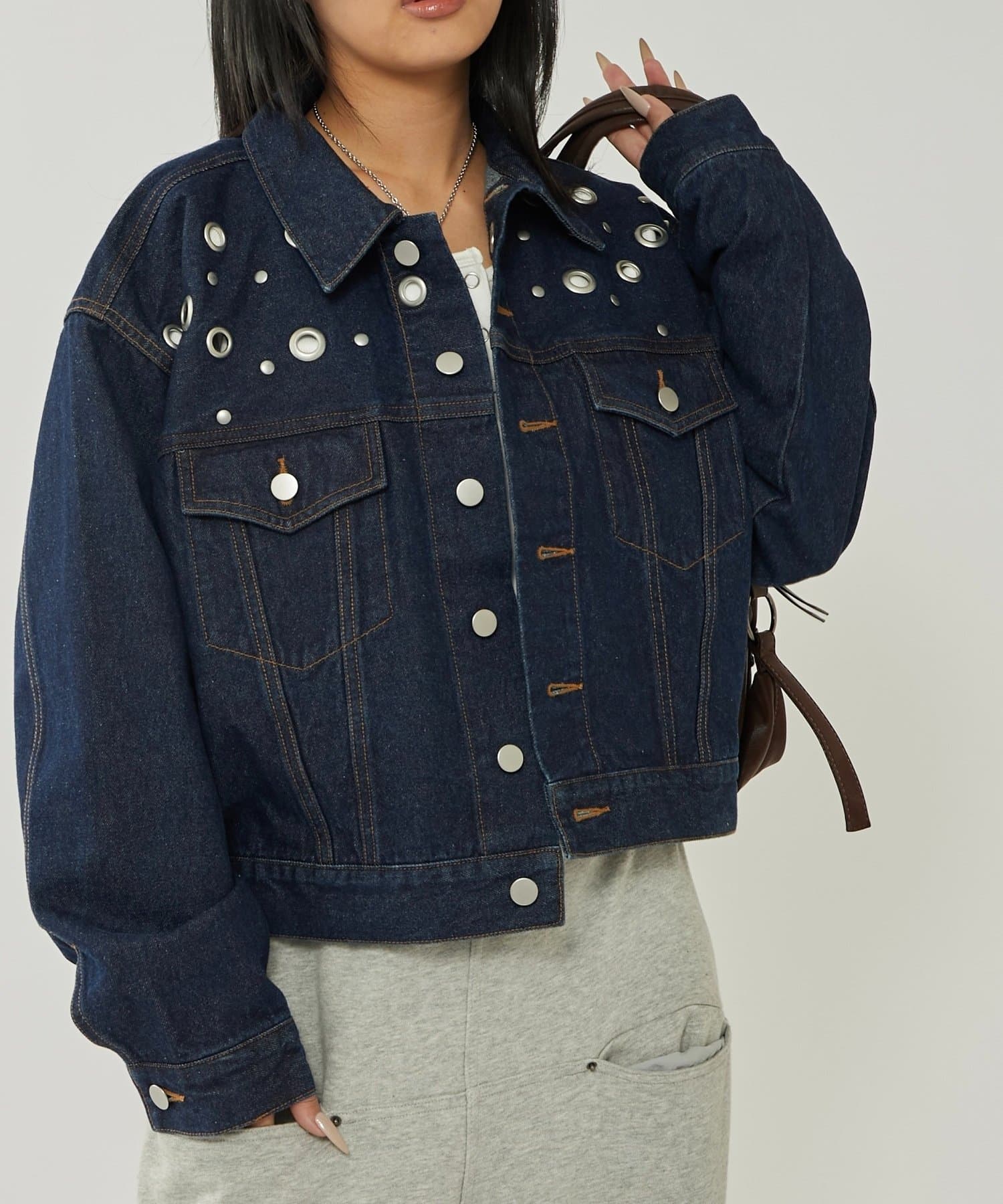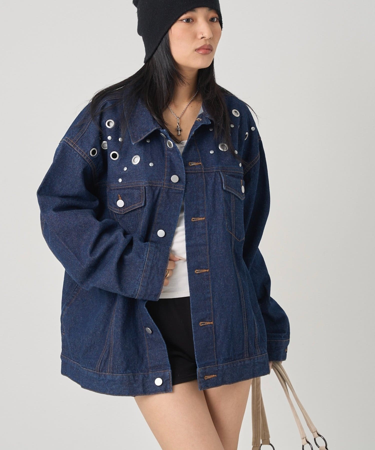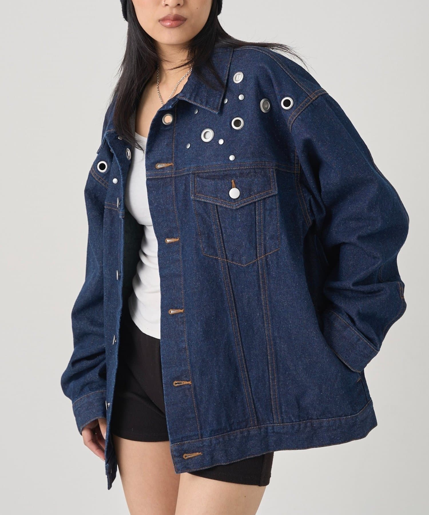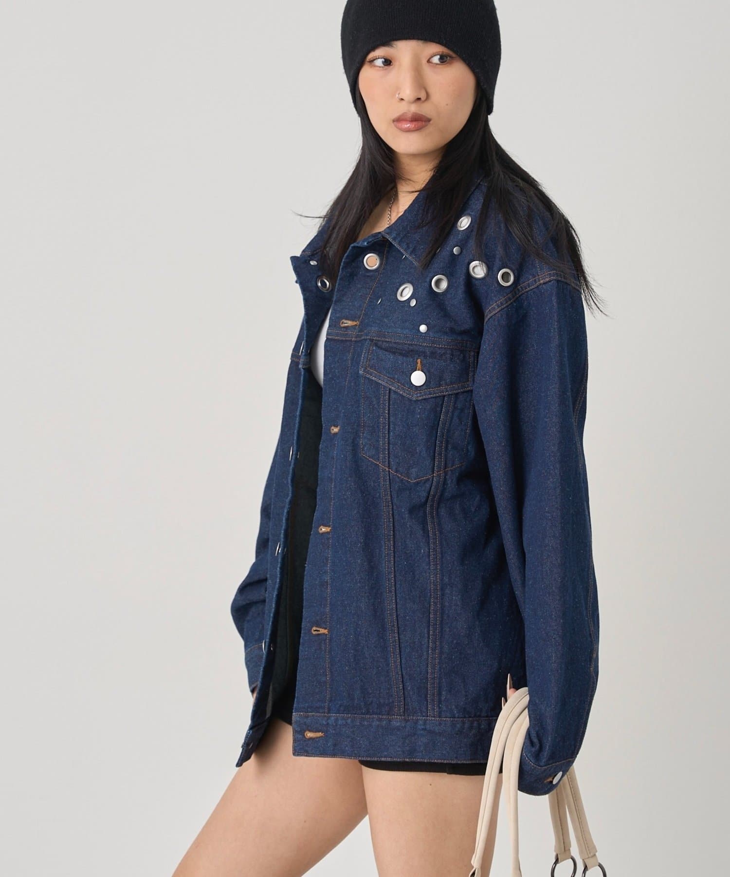 ・エッジの効いたデザインが魅力のハトメデニムジャケット。
