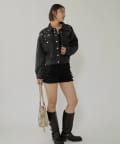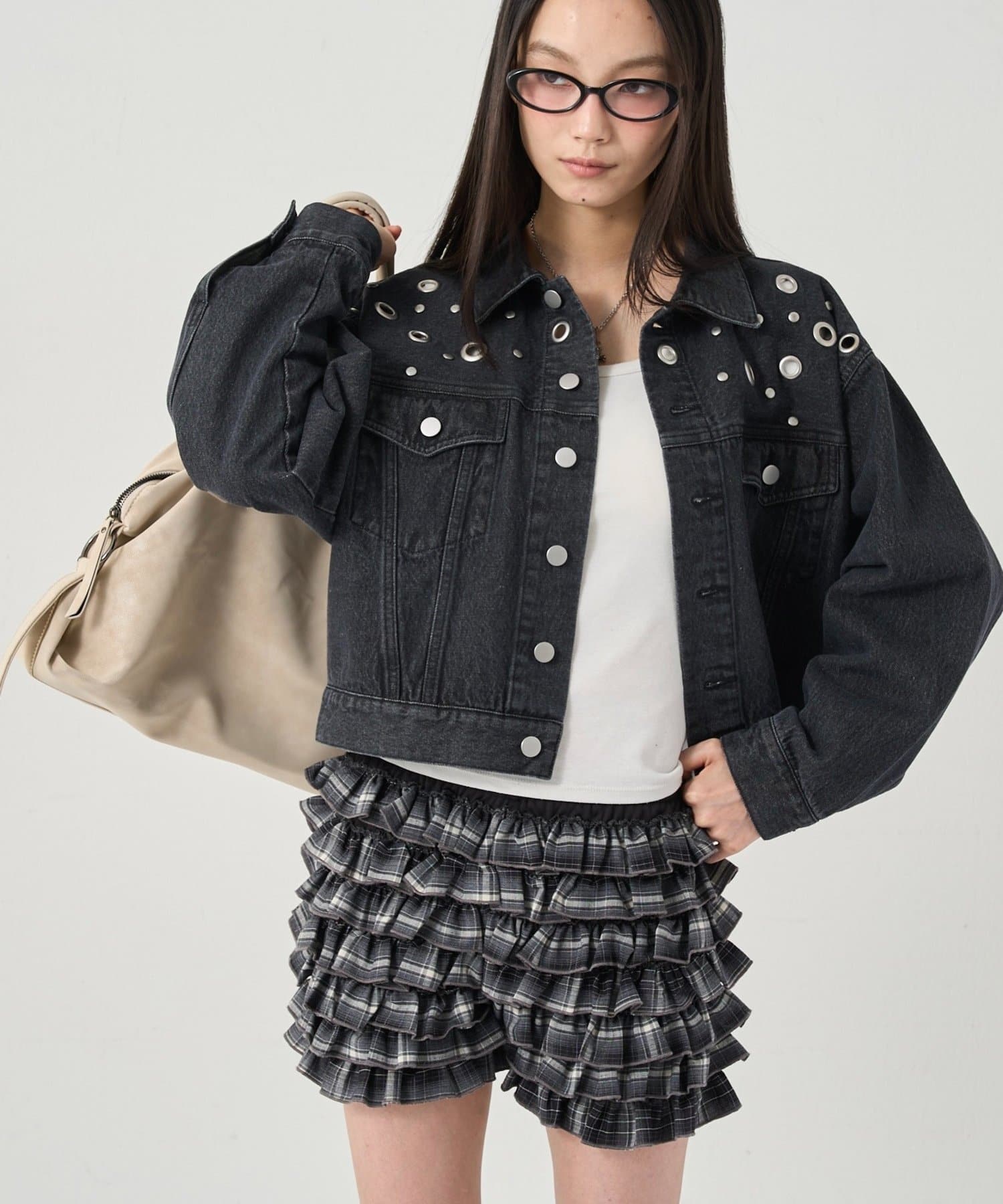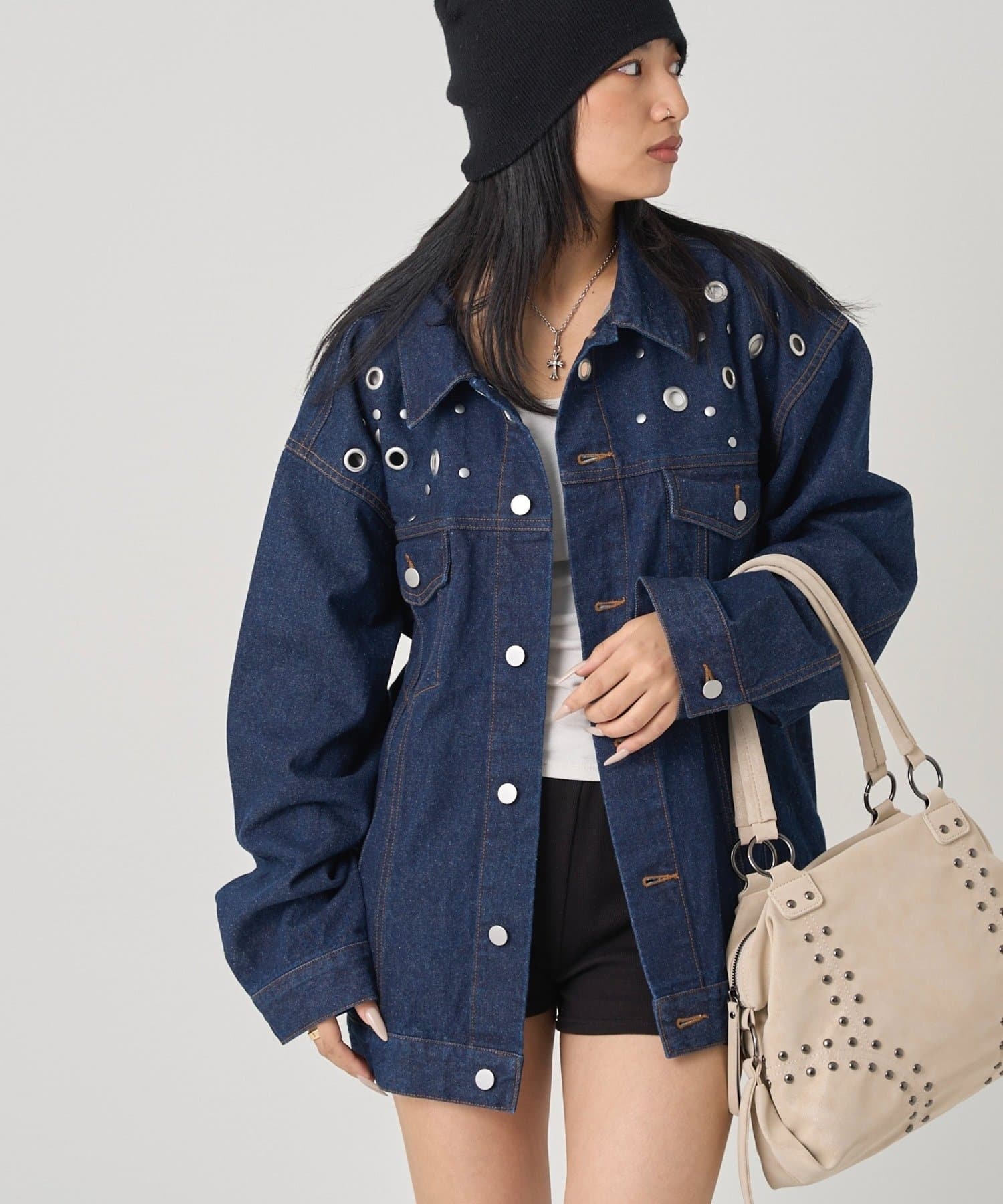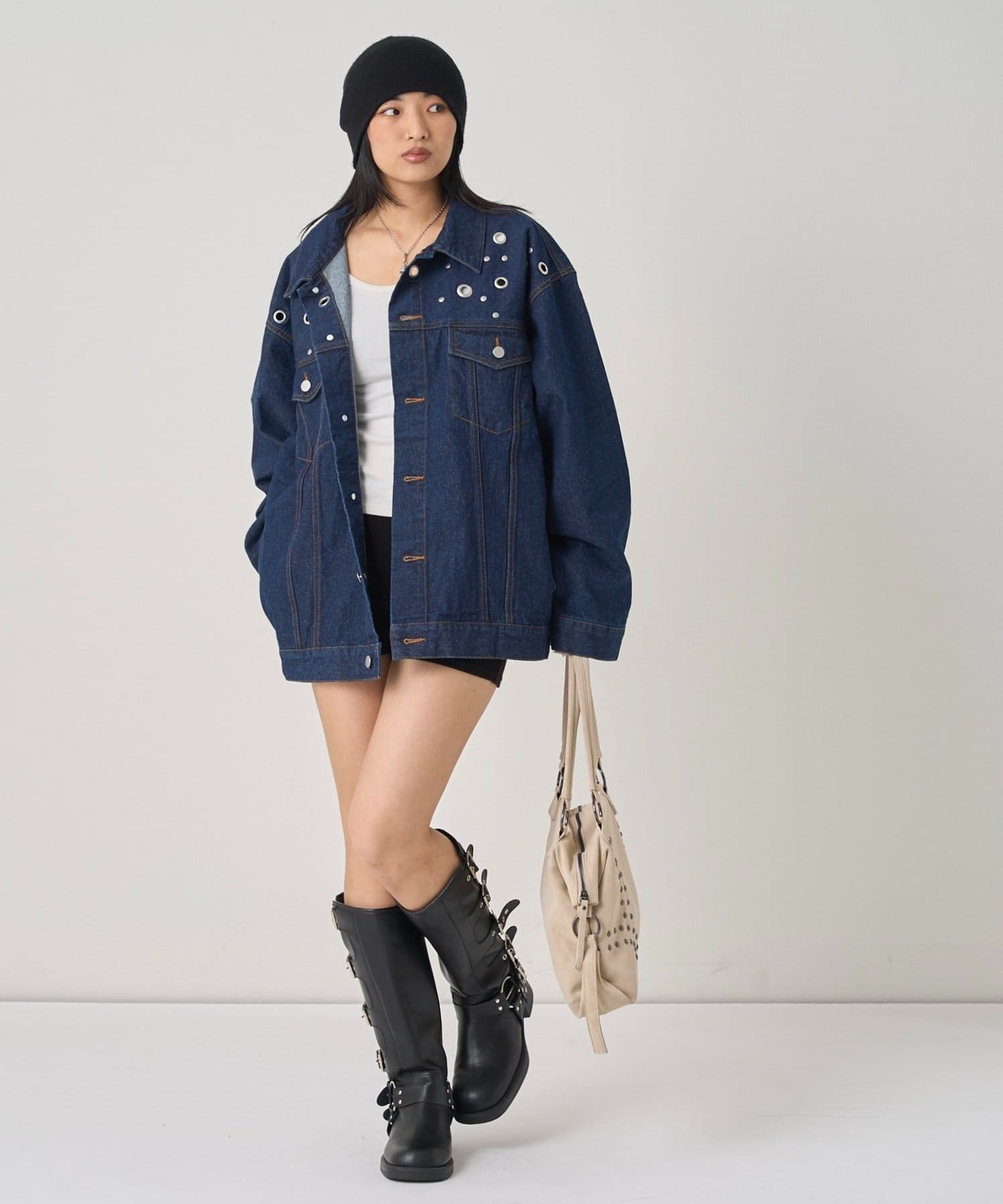 ・エッジの効いたデザインが魅力のハトメデニムジャケット。