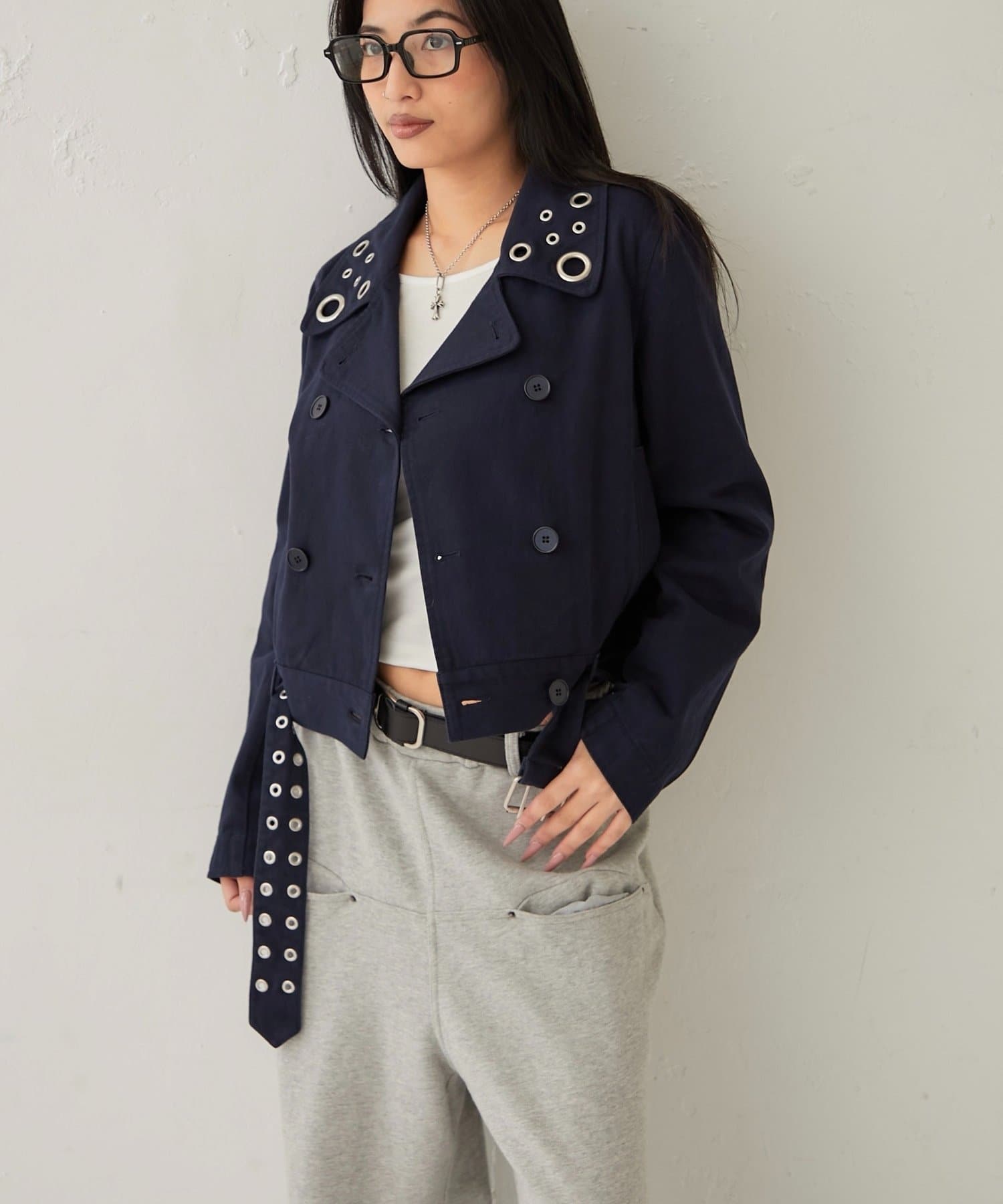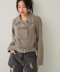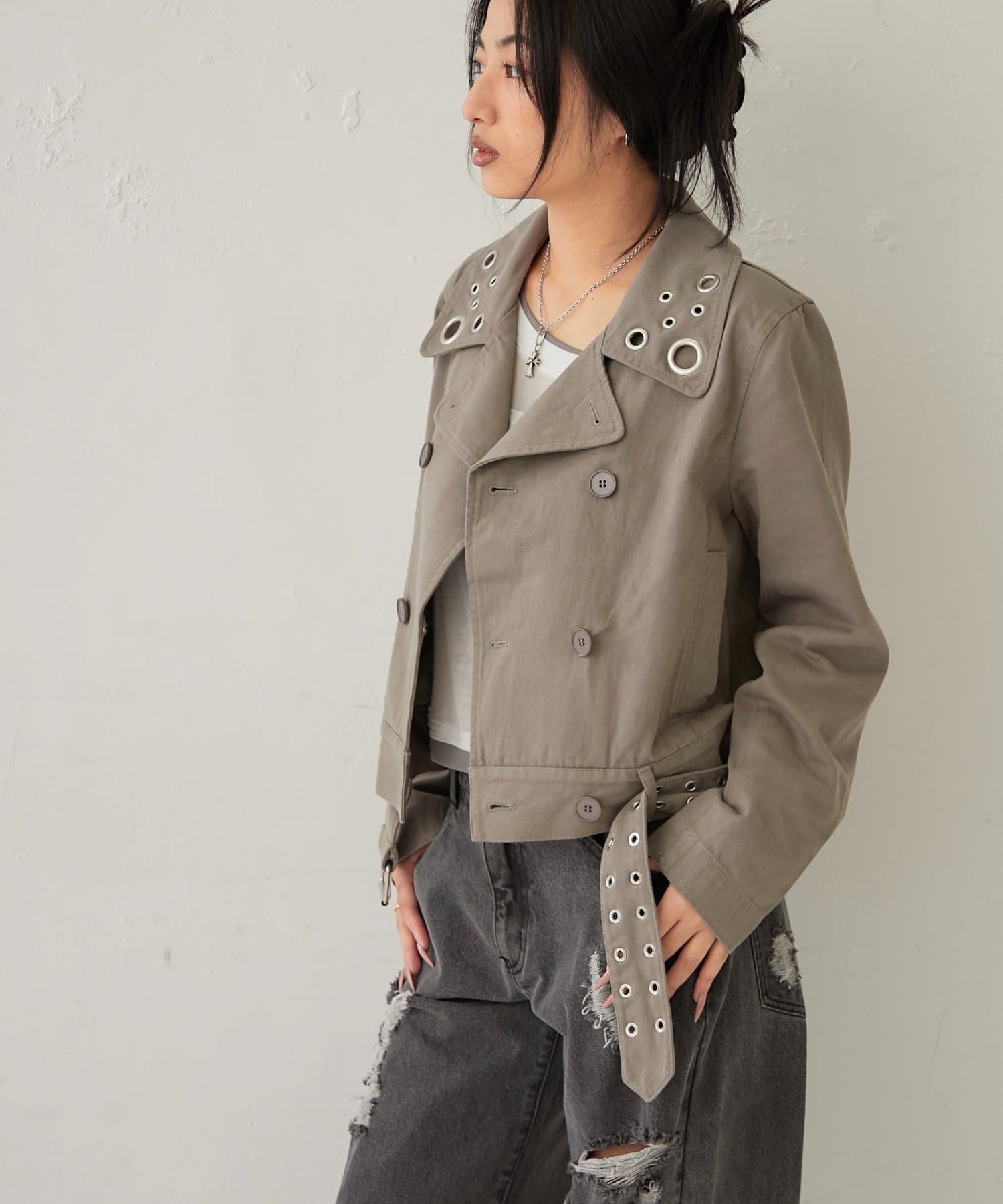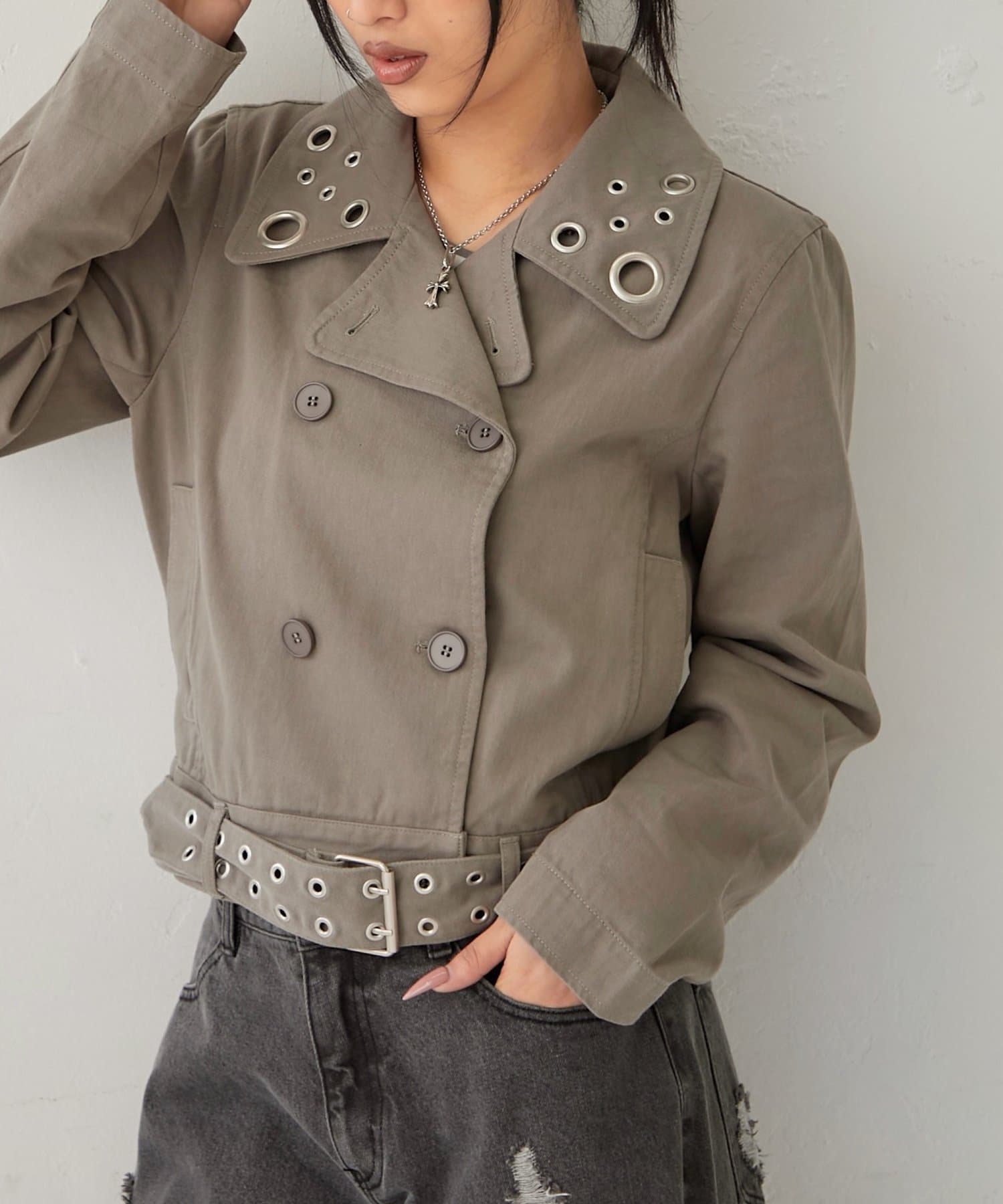 ・襟元のアイレットがアクセントになった、おしゃれなショート丈Pジャケット。