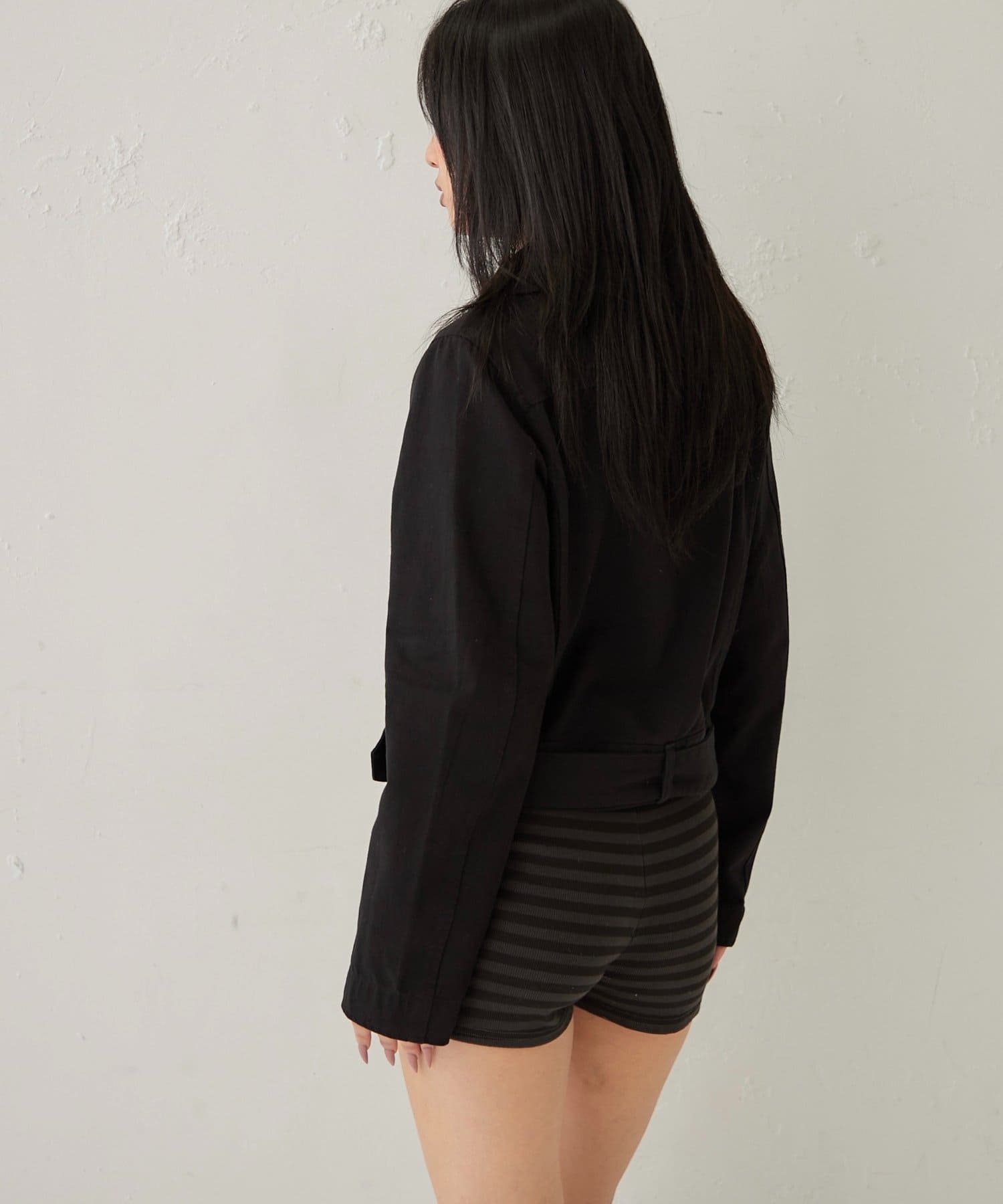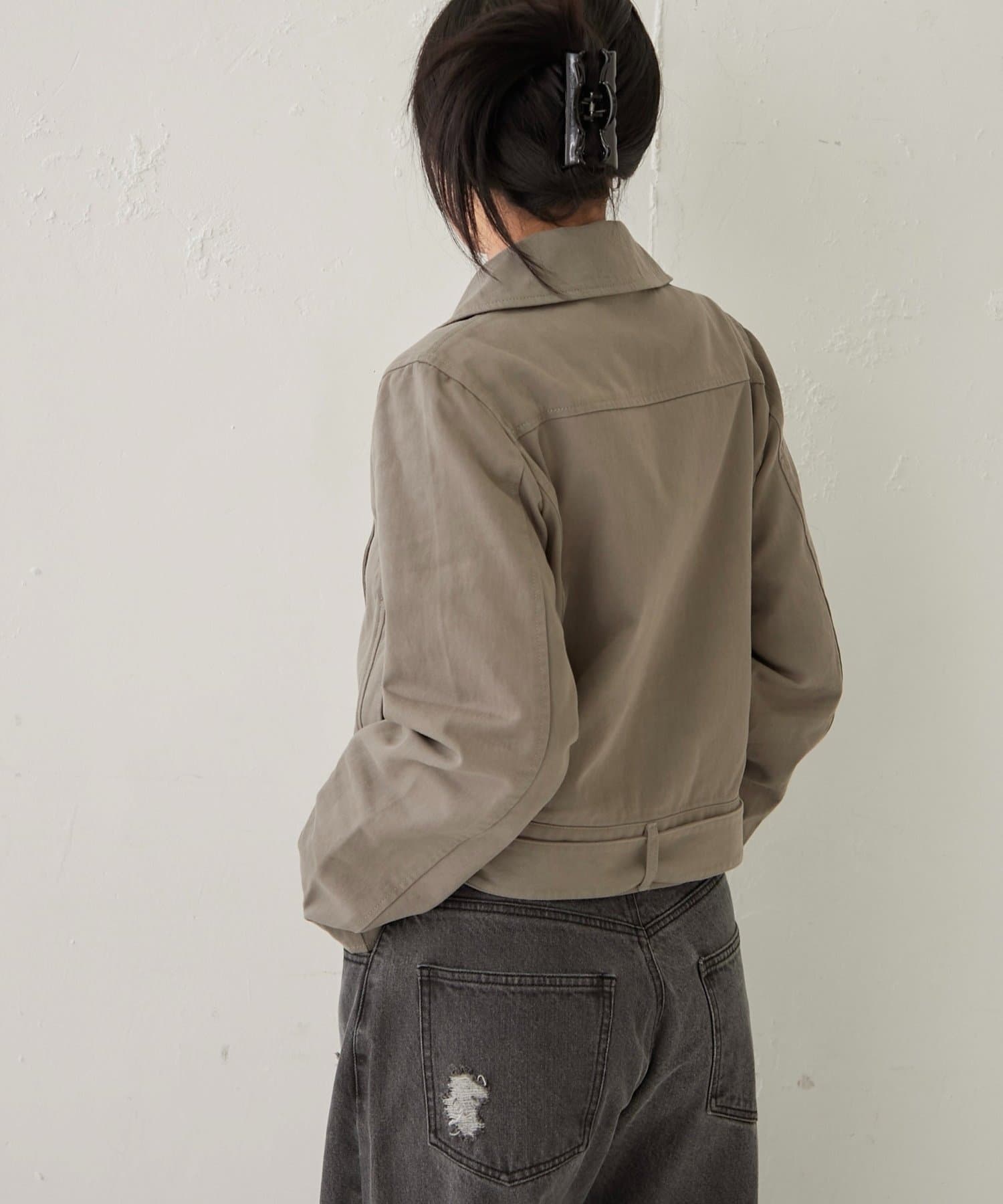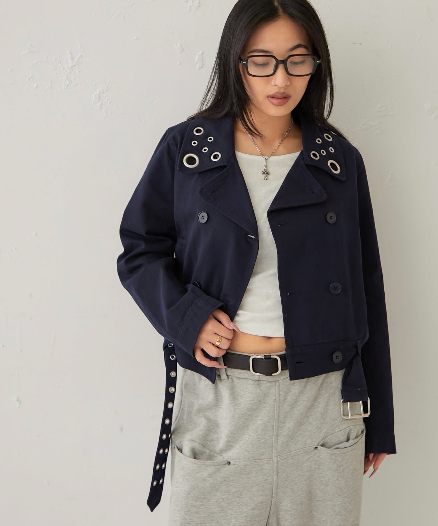 ・襟元のアイレットがアクセントになった、おしゃれなショート丈Pジャケット。