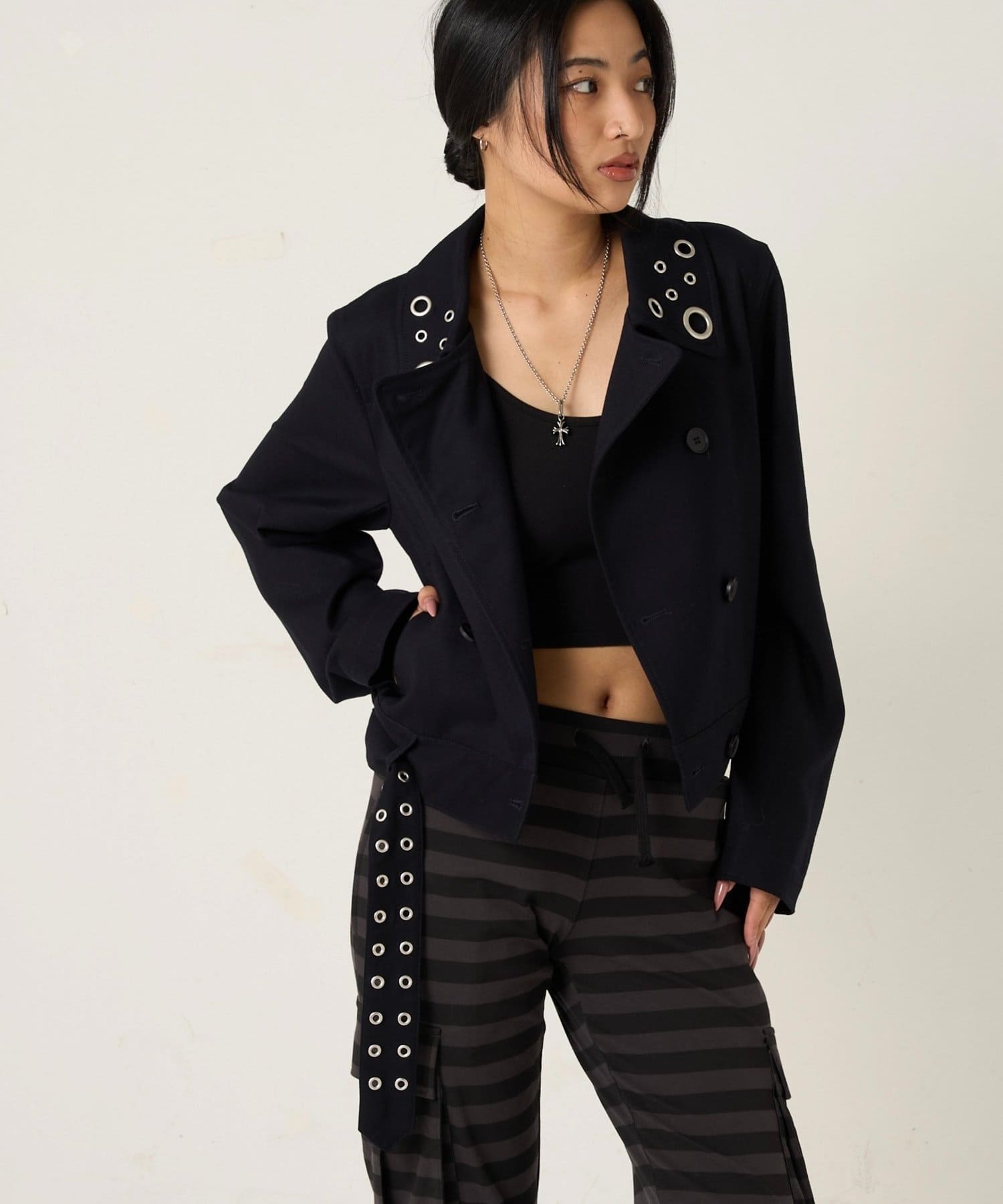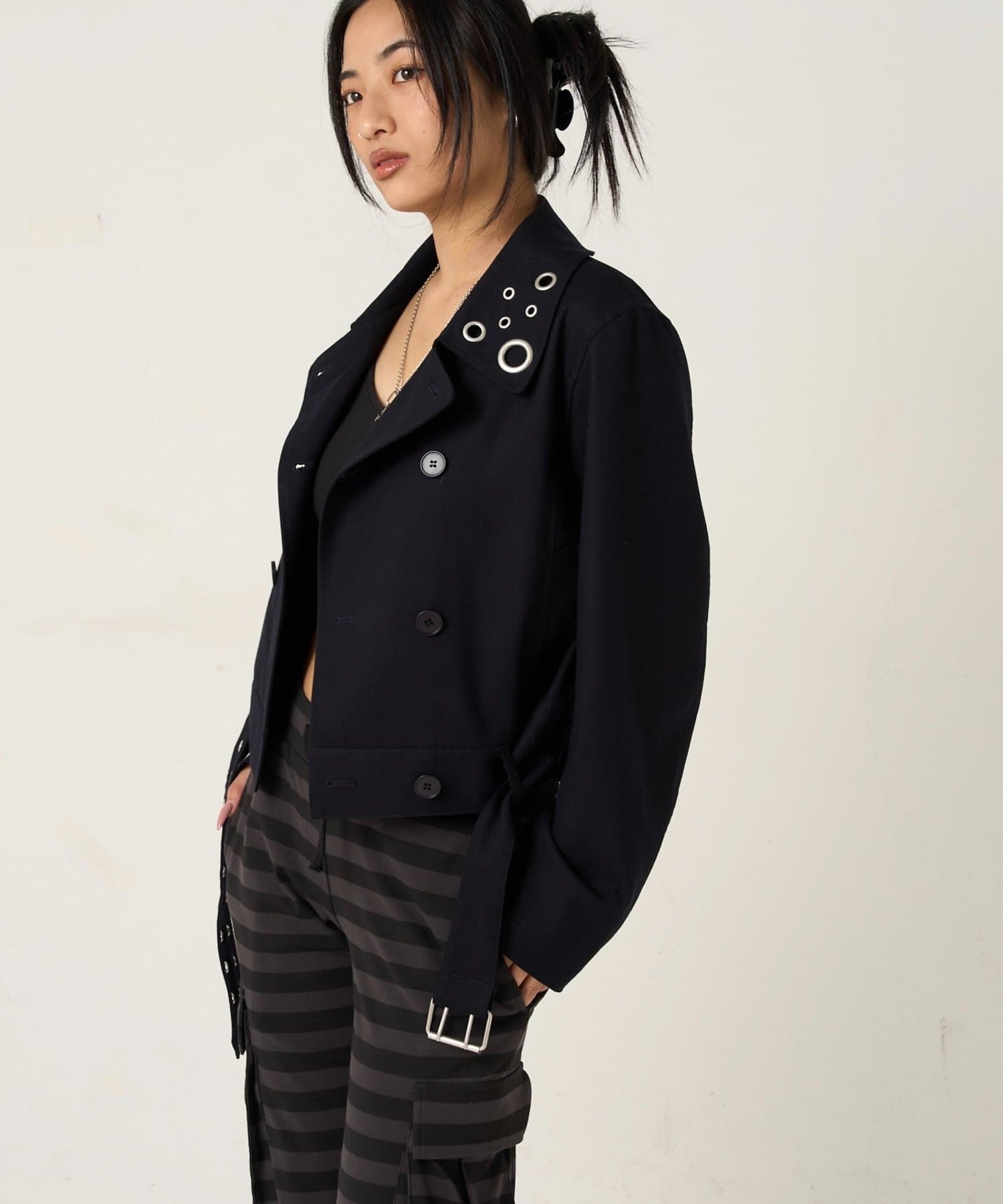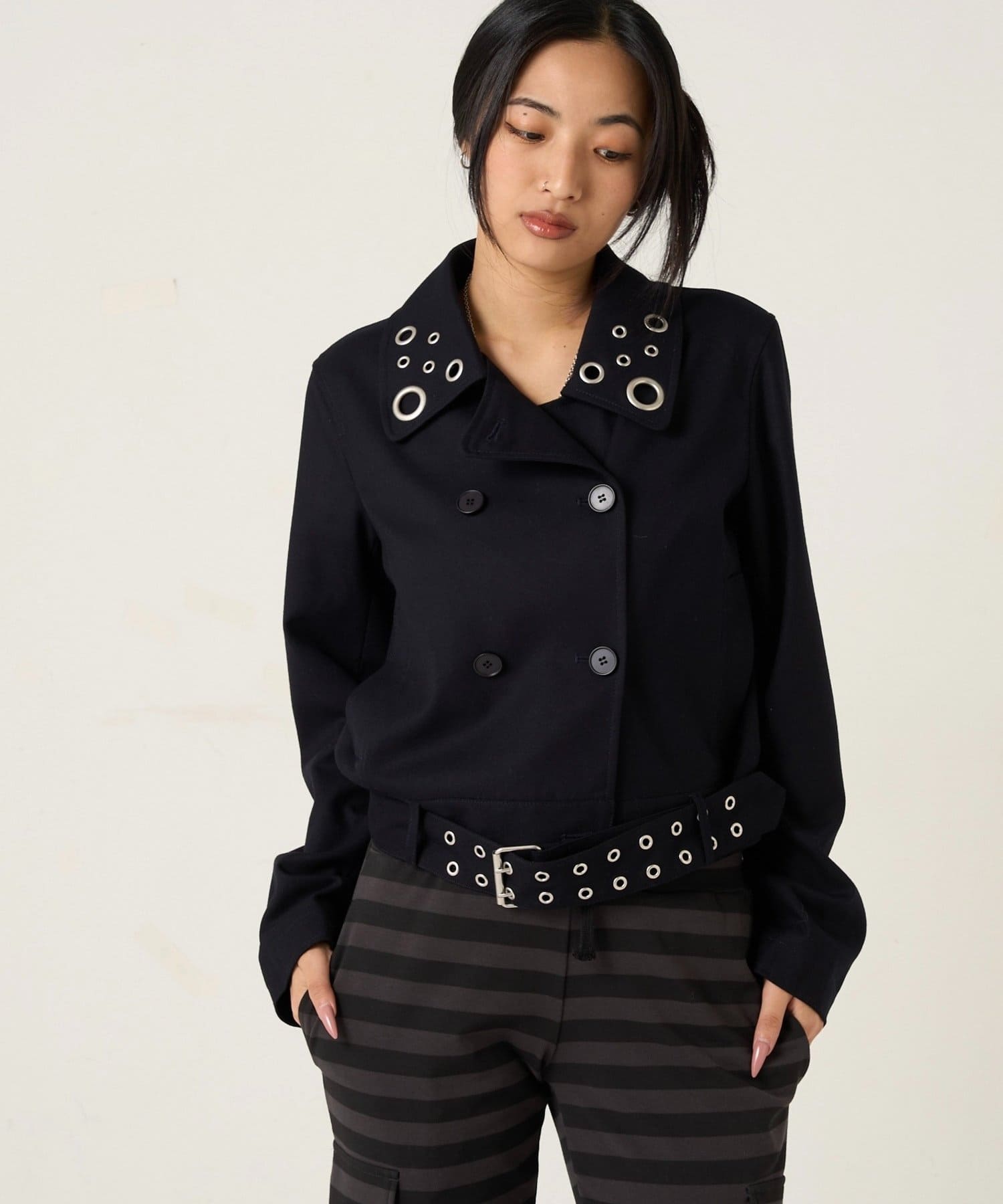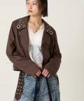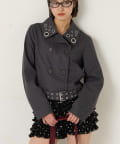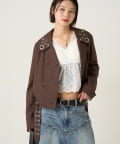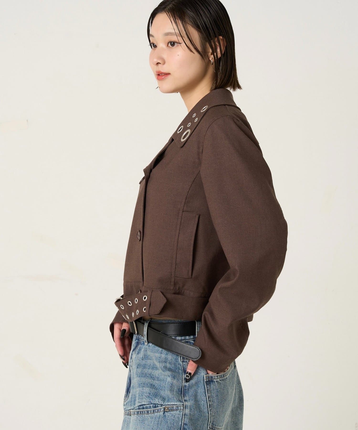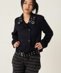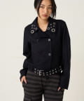 ・首元とウエストにあしらわれたアイレットが、エッジの効いたアクセントになったショート丈のPジャケット。