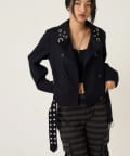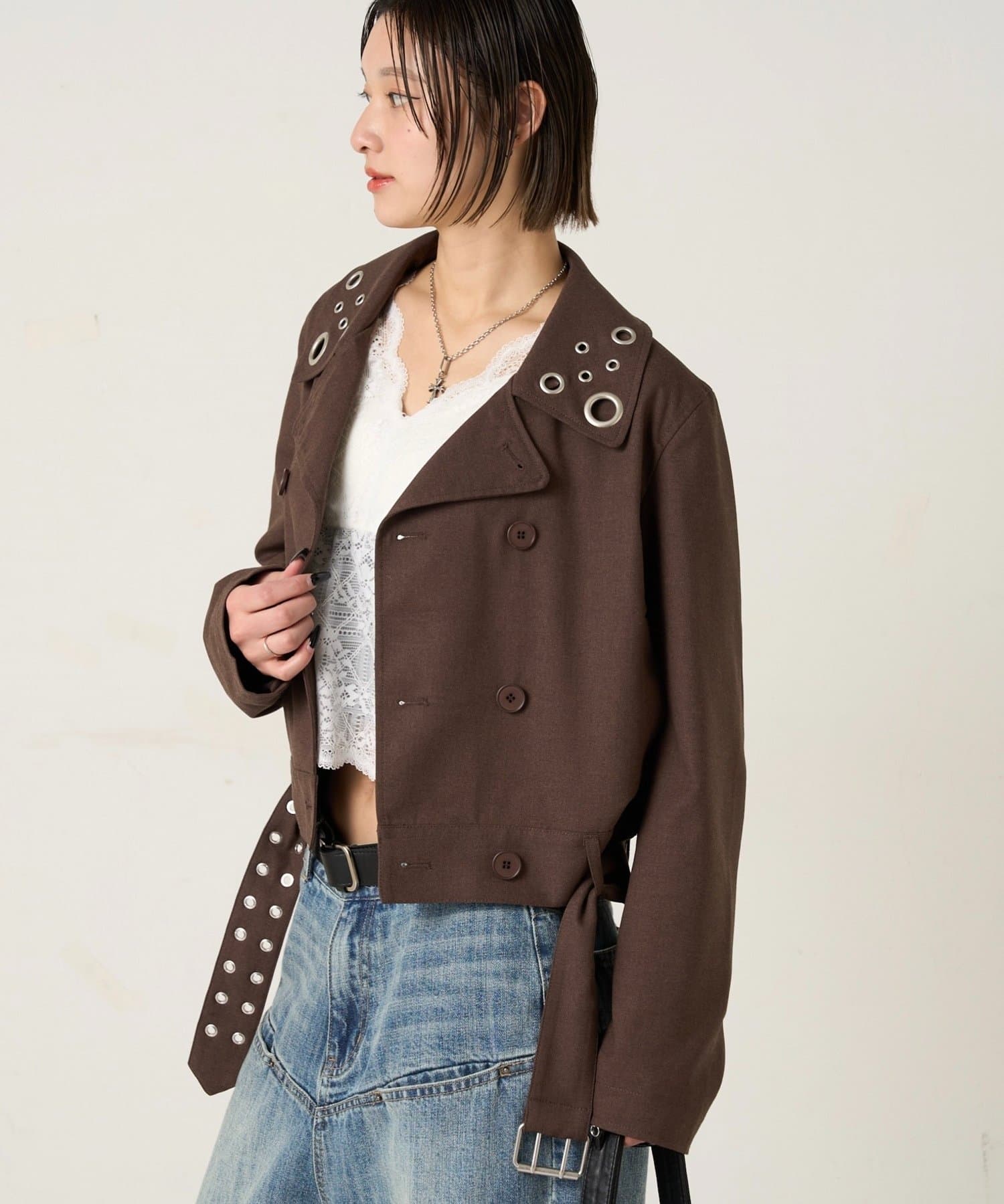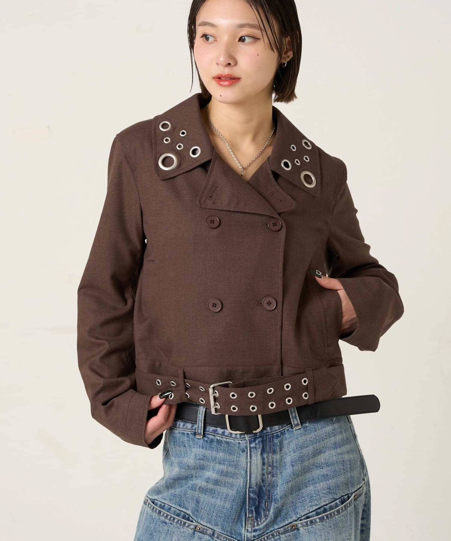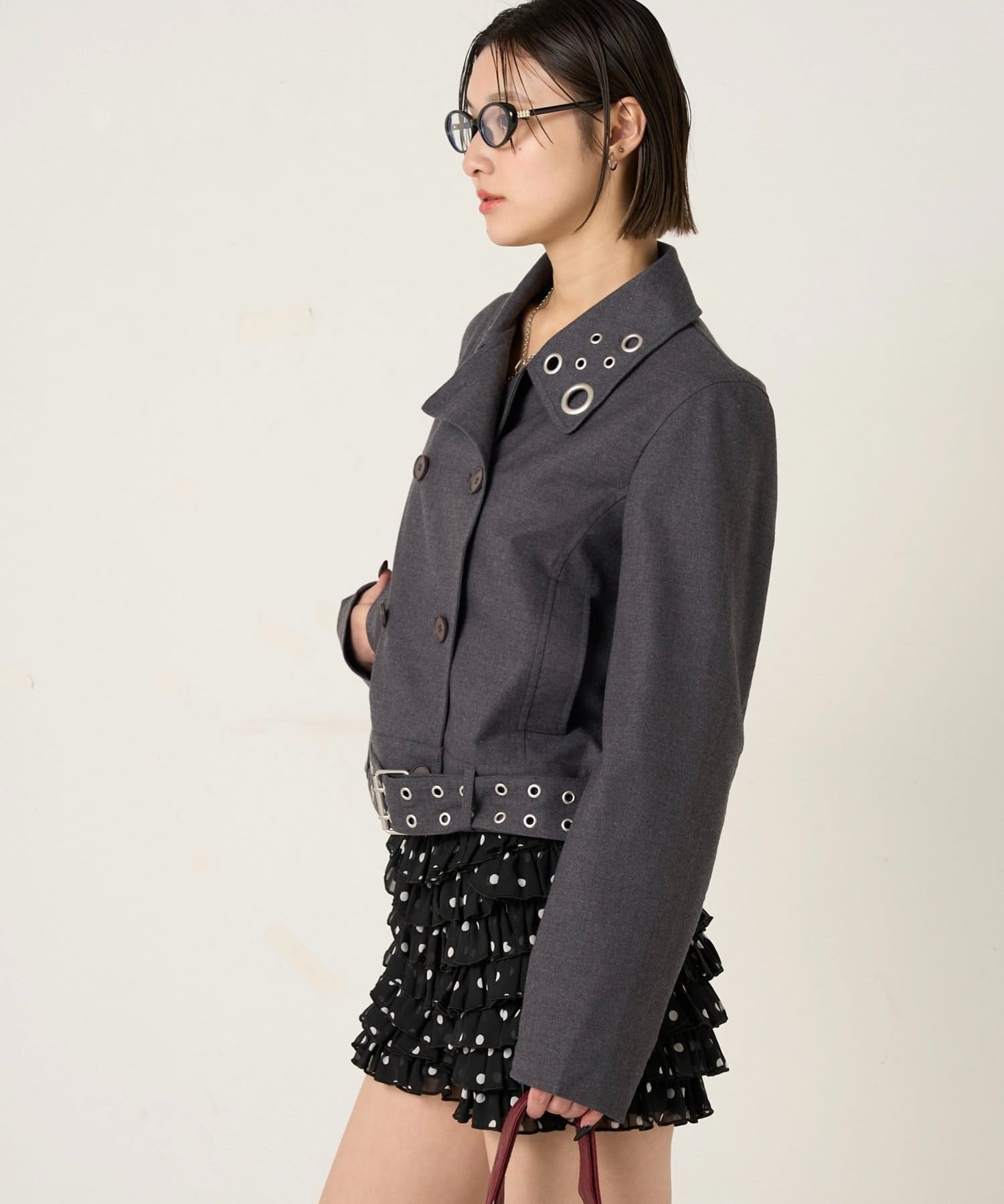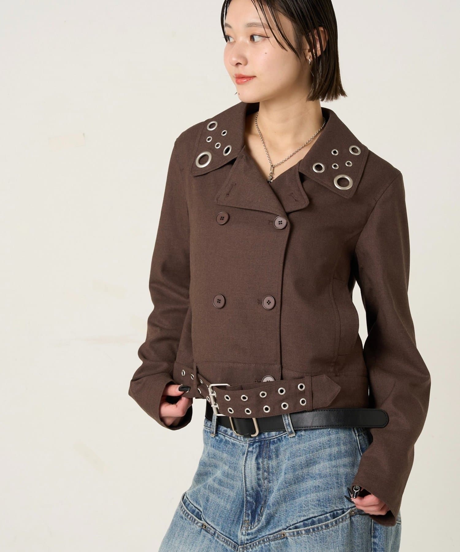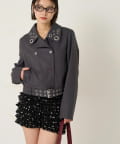 ・首元とウエストにあしらわれたアイレットが、エッジの効いたアクセントになったショート丈のPジャケット。