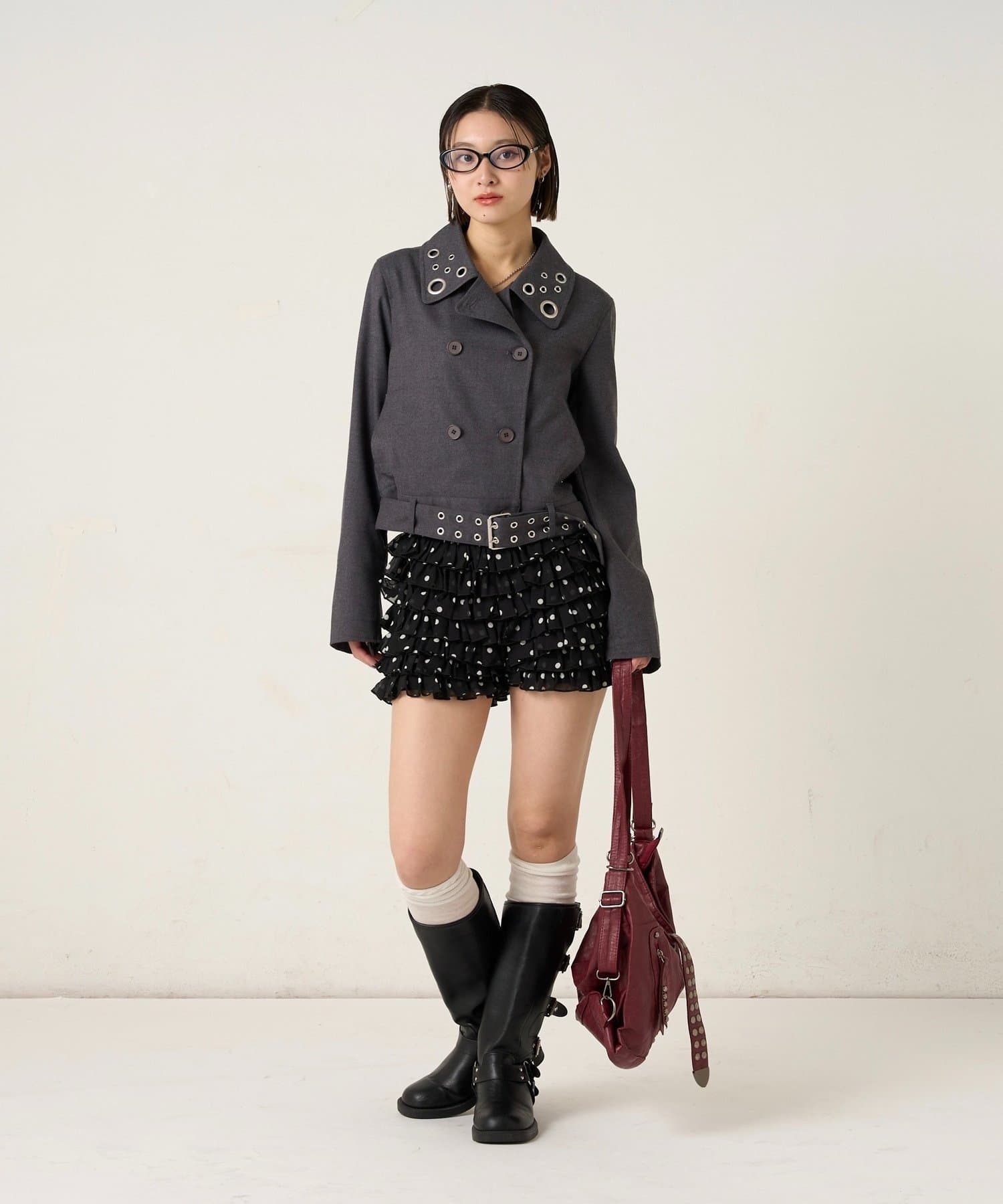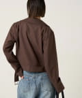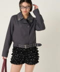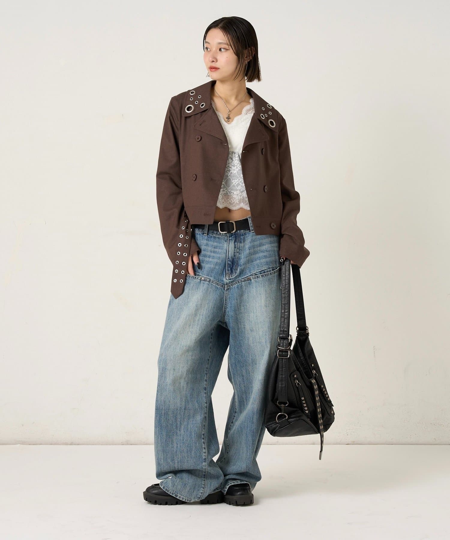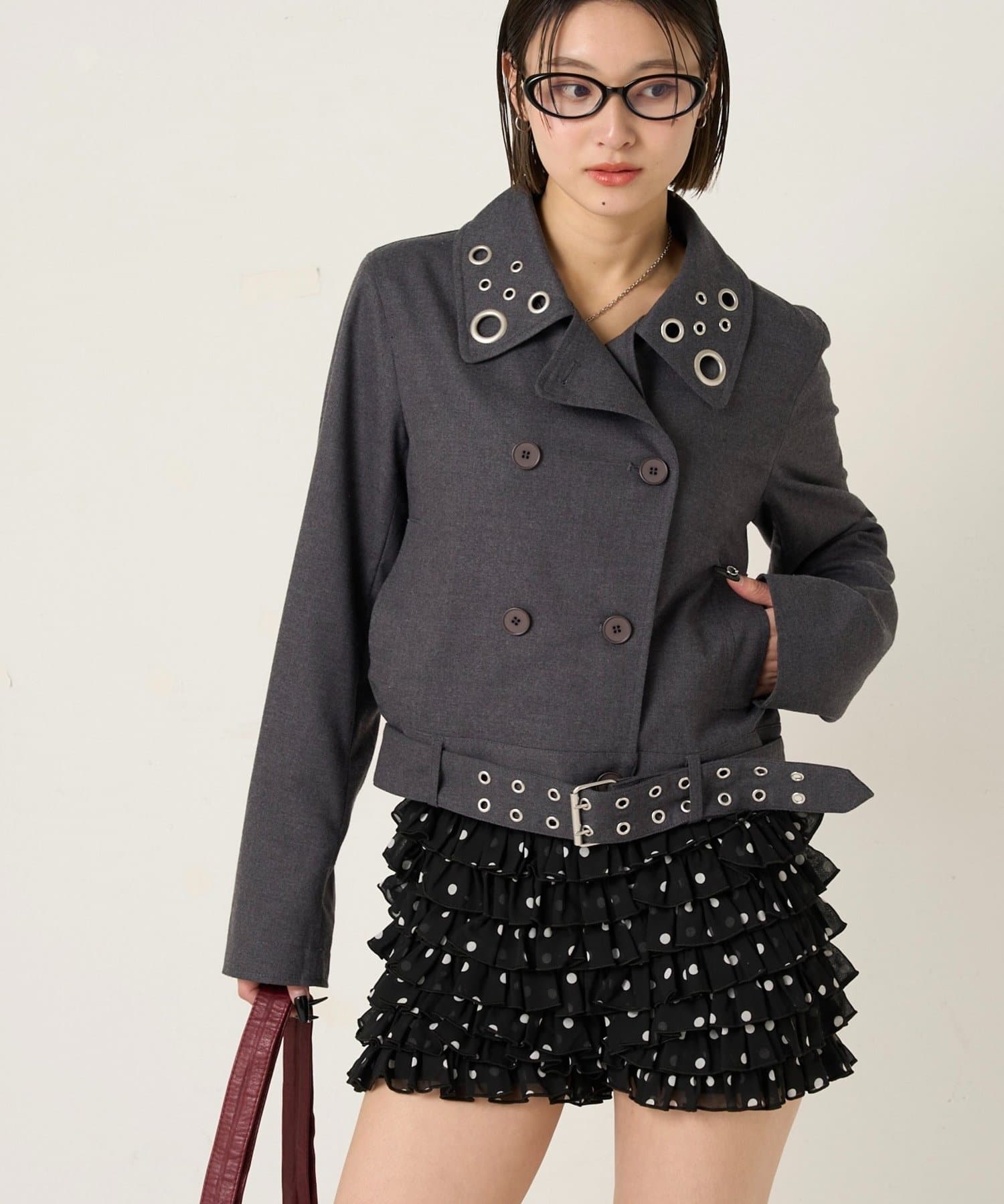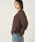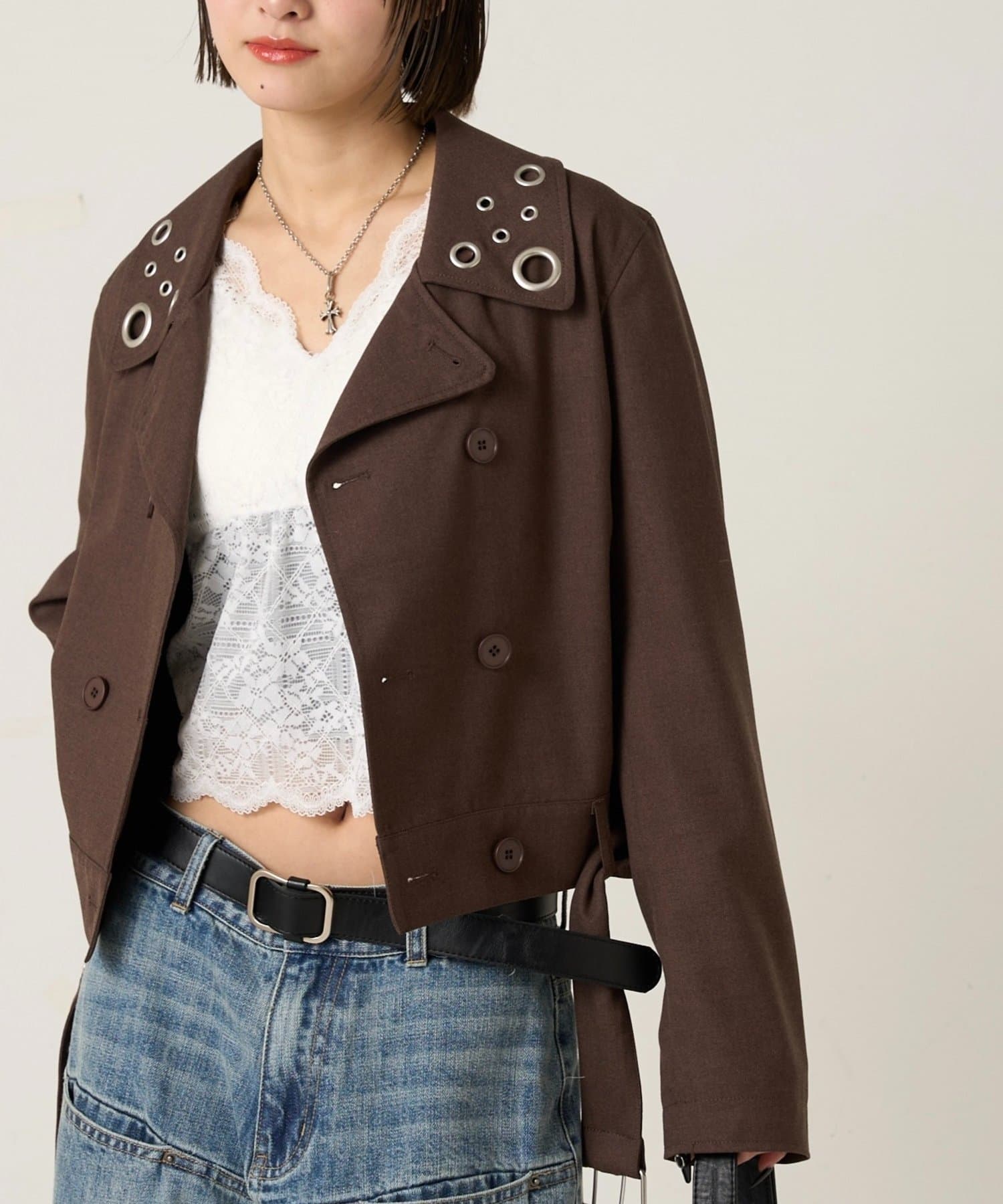 ・首元とウエストにあしらわれたアイレットが、エッジの効いたアクセントになったショート丈のPジャケット。