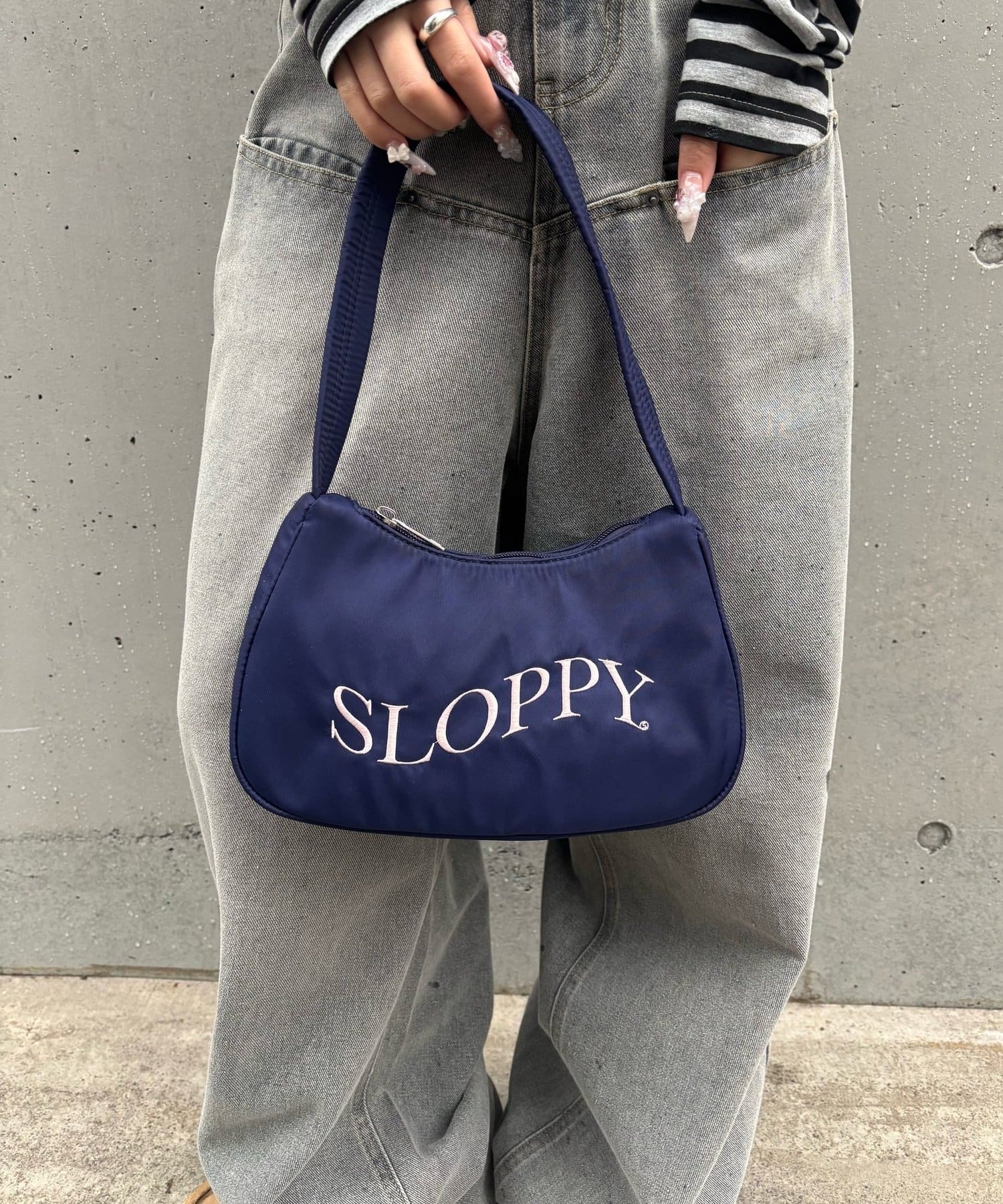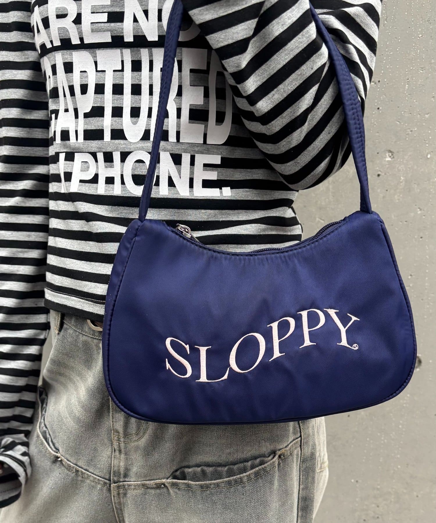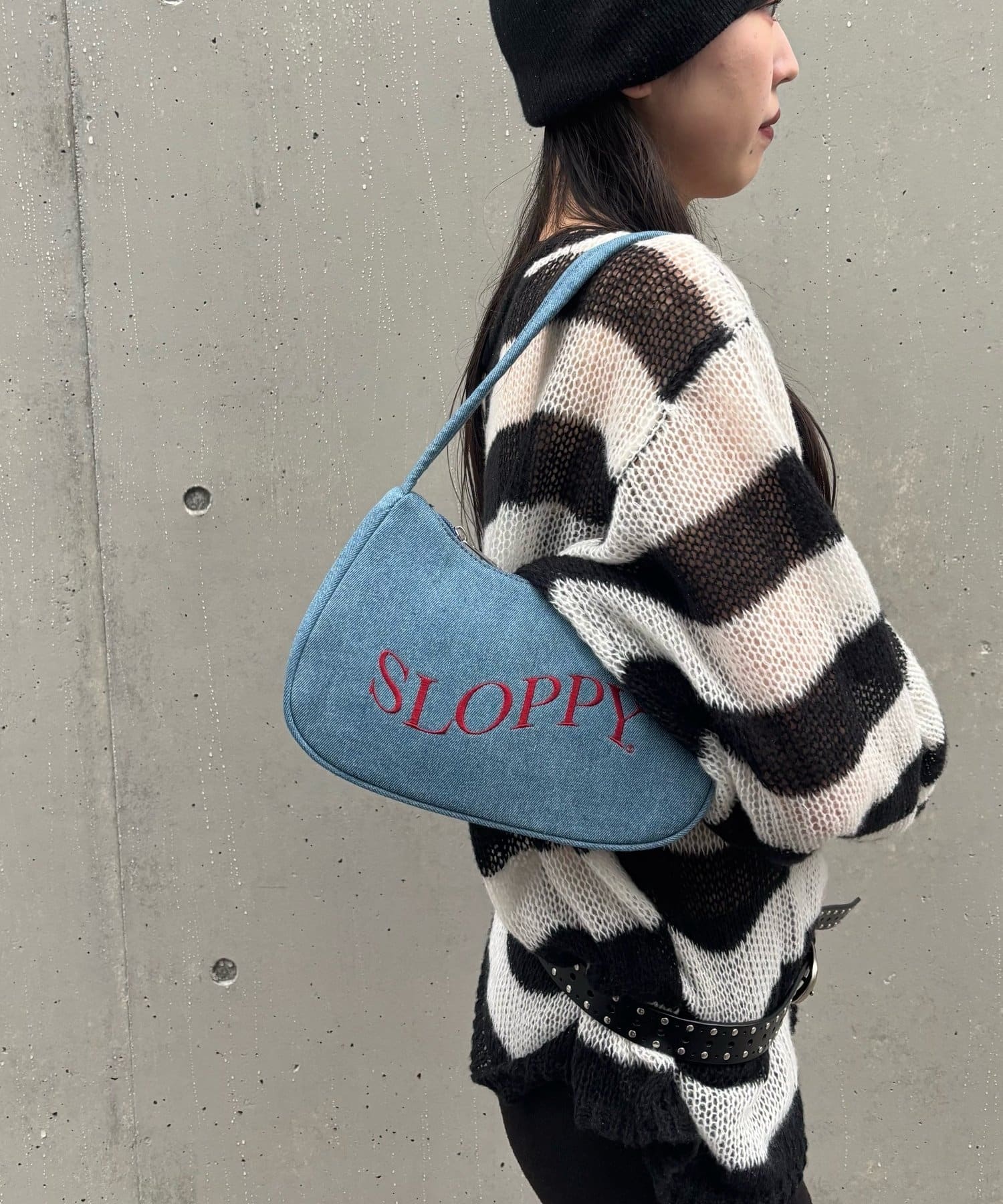 ・ SLOPPYのロゴが目を引くショルダーバッグ。