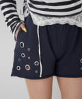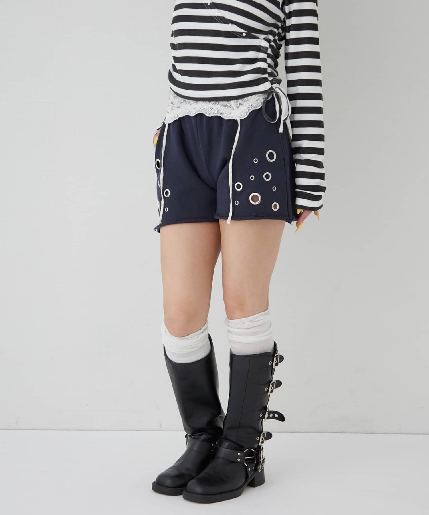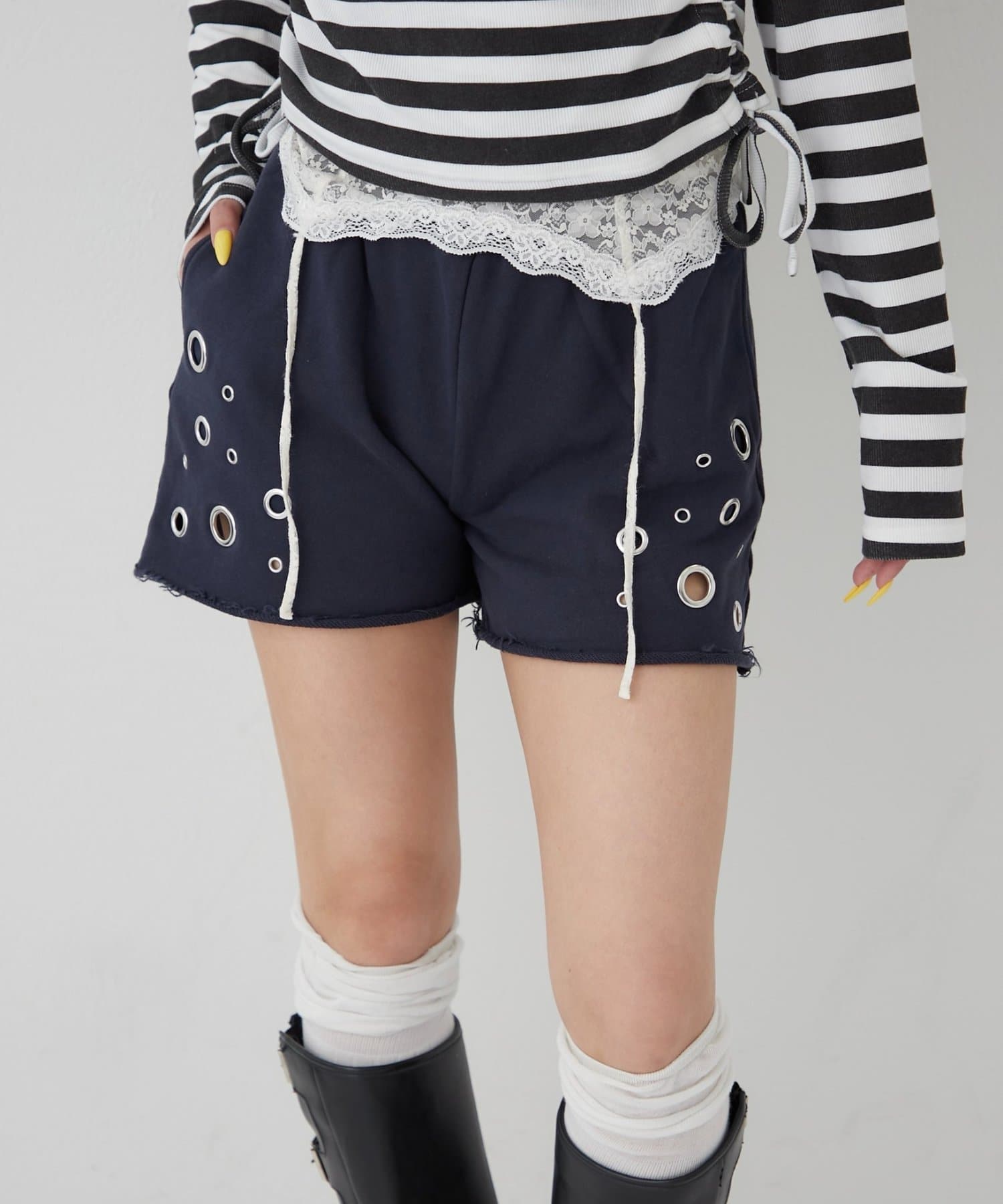 ・サイドにあしらわれたアイレットがポイントのスウェットショーツ。