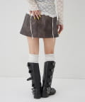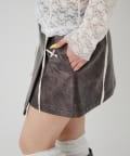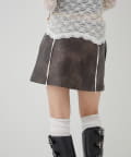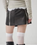 ・生地感がレザーのミニスカートなので甘めなスタイリングでも辛めなスタイリングでも取り入れられるマルチスカート。