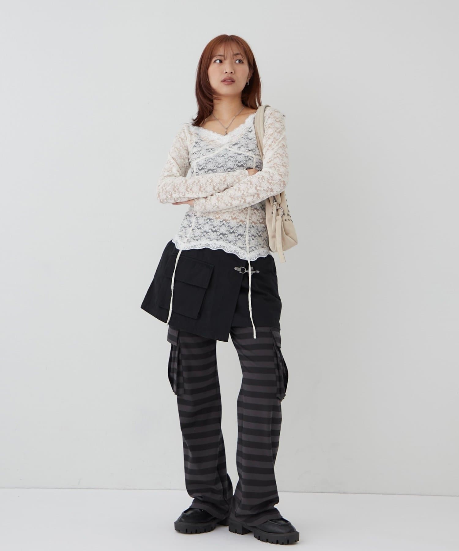 ・甘めのトップスと合わせて甘辛スタイルもオススメ。