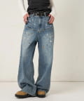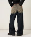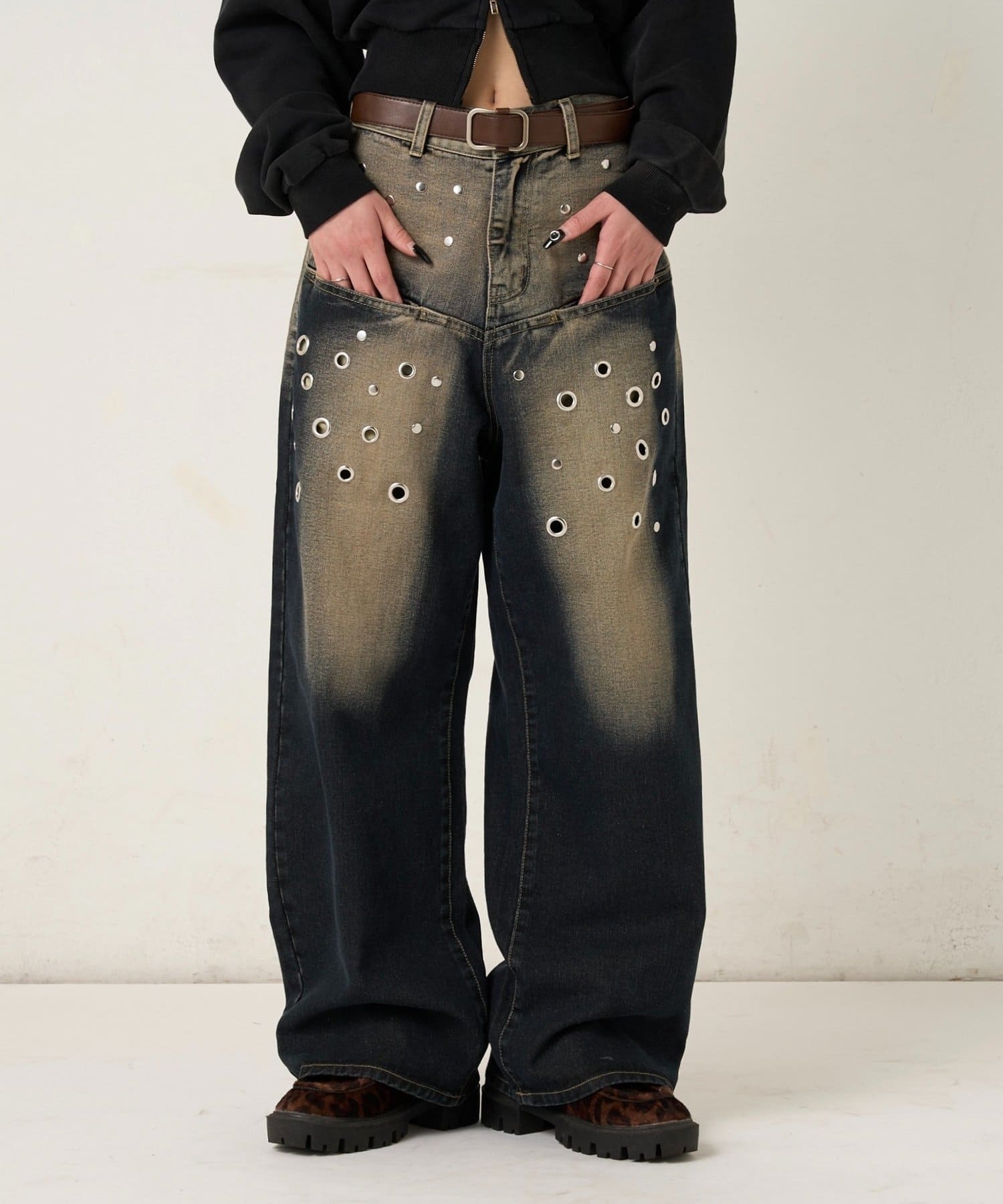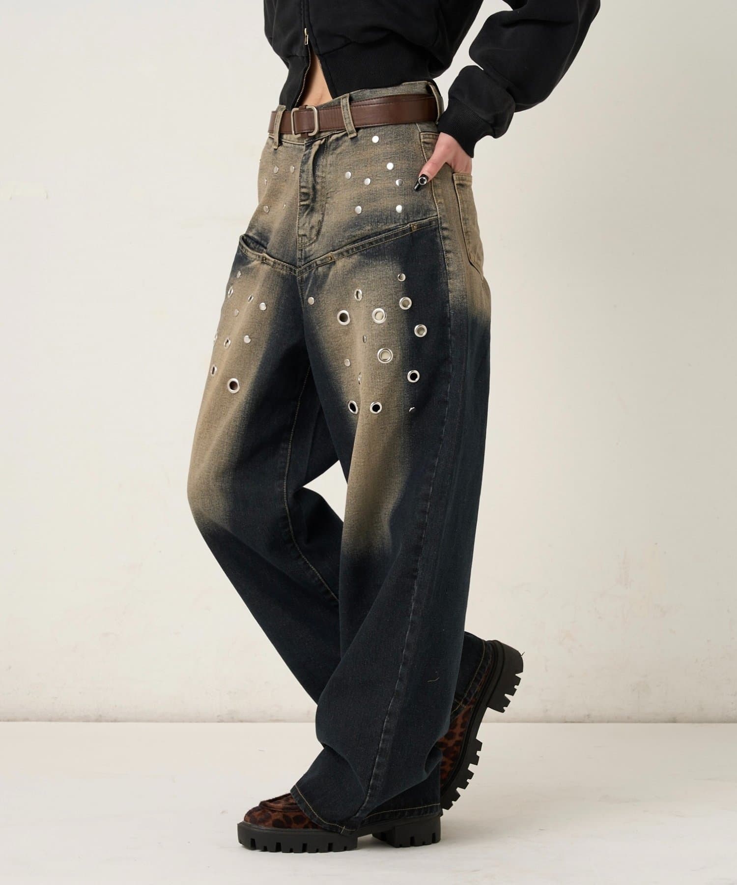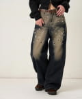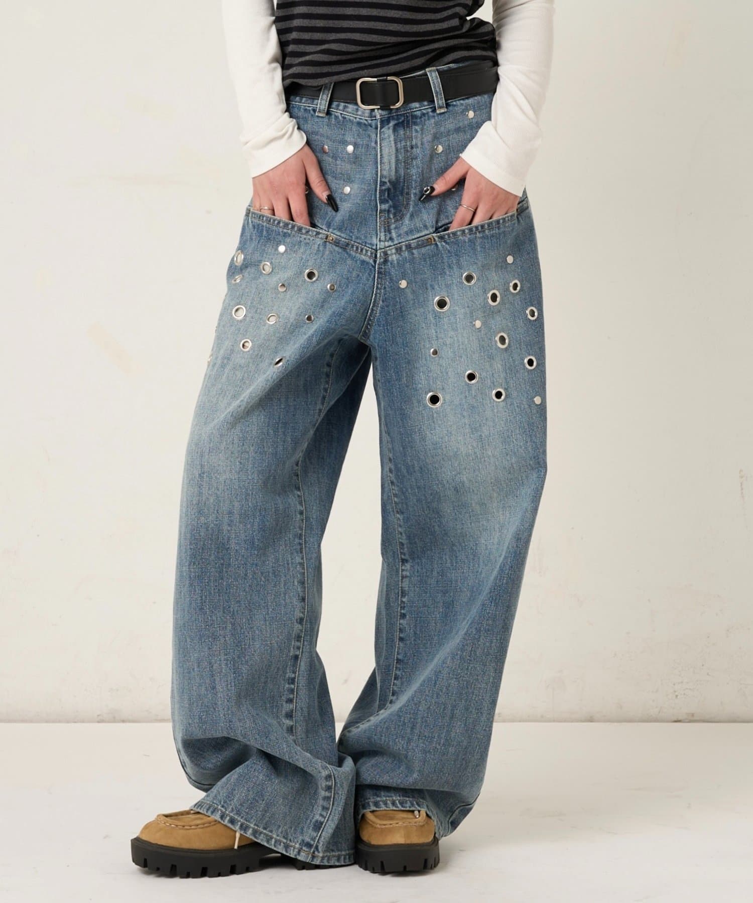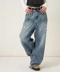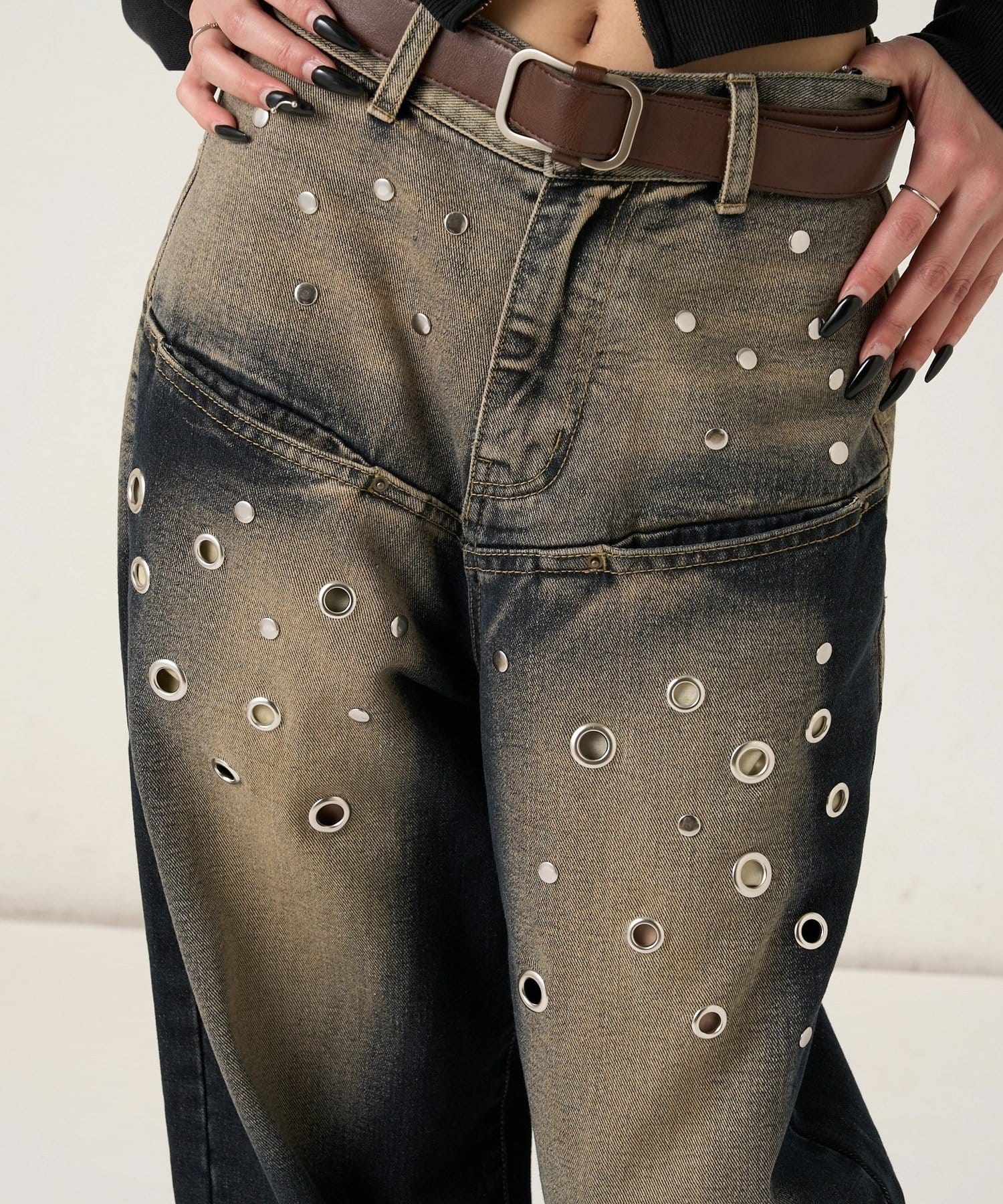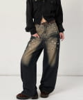 ・大胆なアイレットデザインと独特なブラスト加工が目を引くデニムパンツ。