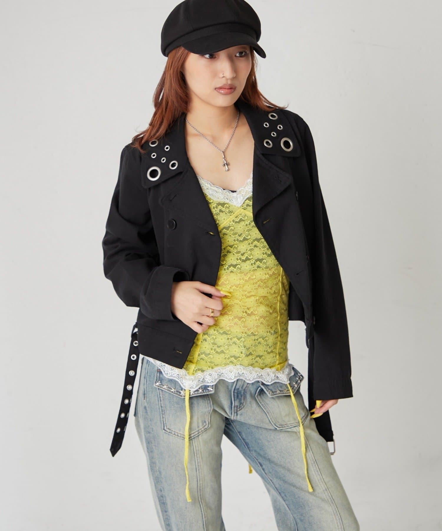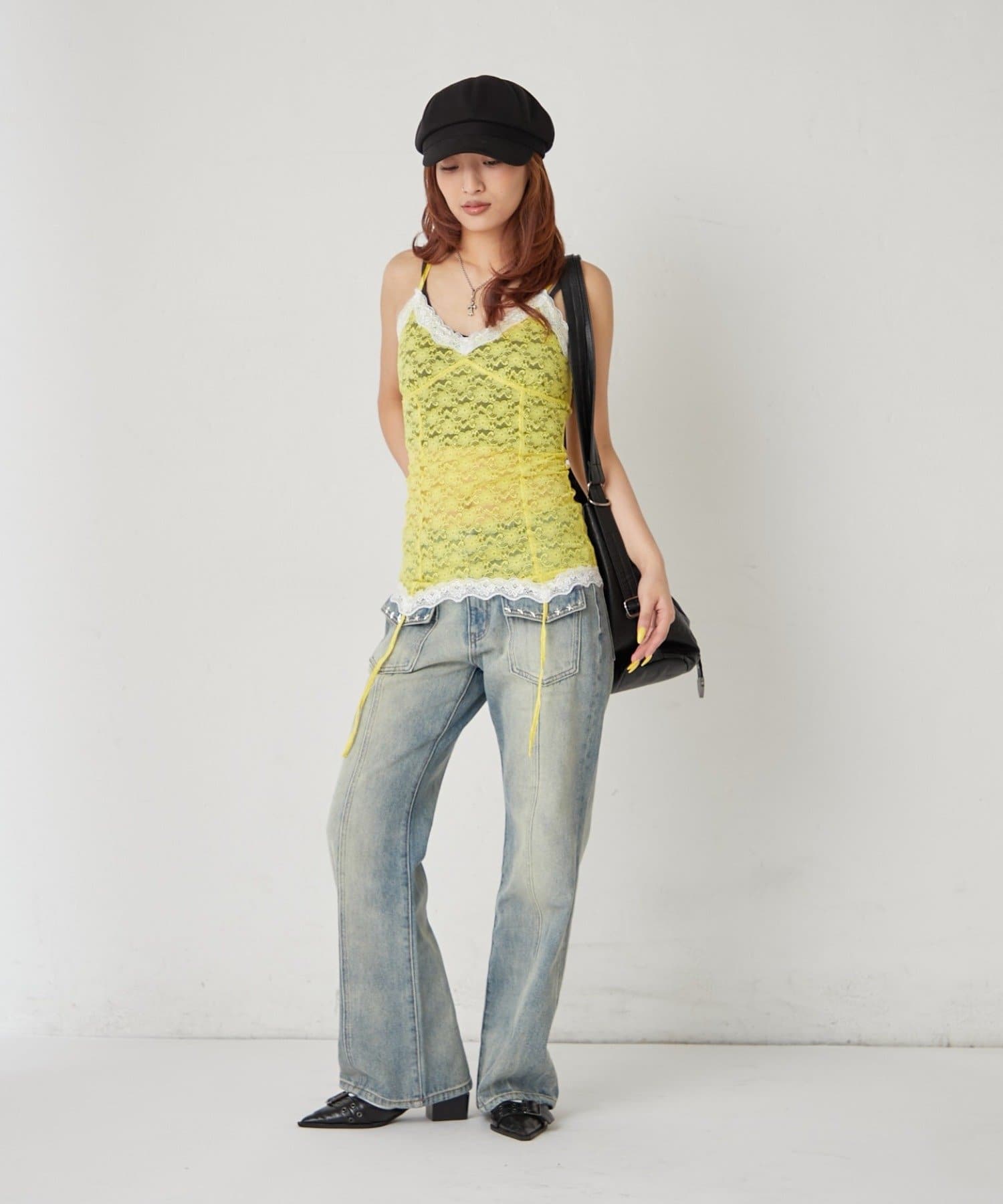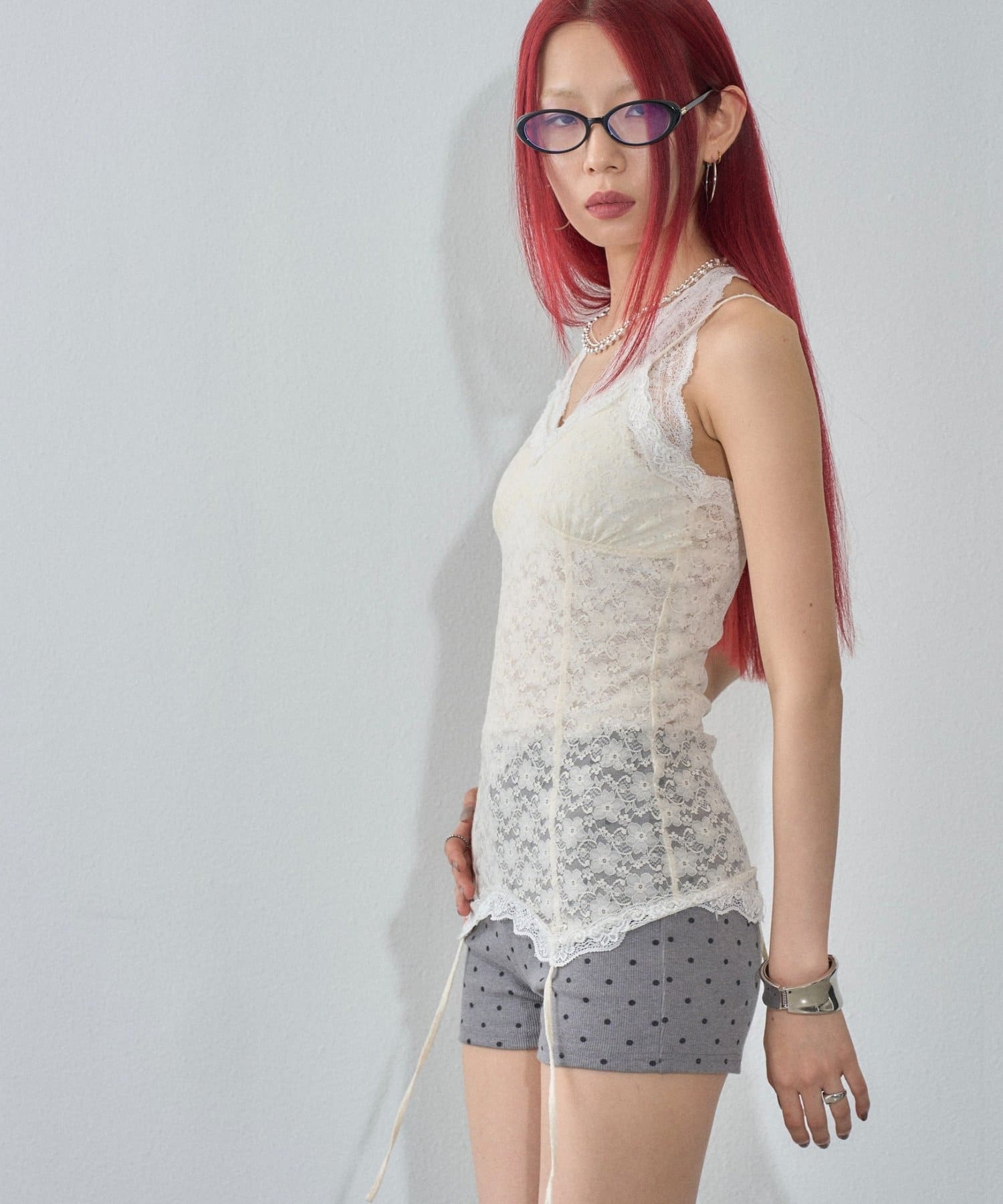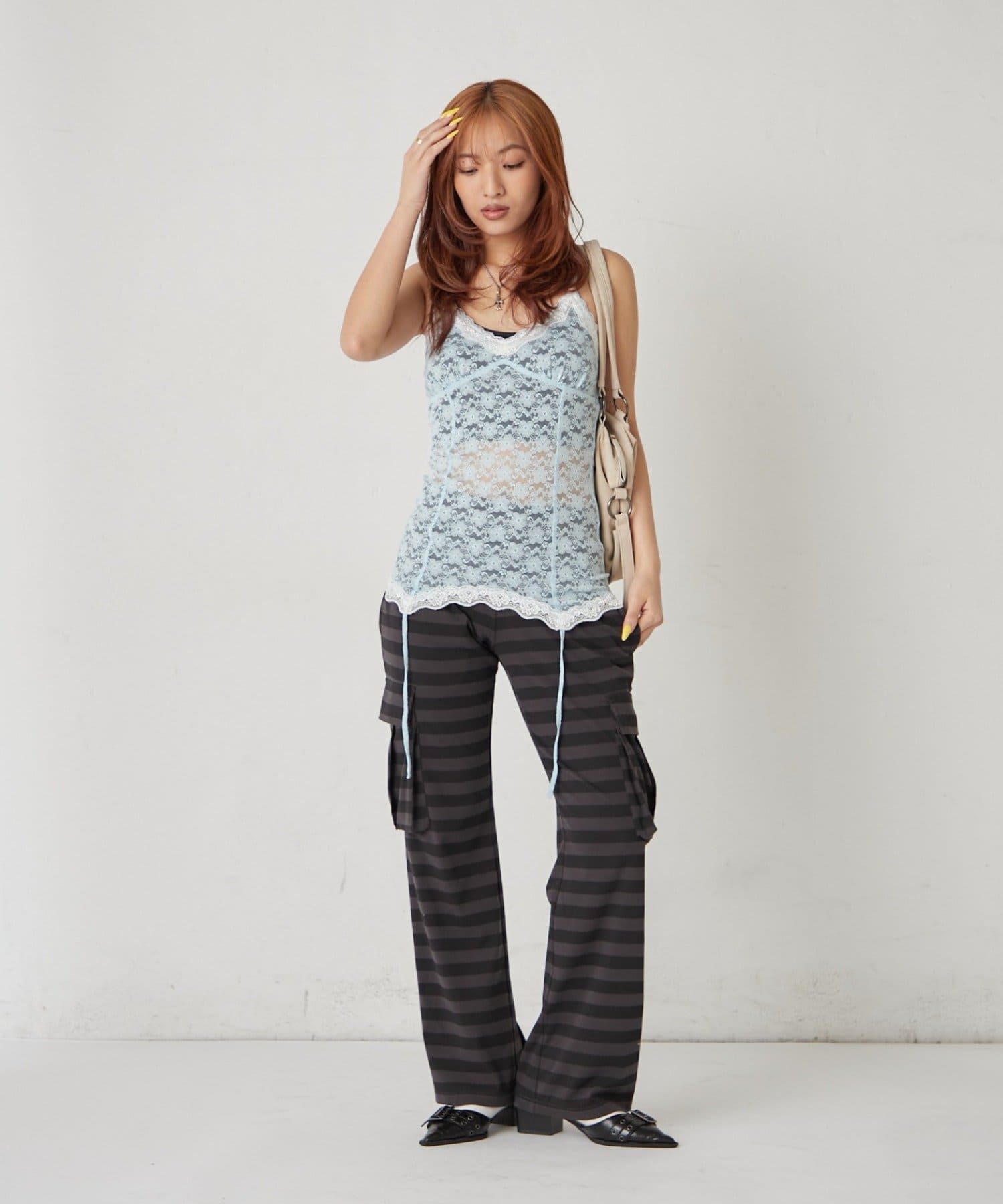 インナーとして着回しできるレースガーターキャミ