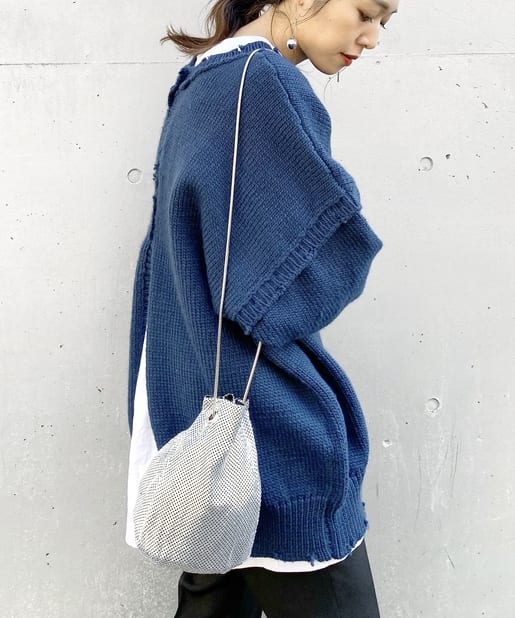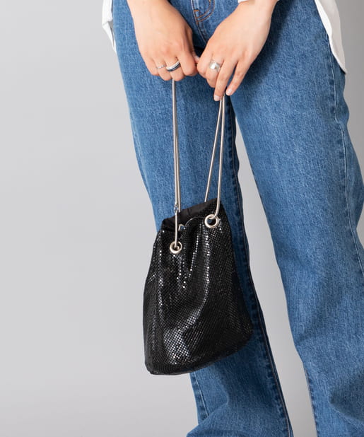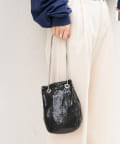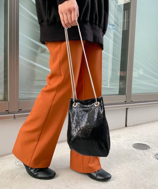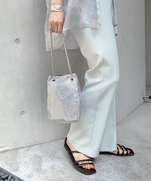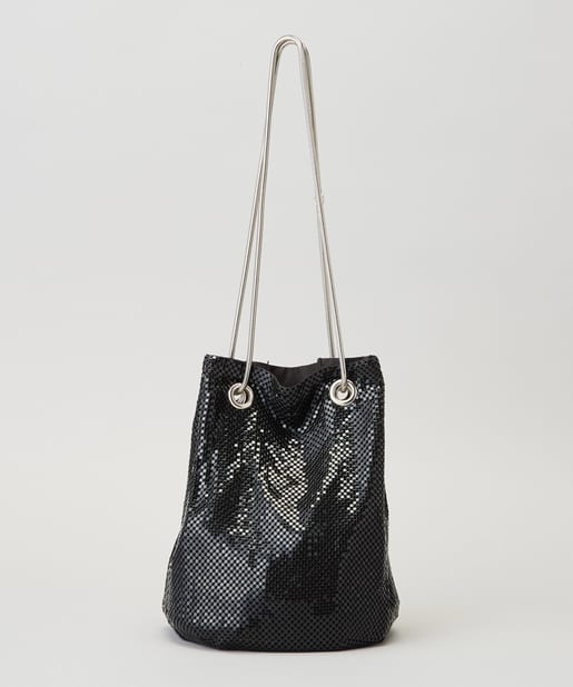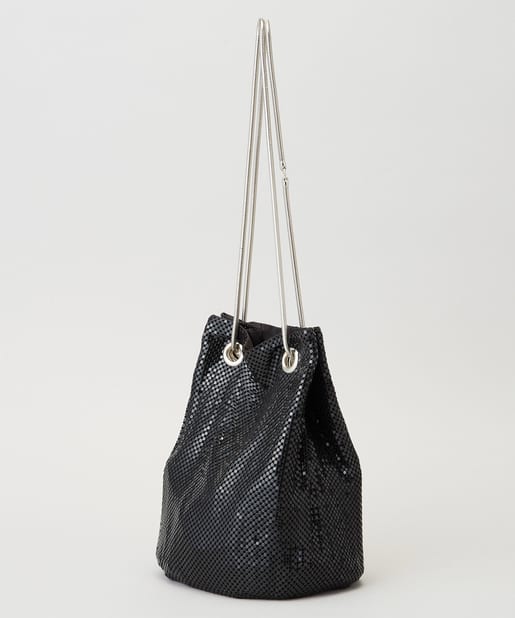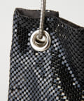 メタリックなビーズが連なったような素材で覆われており、動くたびにキラキラと輝く存在感抜群のバッグ。