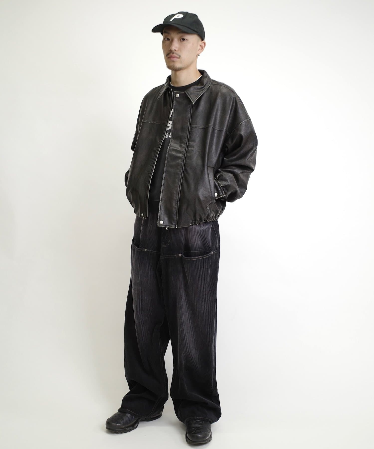 ワイドなシルエットなので、ジャストサイズでスタイルアップに。