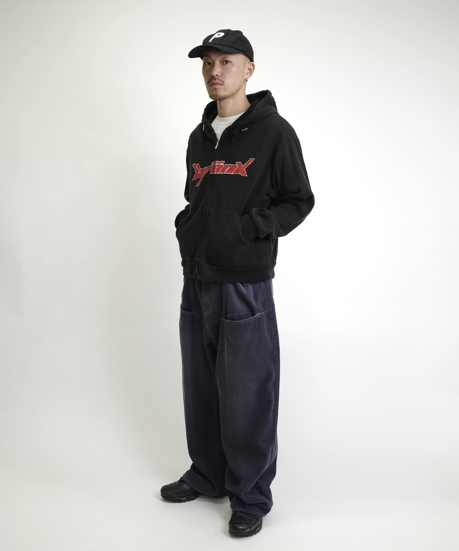 人気のジップパーカーで、少し肌見せすると今年らしく着こなせます。