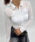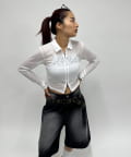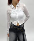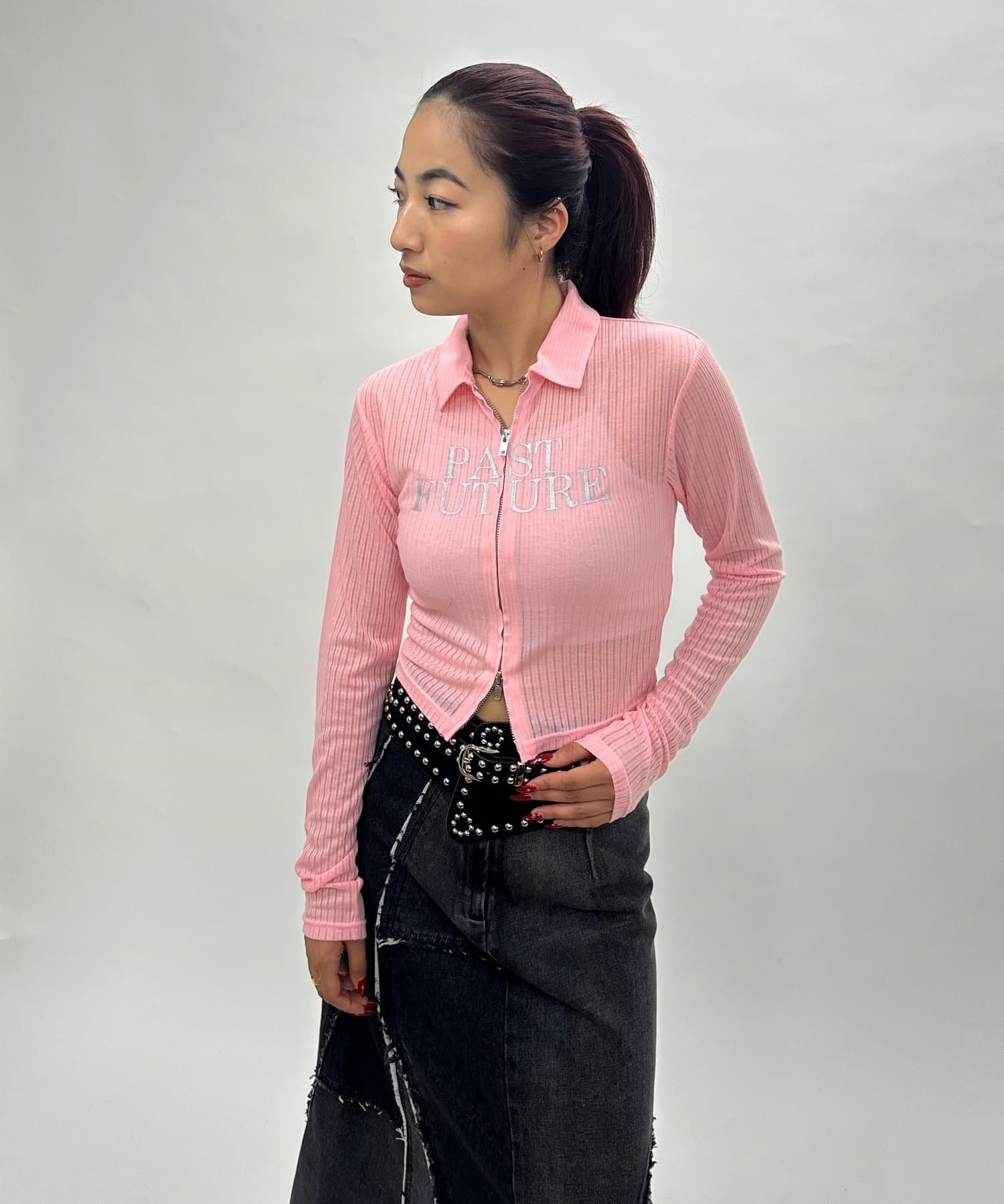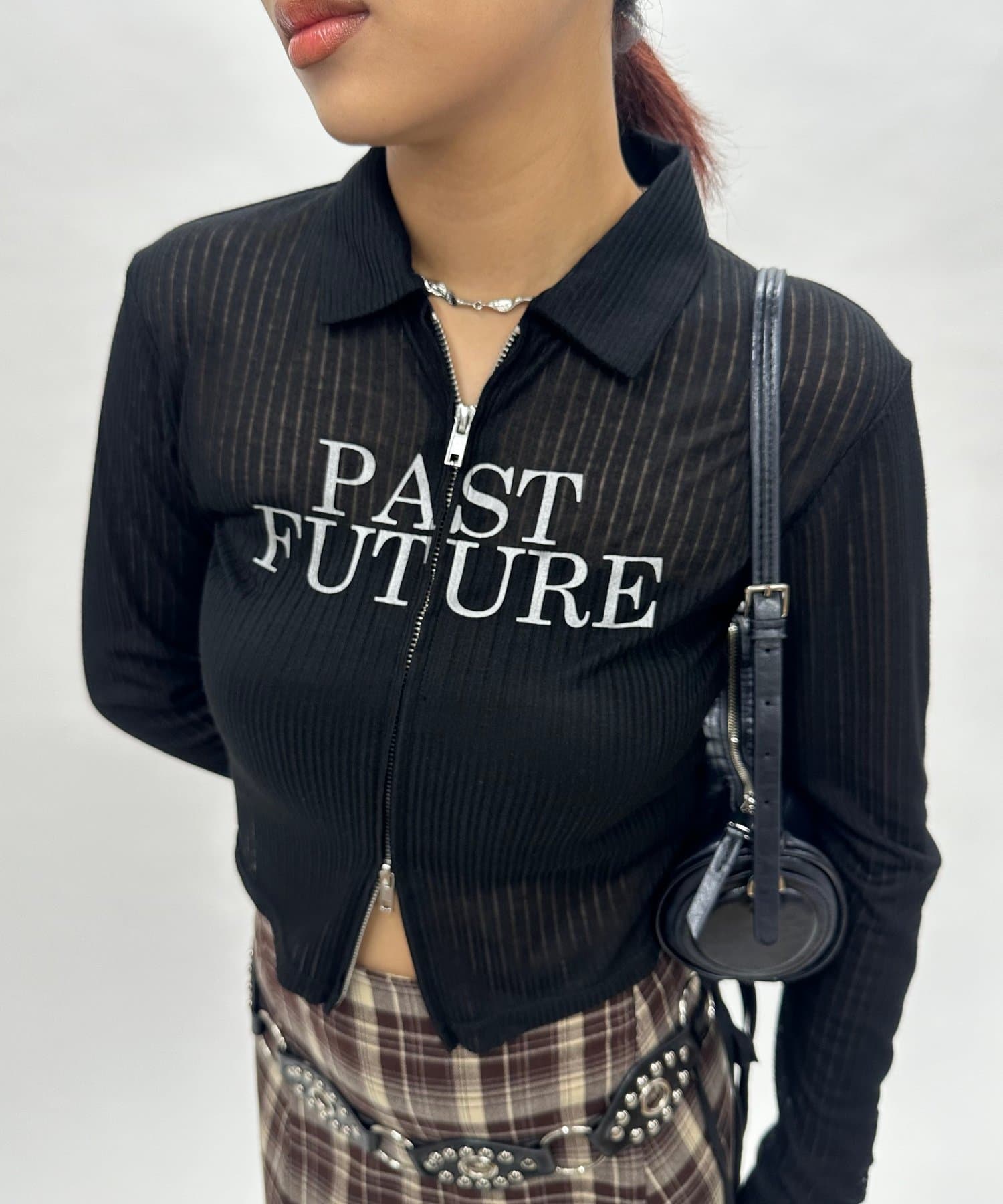 ・透け感のある素材で、フロントの"PAST FUTURE"のロゴがポイント。