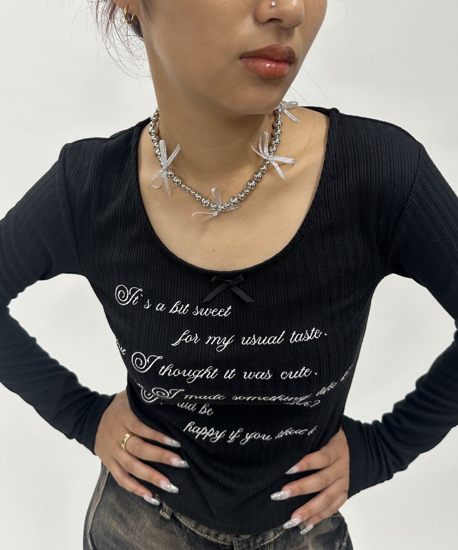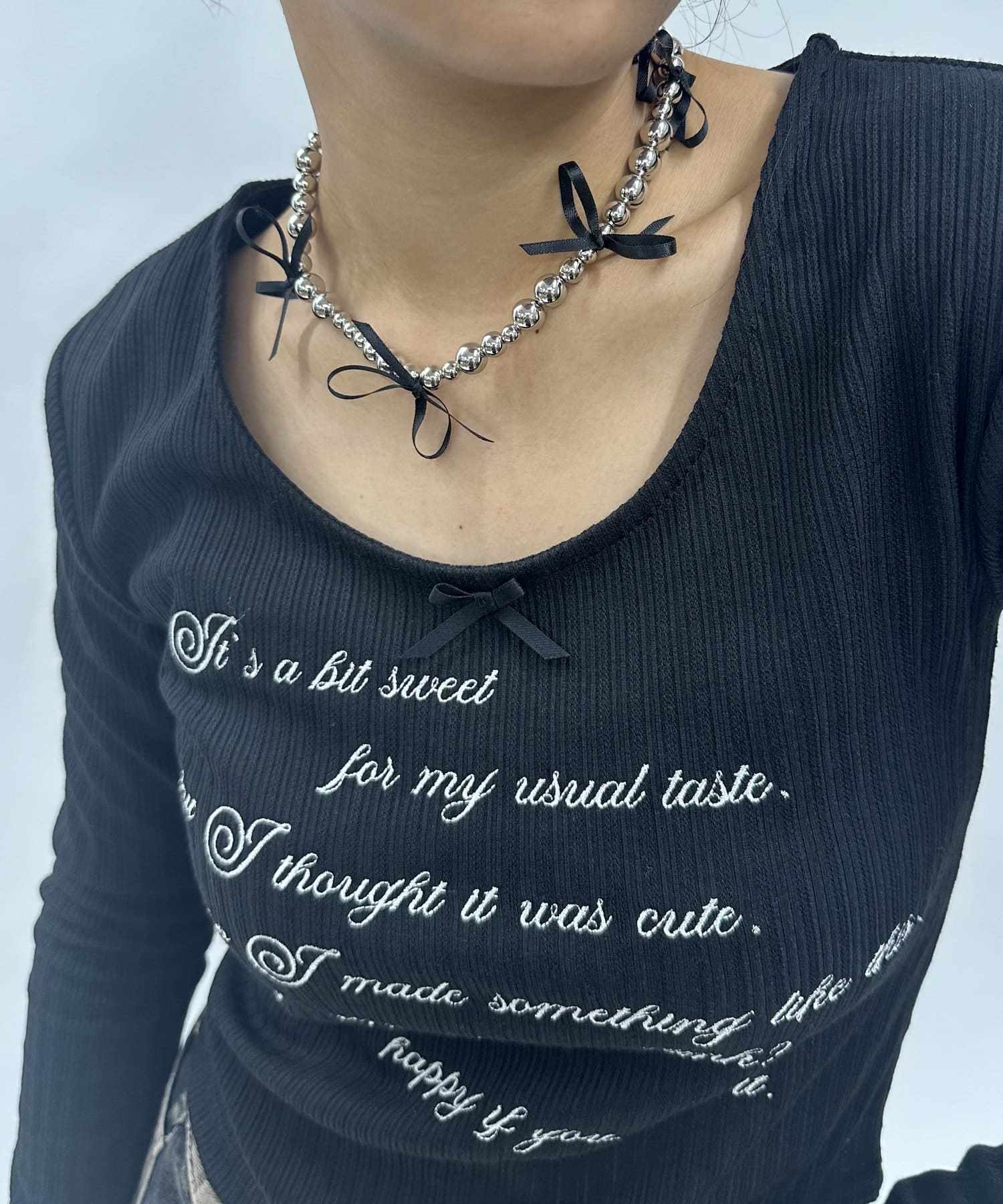 ・沢山のリボンが施されている、ボールチェーンのネックレス。