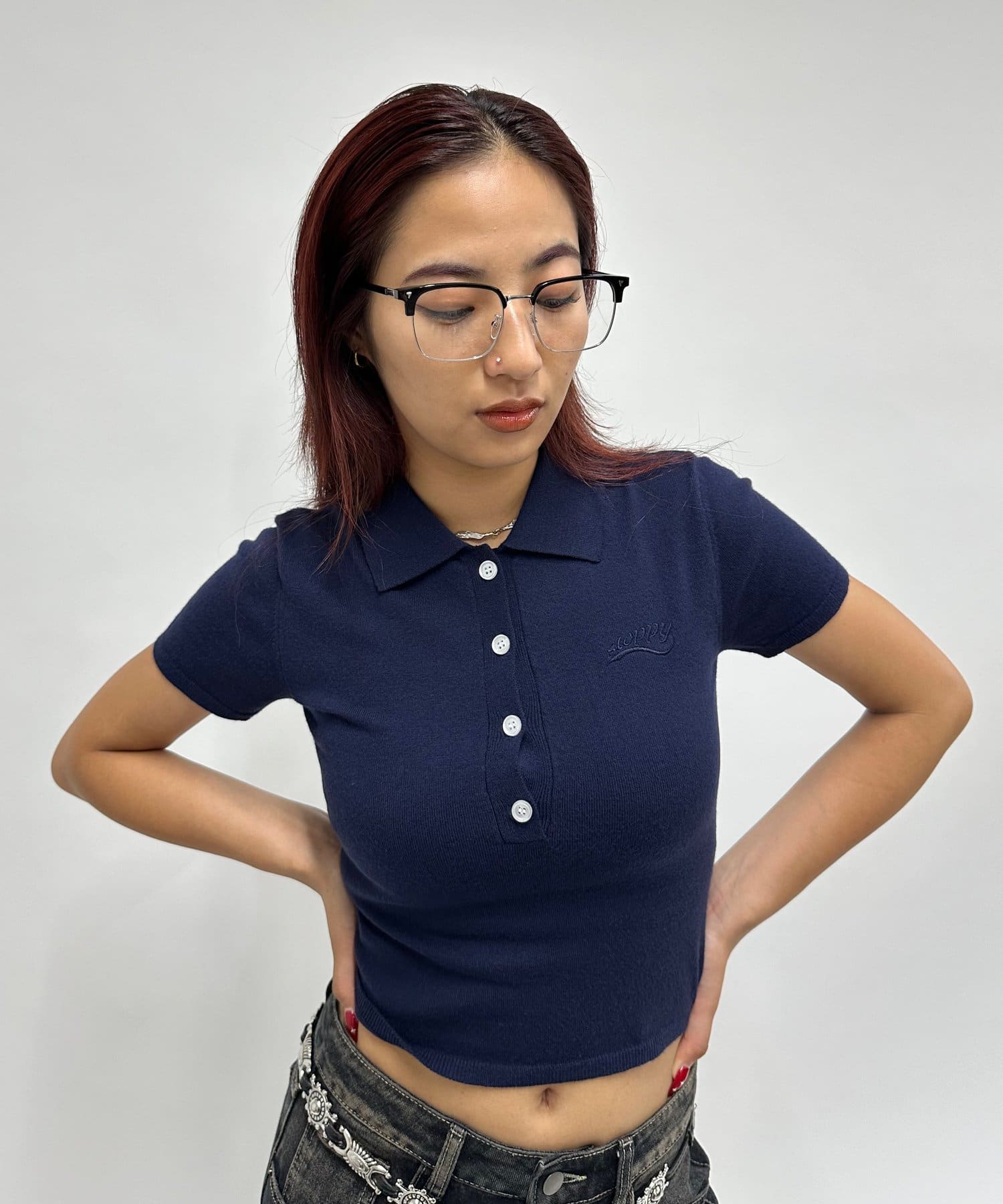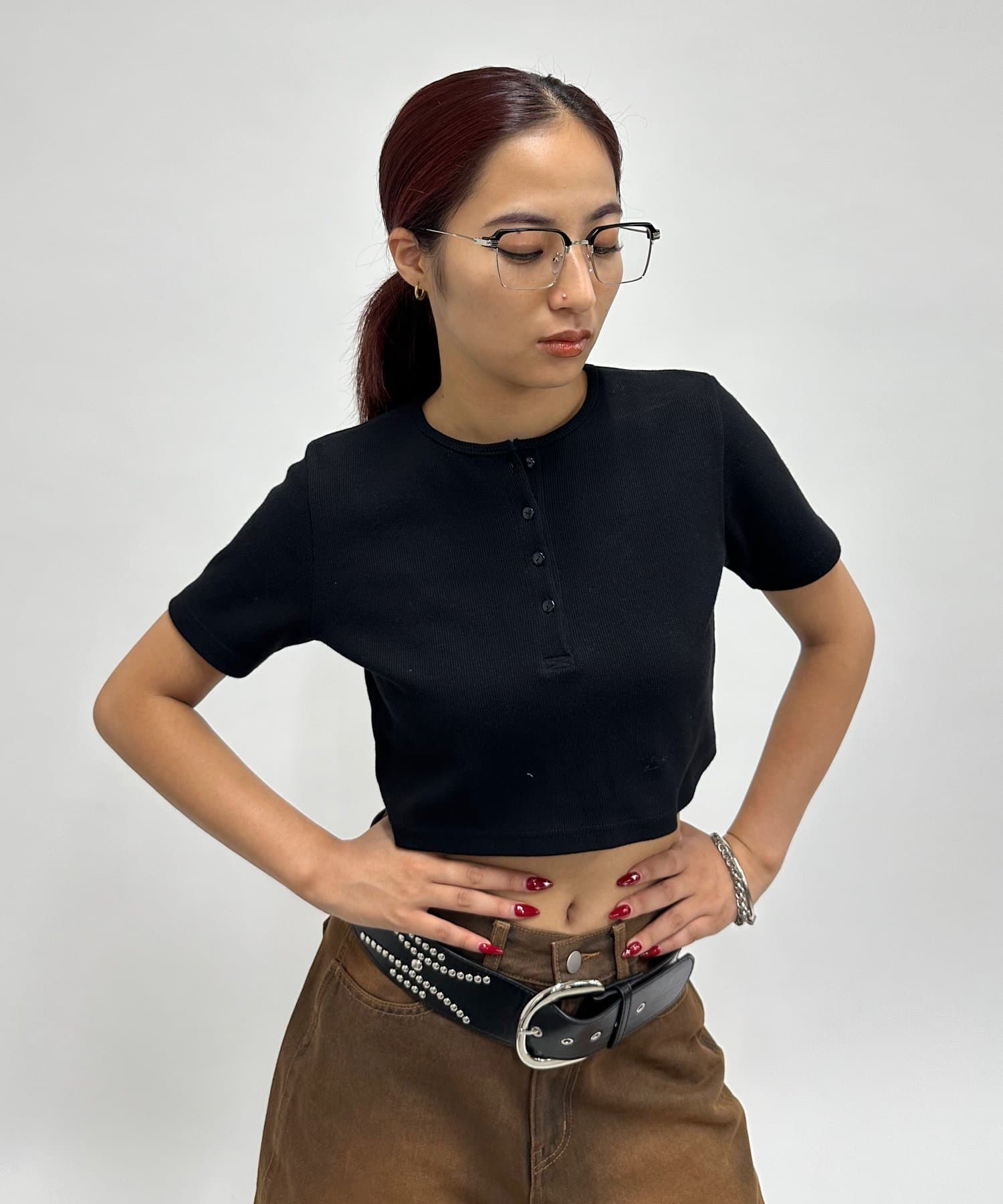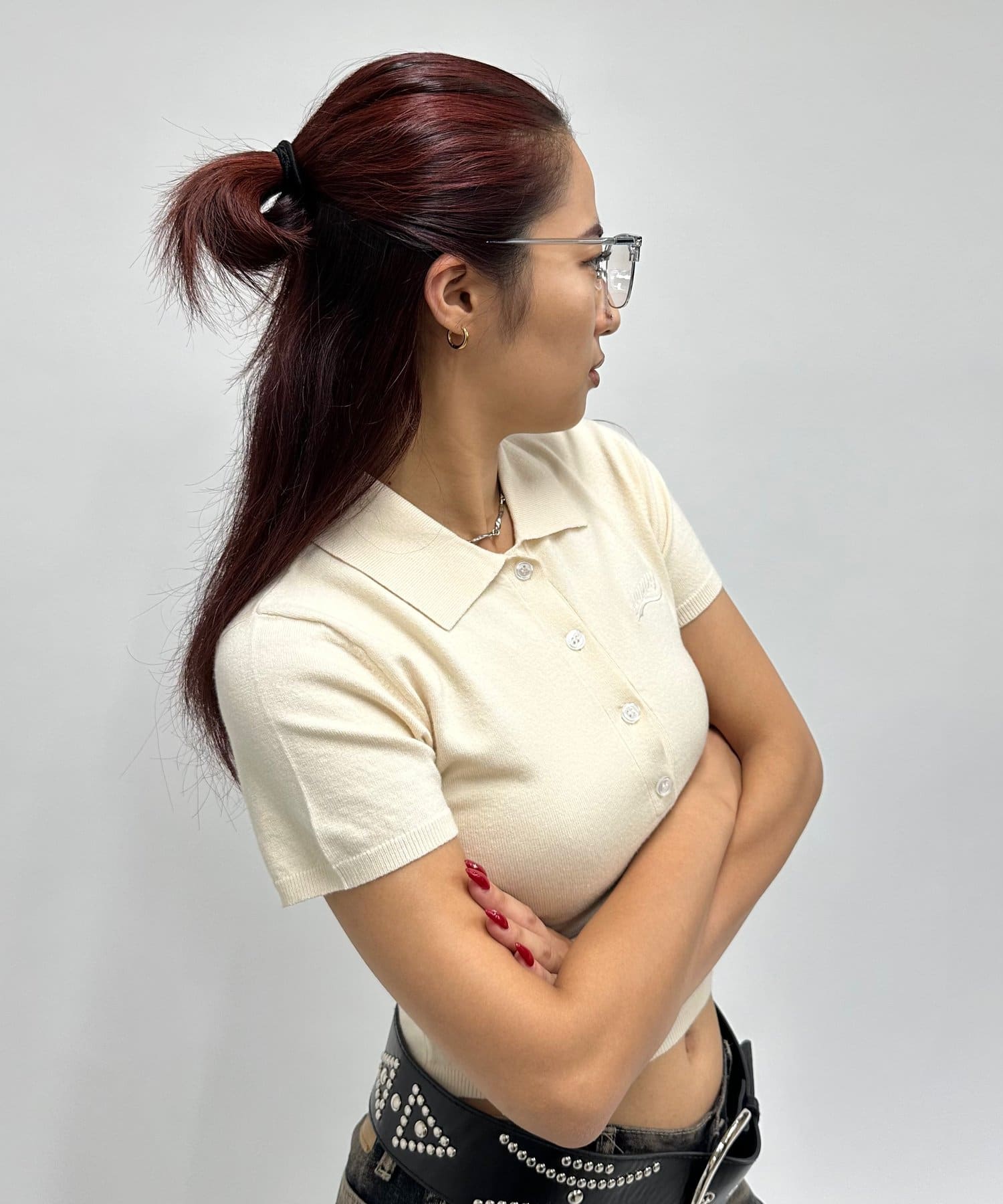 ・大き目のフレームがいつものコーディネートにアクセントに。