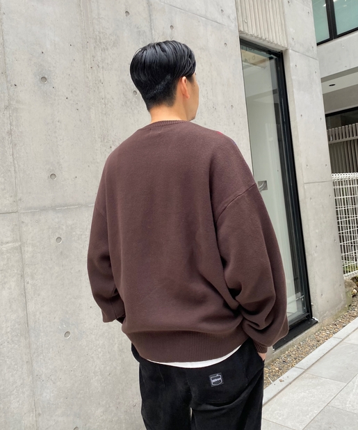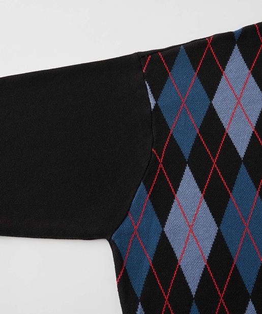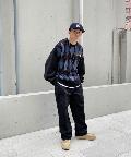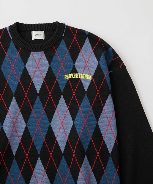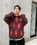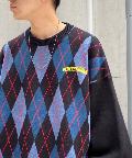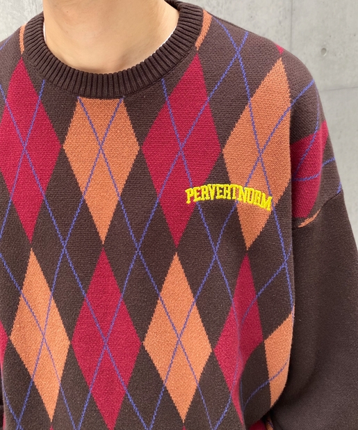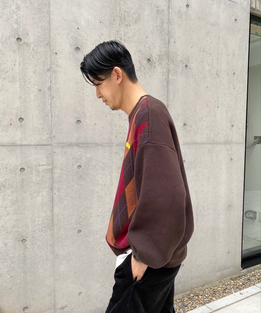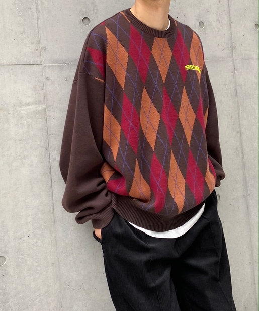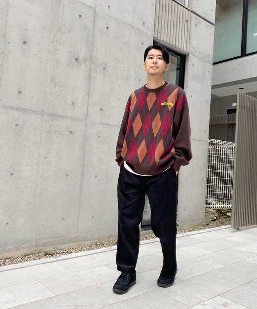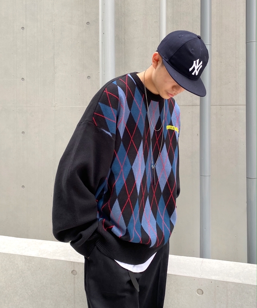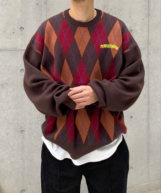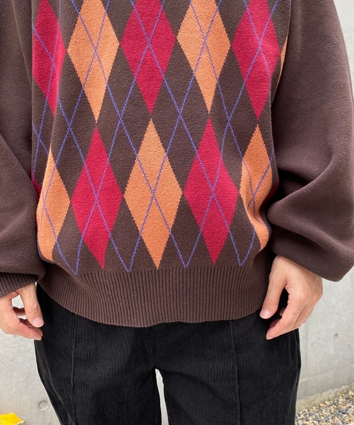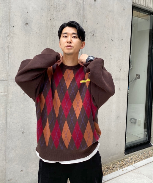 ・ボックス型シルエットでゆったりとストリートテイストでありながら、アーガイル柄の知的な雰囲気をハズしでプラス。