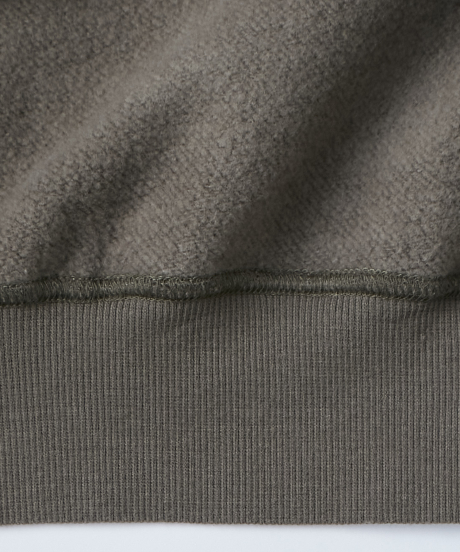 ・がっしりしたヘビーウェイトの生地感。首回りのリブもタフで丈夫です。